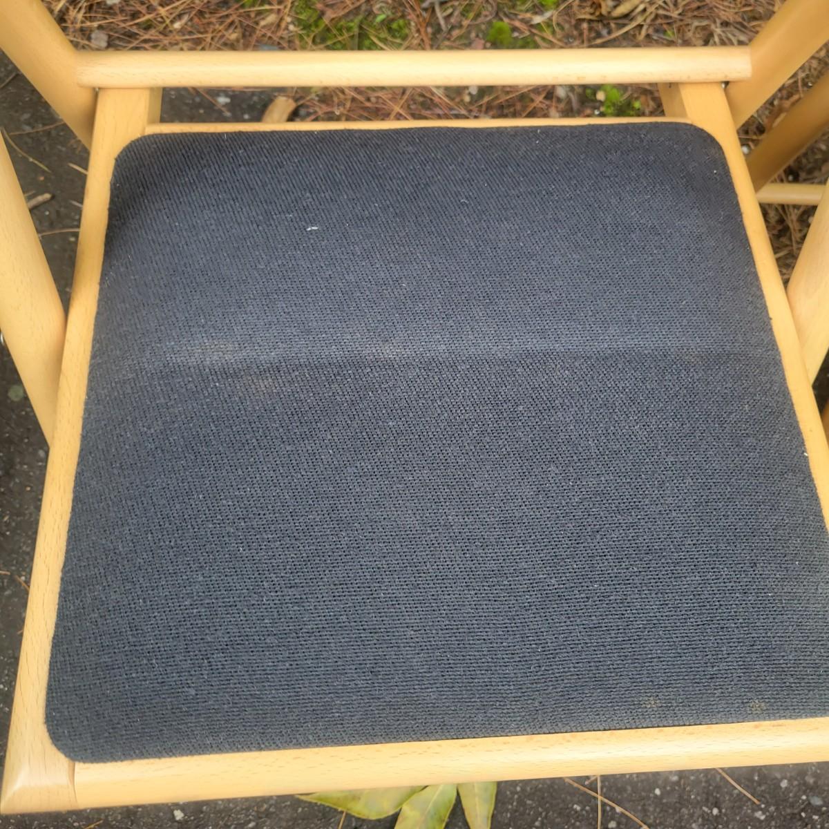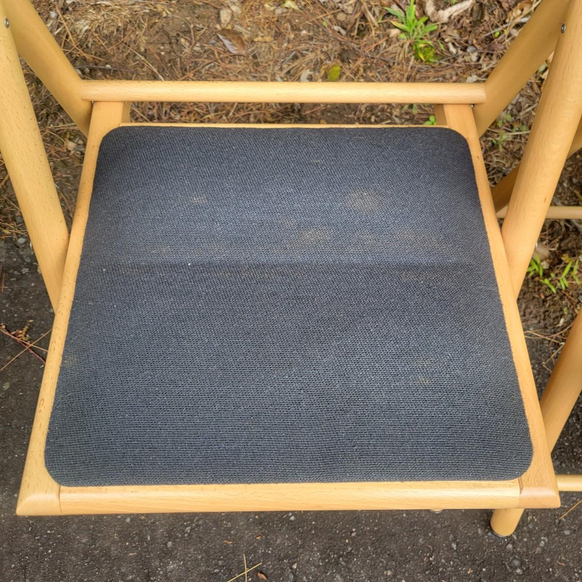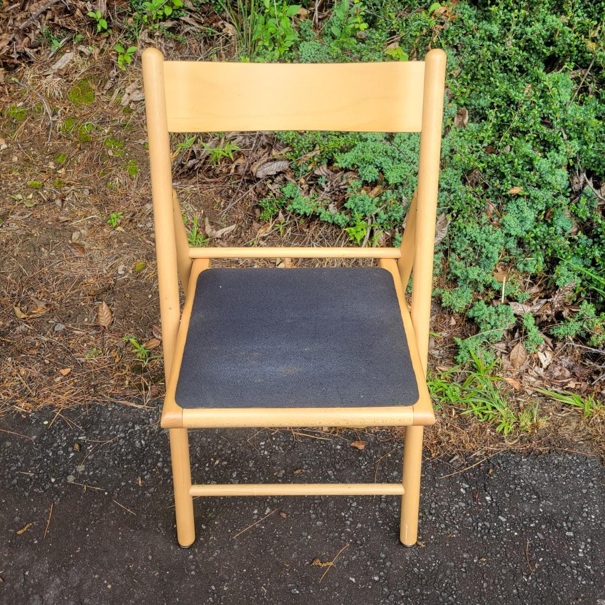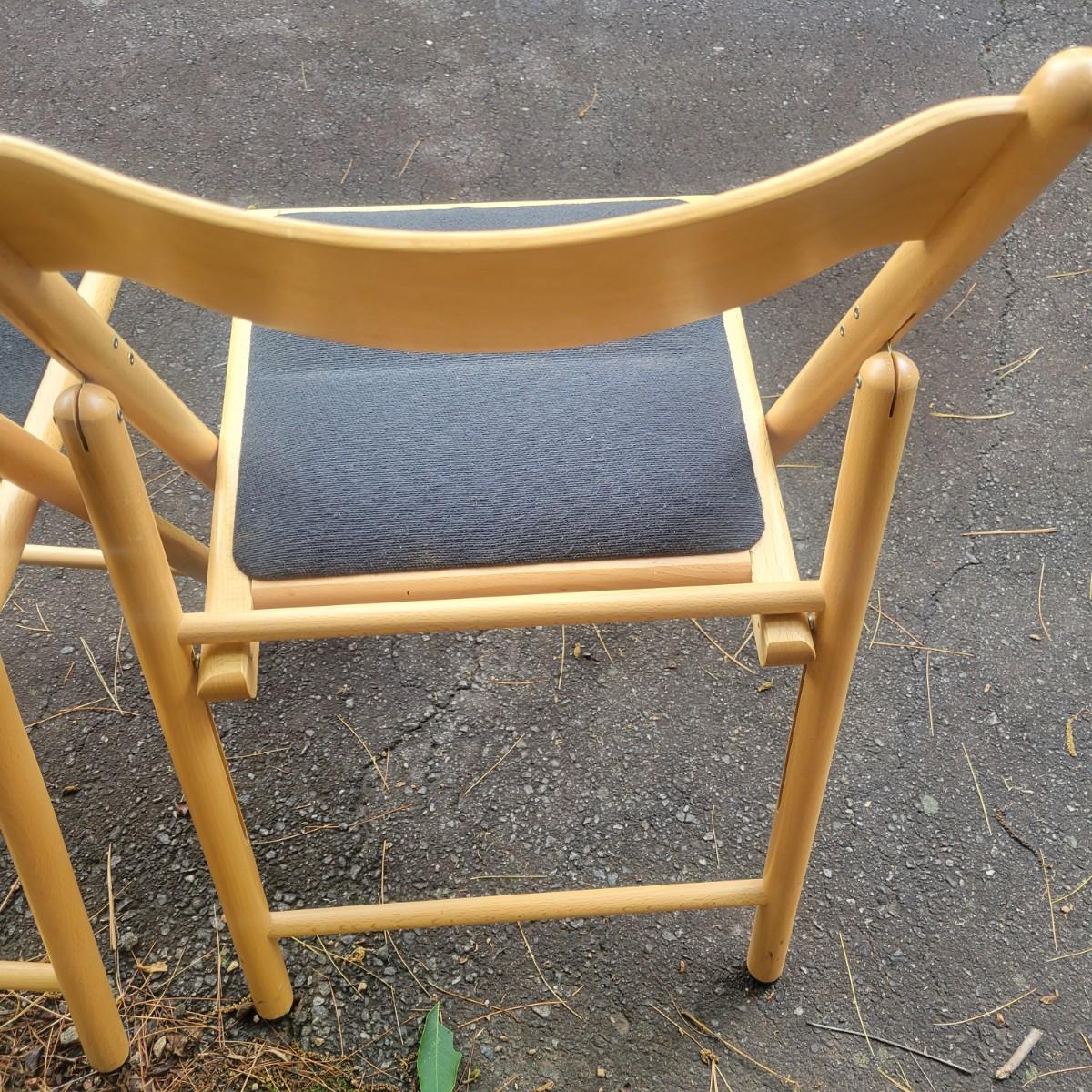 A set of four folding wooden chairs that have black fabric seat cushions. Each chair measures approximately 18" x 22" x 31.5"H with a seat height of 18". Local pickup only