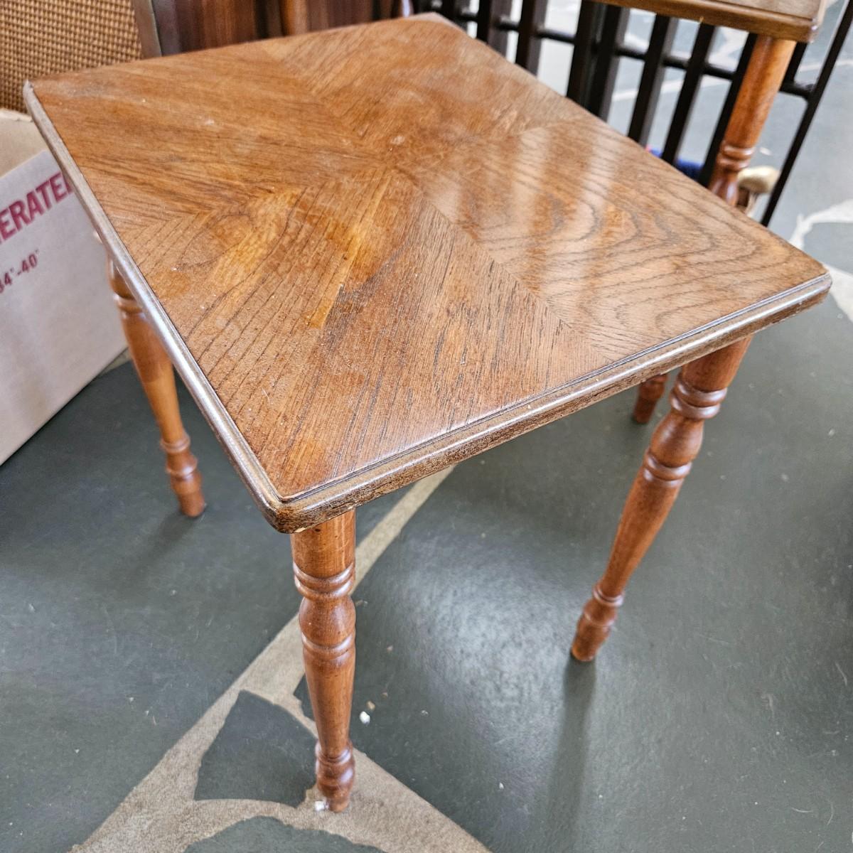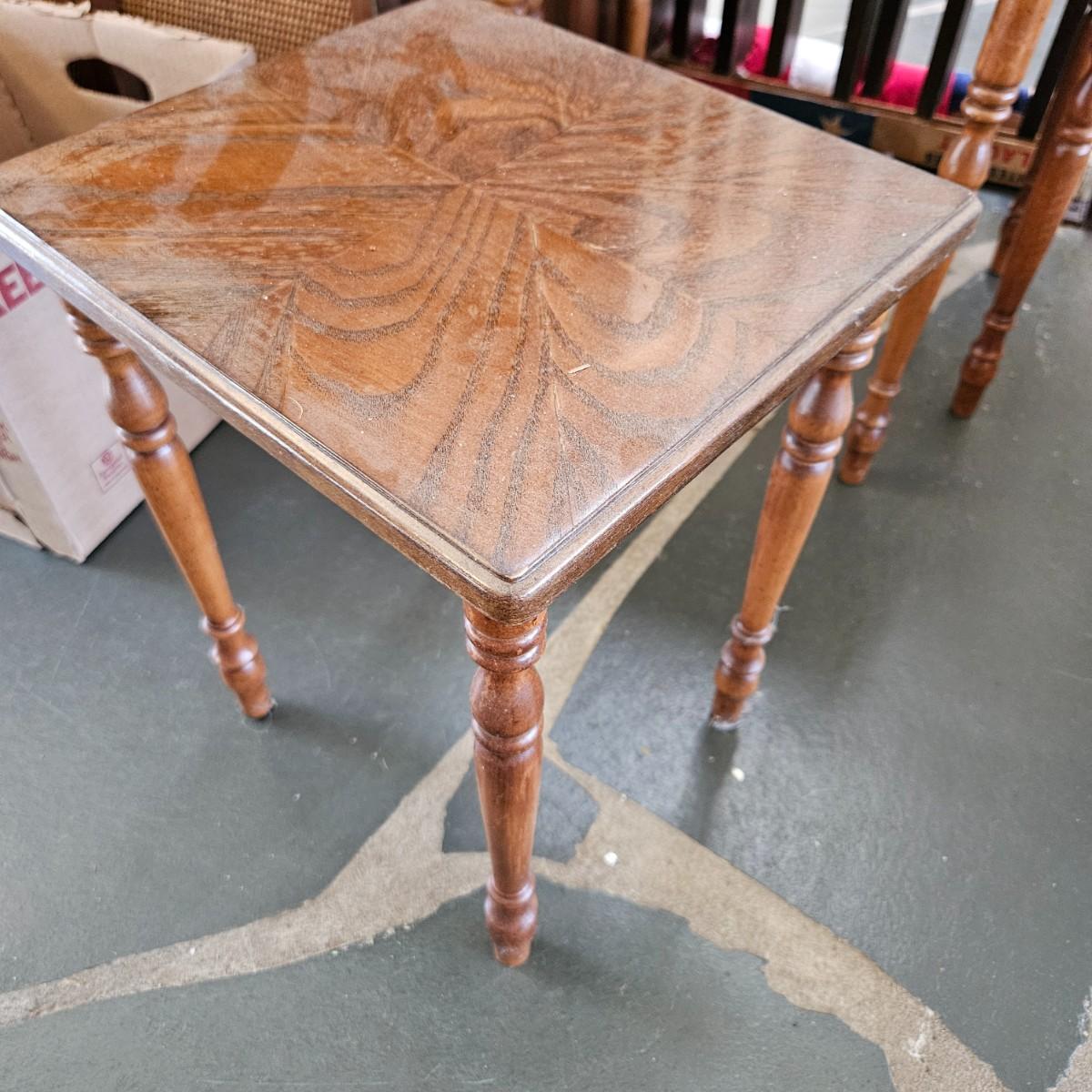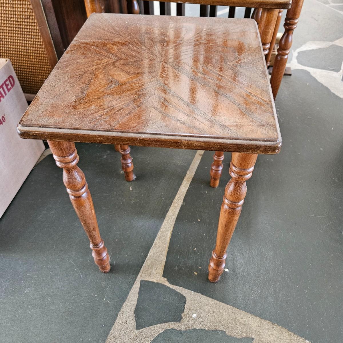 A set of three wooden nesting tables that have a wood veneer on their surface. The largest table measures approximately 19" x 12" x 17.5"H. Local pickup only