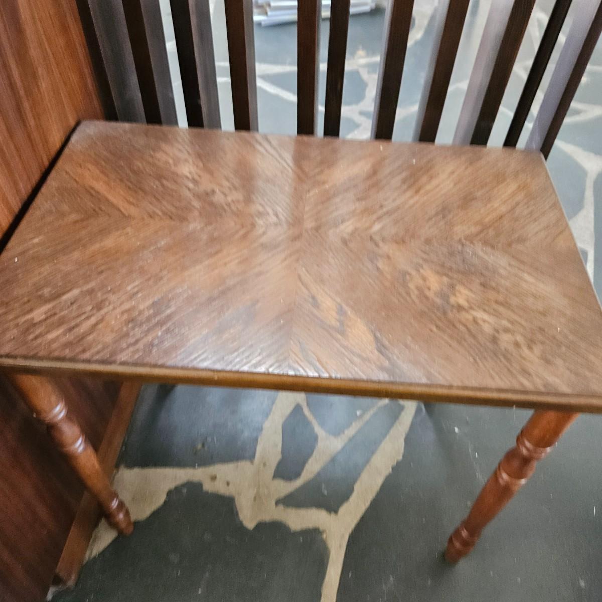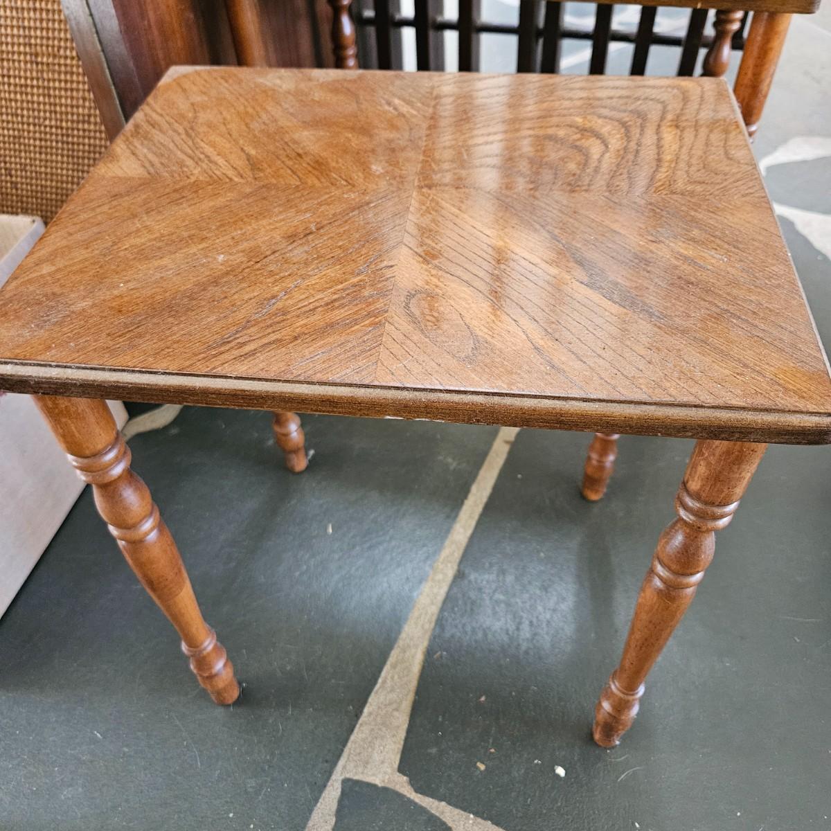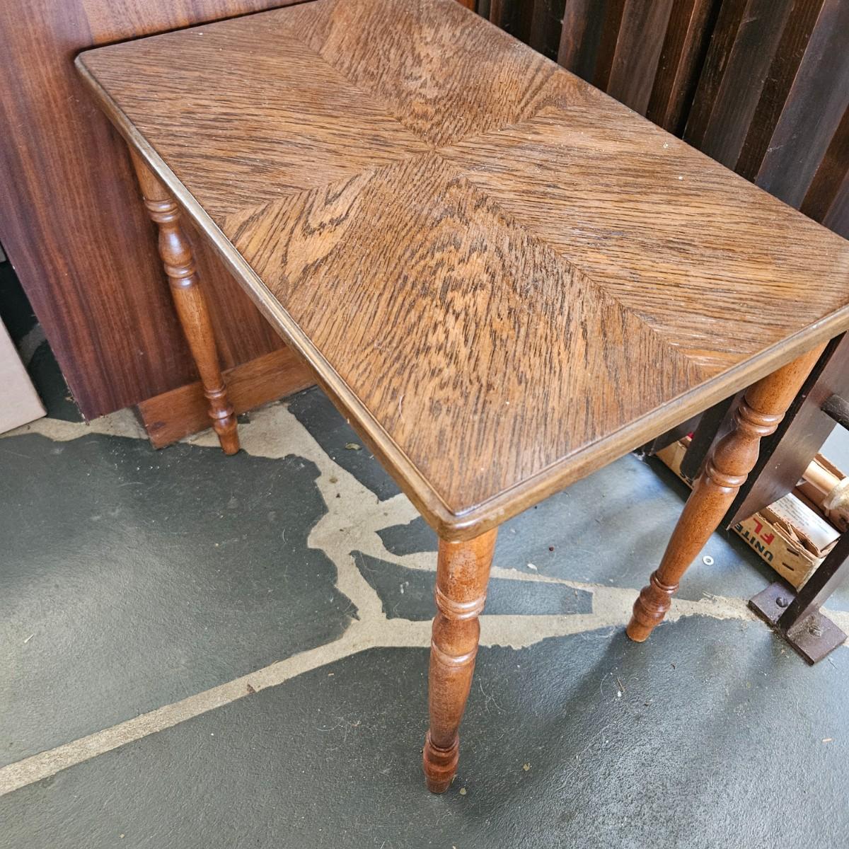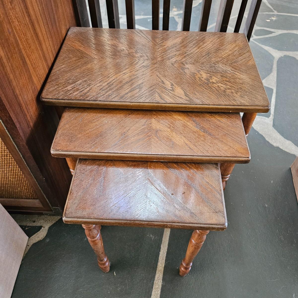 A set of three wooden nesting tables that have a wood veneer on their surface. The largest table measures approximately 19" x 12" x 17.5"H. Local pickup only