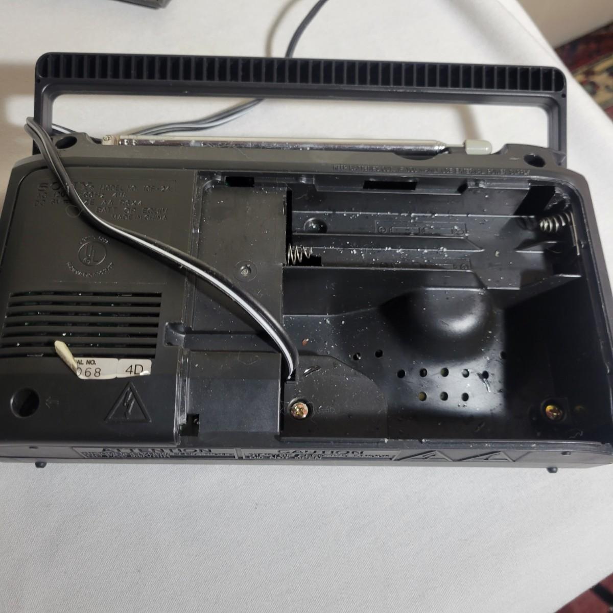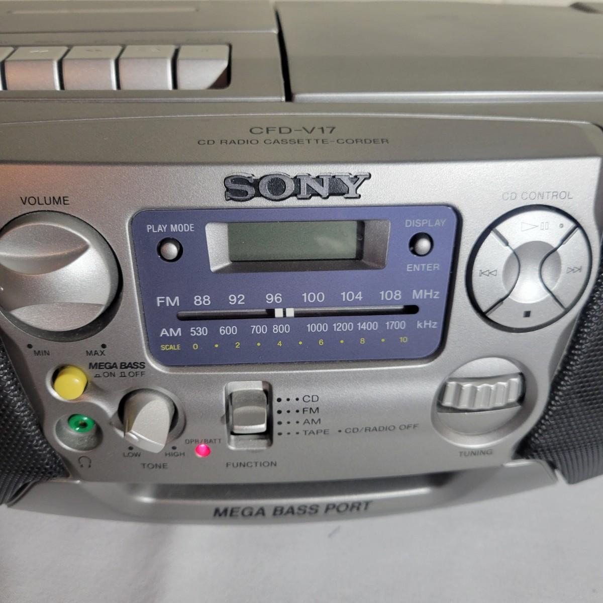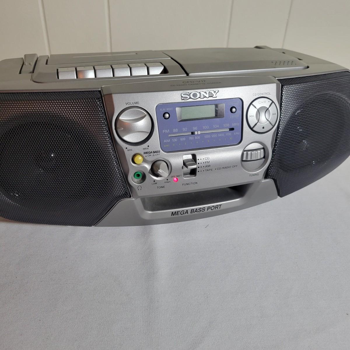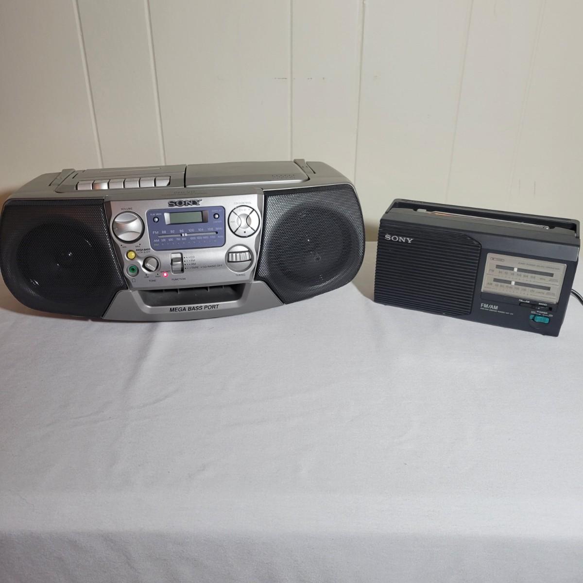 A Sony portable CD/Cassette player and portable radio in good condition. Both items were tested and work. Includes a Sony CD/cassette player with AM/FM radio, model# CFD-V17. Both ac powered and D batteries with a mega bass port. Also includes a Sony am/fm radio that is also ac and battery powered, model# 96068 4D. Larger radio measures approximately 16" x 10" x 6". Local pick up only