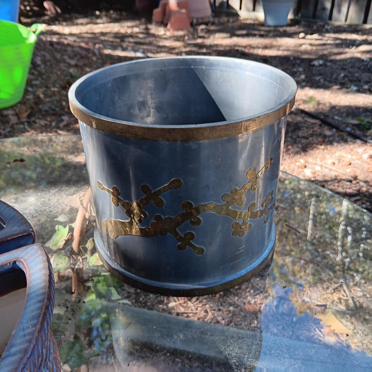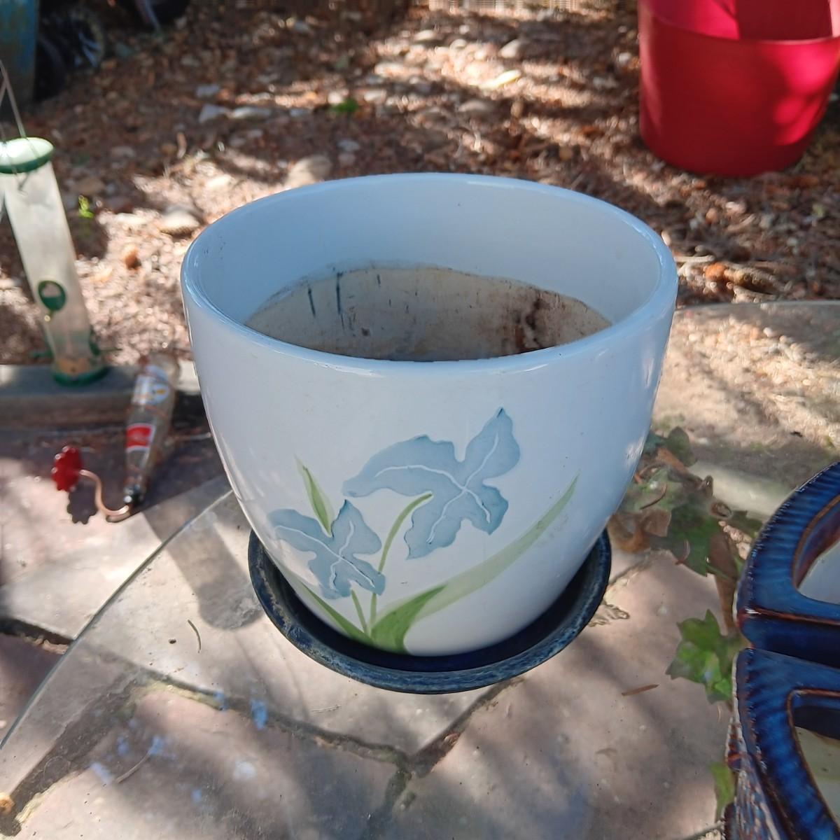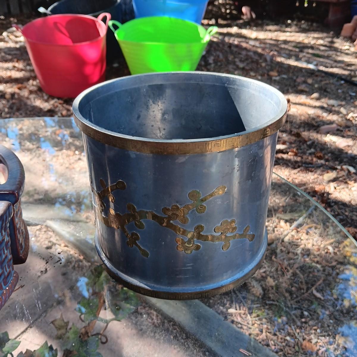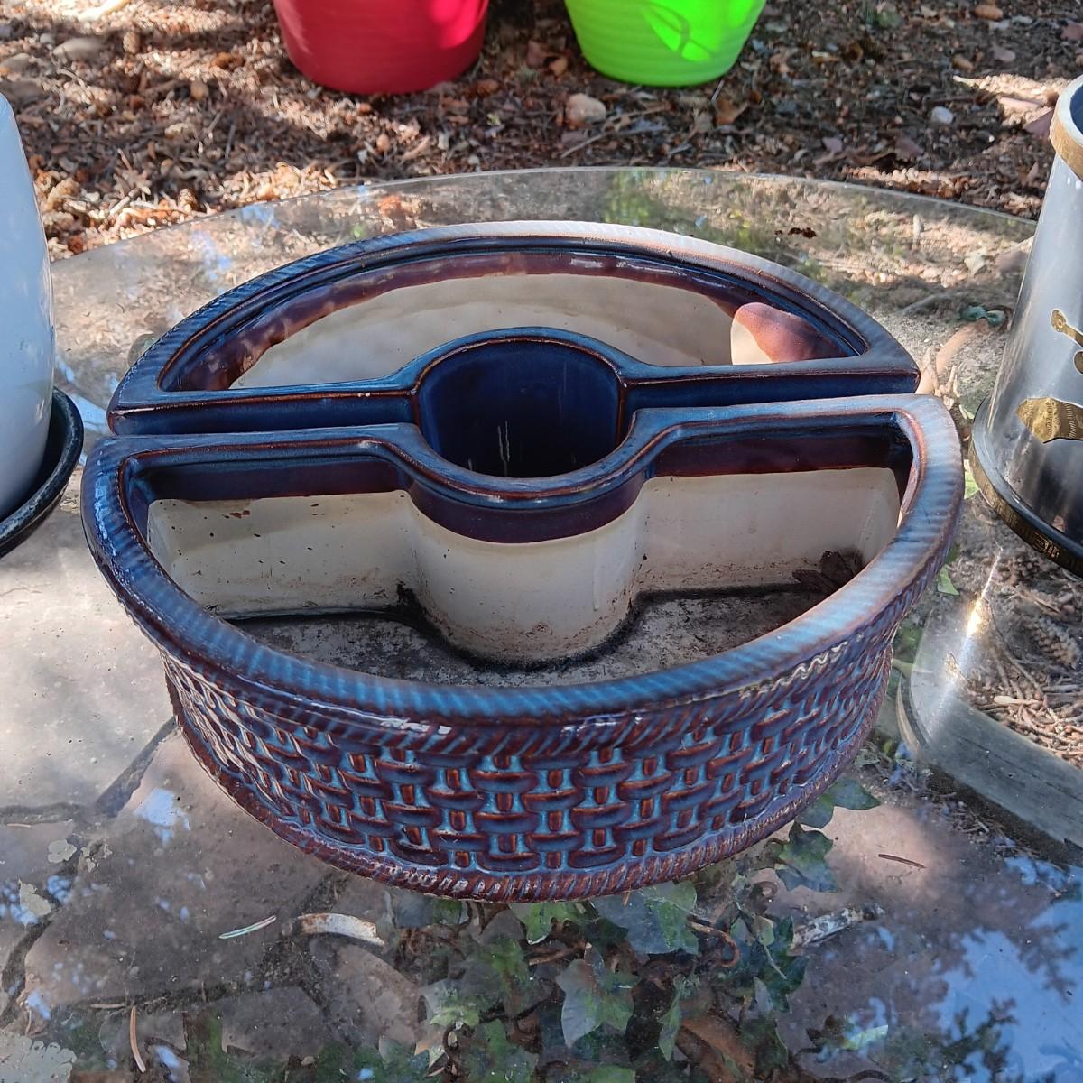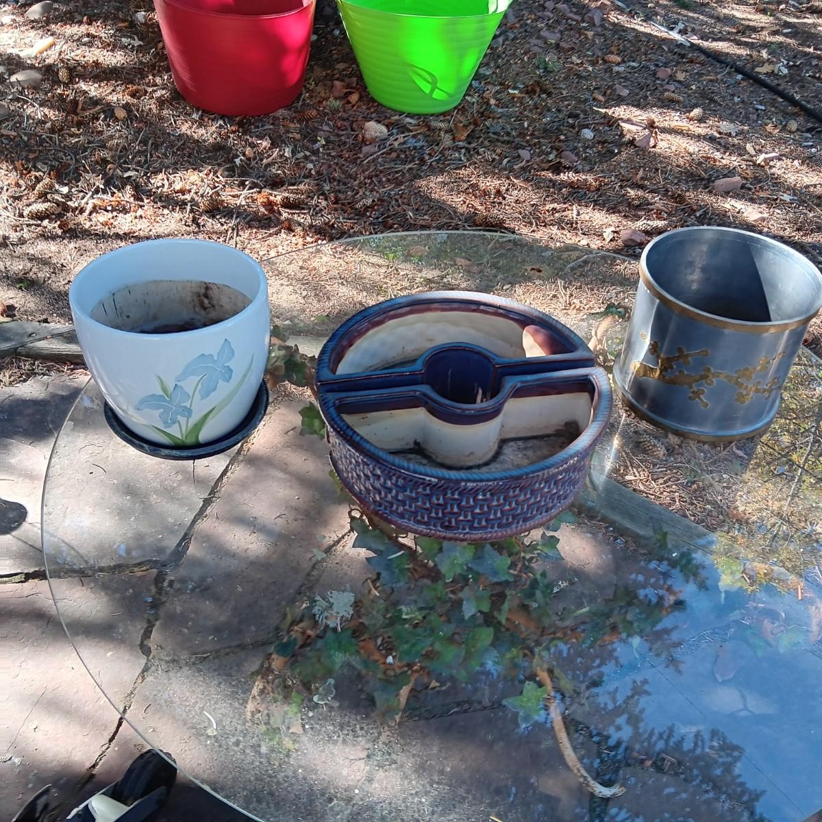 A STEEL PLANTER, 2 PIECE CLAY AND CERAMIC PLANTERS