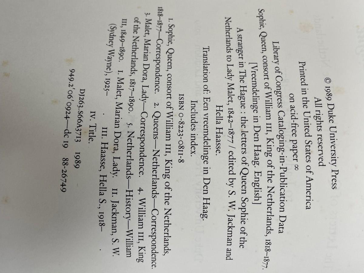 Description: A Stranger in the Hague The Letters of Queen Sophie of the Netherlands 1842-1877 copyright 1989; Material: Paper