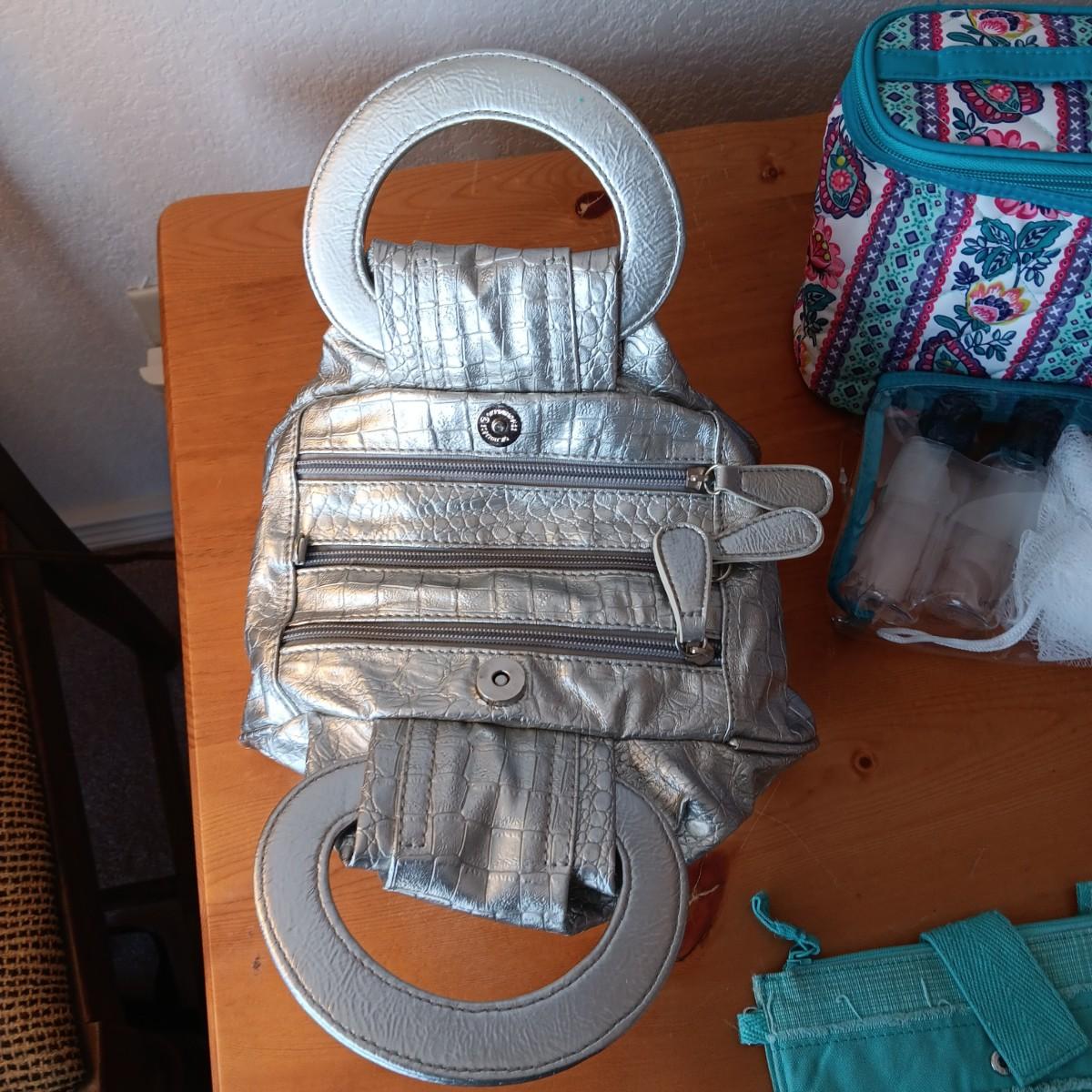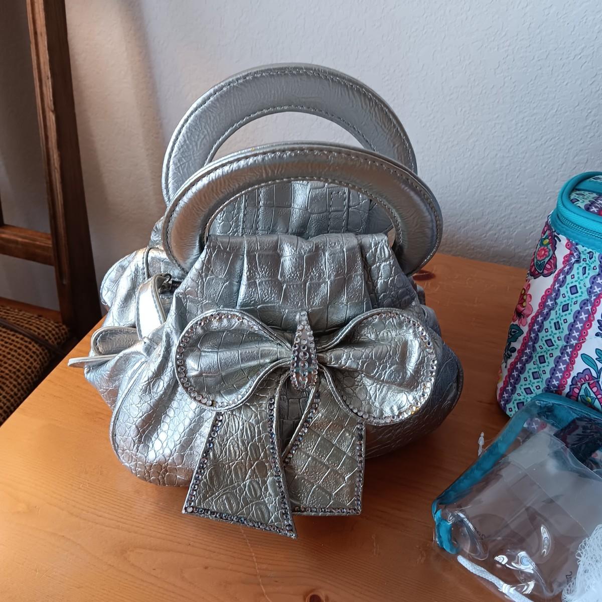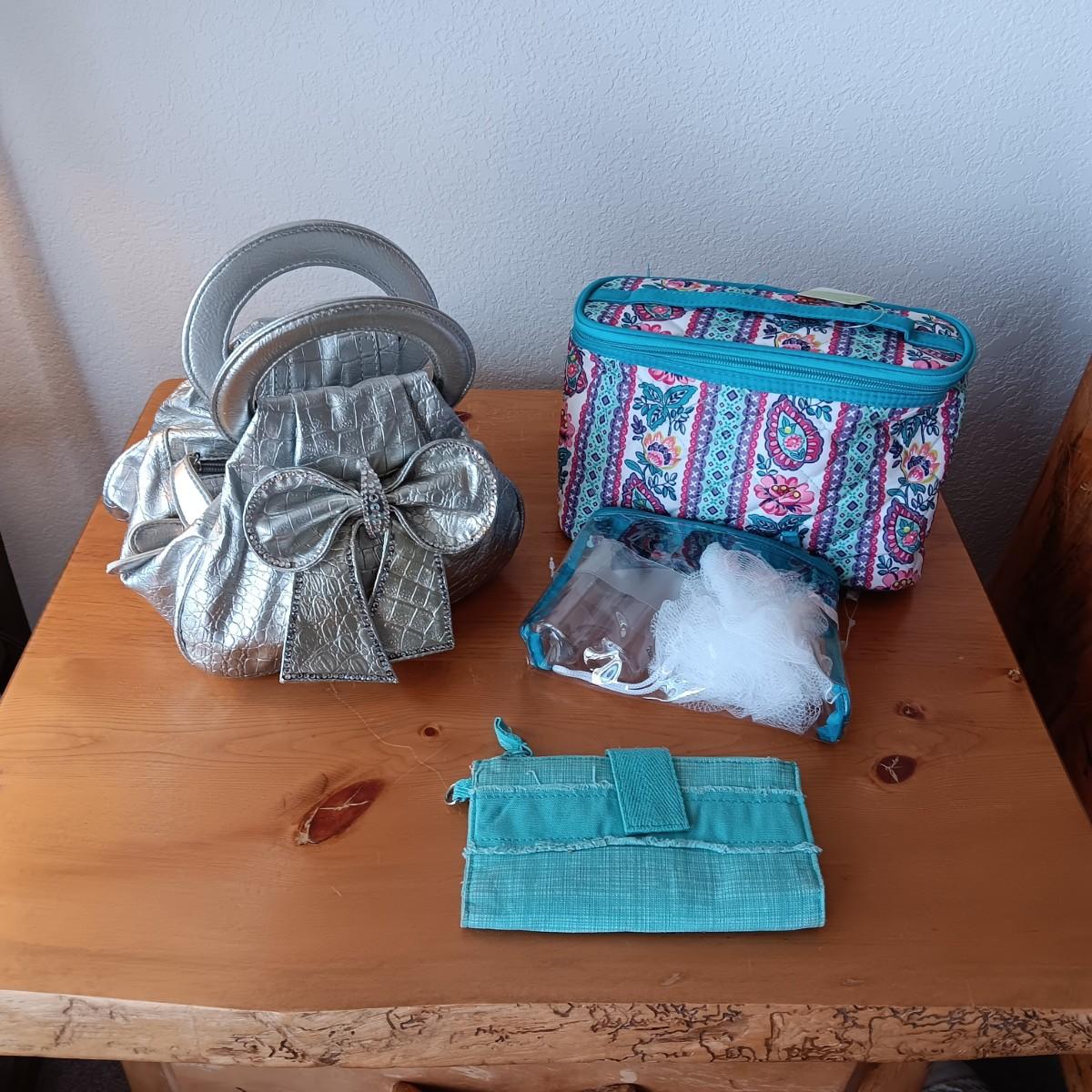 A SWEET SILVER PURSE, CLOTH WALLET AND MAKEUP BAG