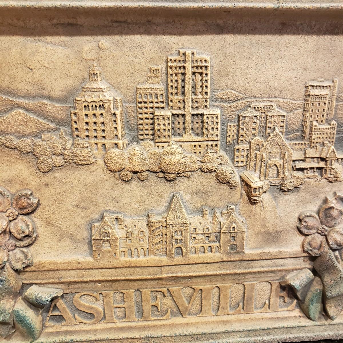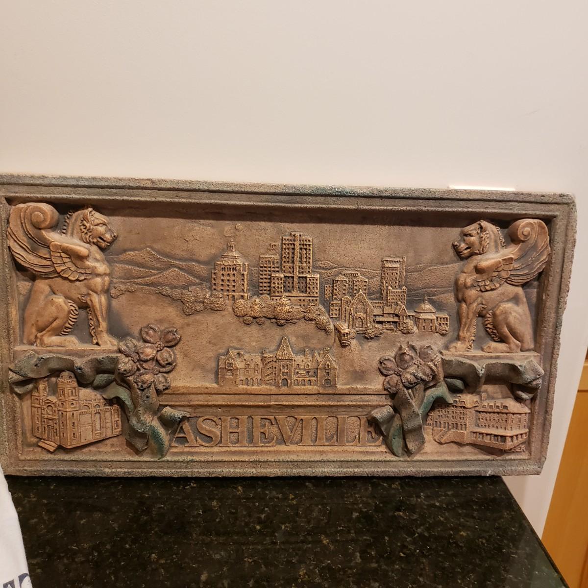 From books about the area, Blue Moon Bakery pottery mugs, pottery plaque and long sleeve jerseys (L) and baseball hats, you too can have a little bit of the area at your house! The cement signed Asheville wall hanging measures 24" x 12". This hanging is heavy.