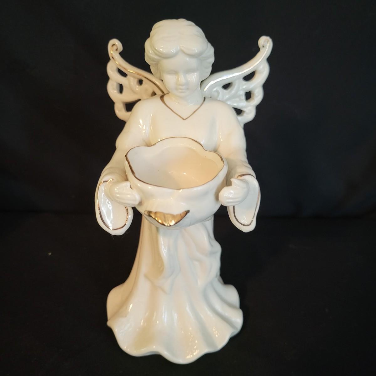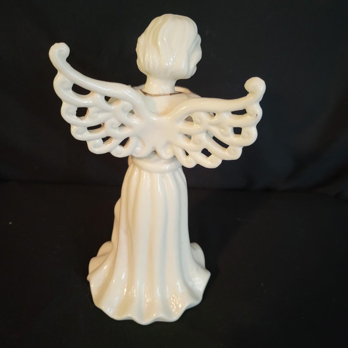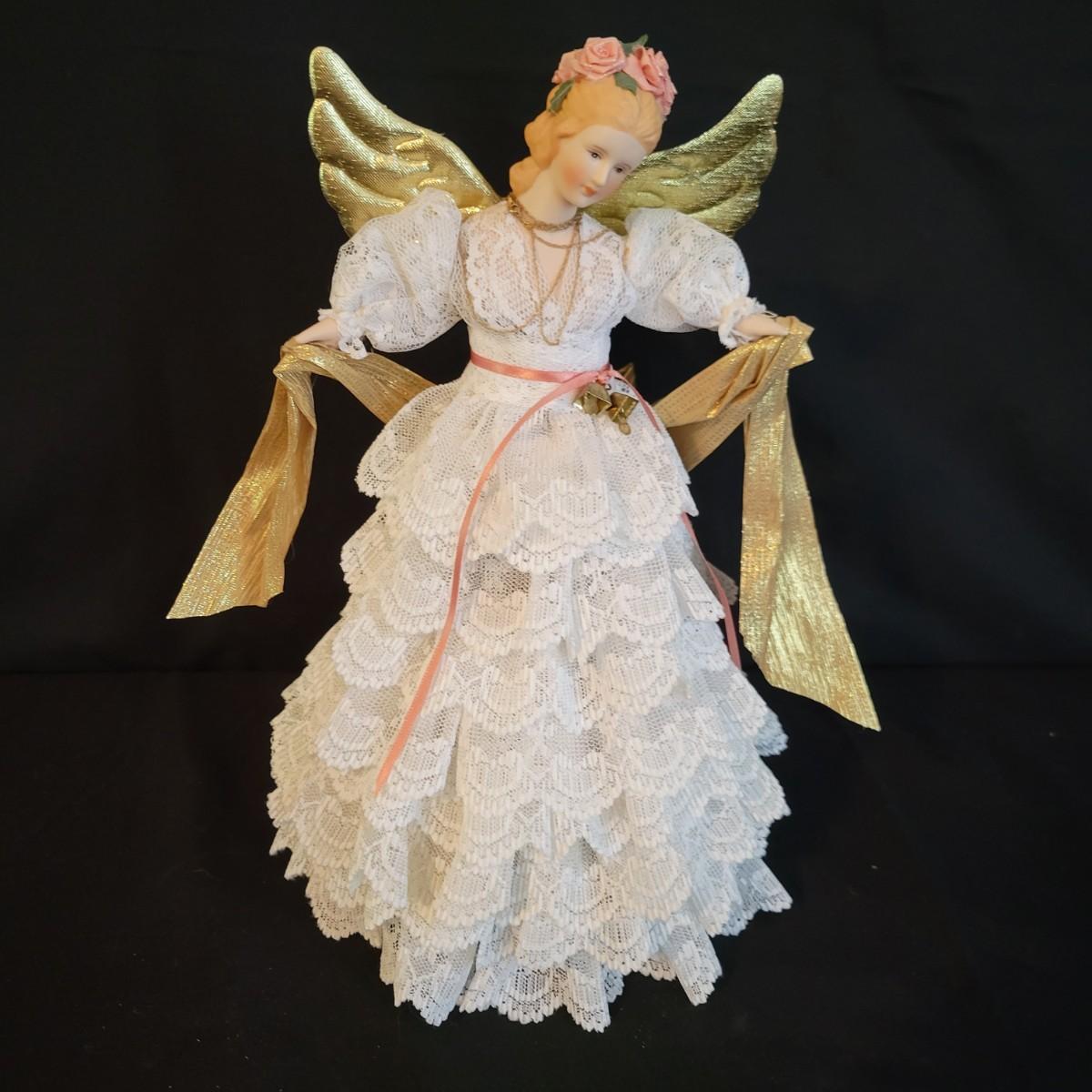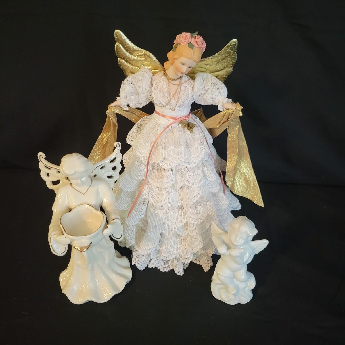 A trio of ceramic angels. One could be used as a tree topper; it has a fabric dress and a ceramic head. This item measures approximately 8"D x 11.5"H. The other two pieces are ceramic and one has gold accents. Shipping available