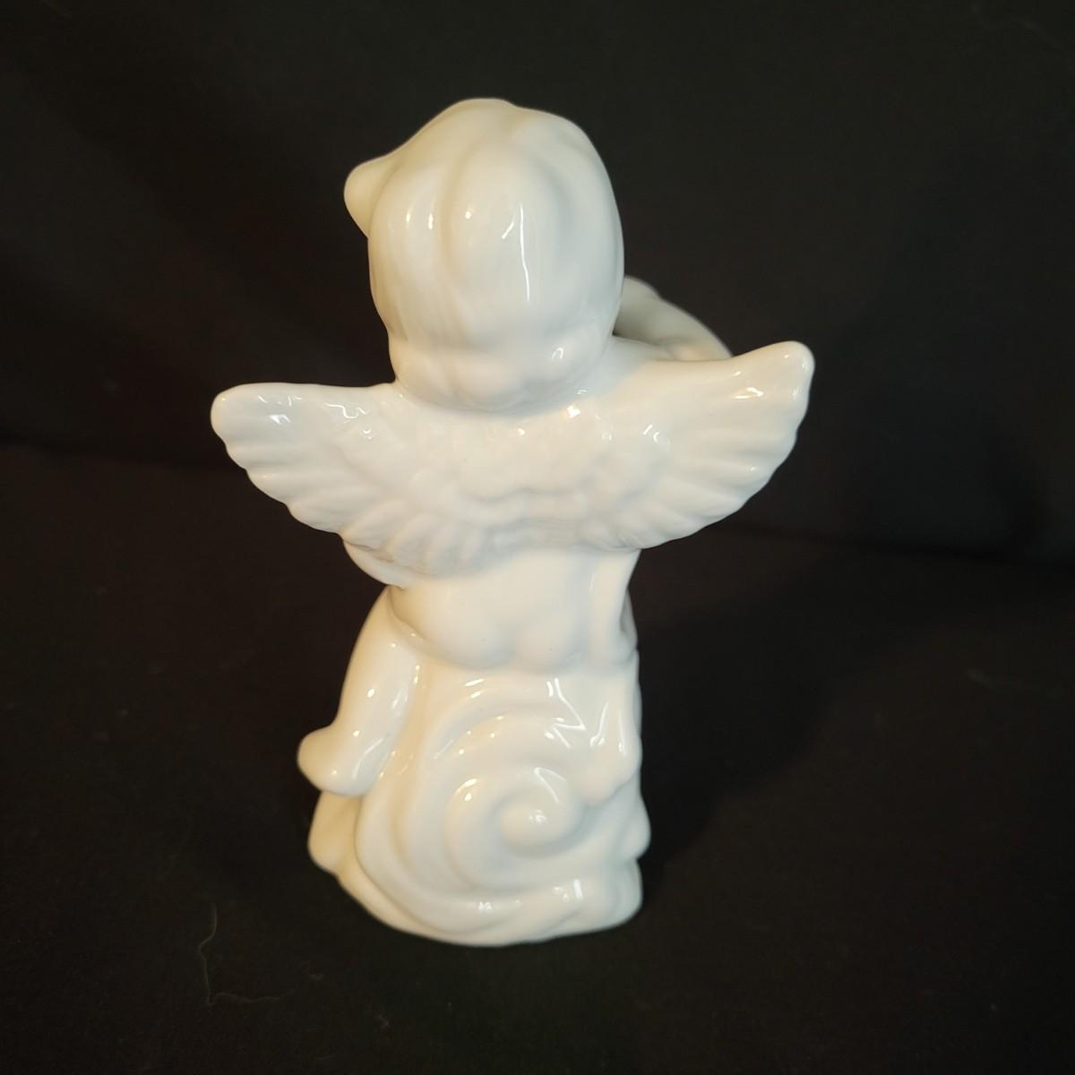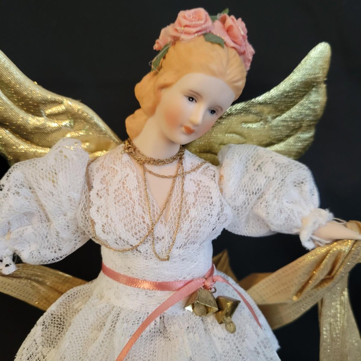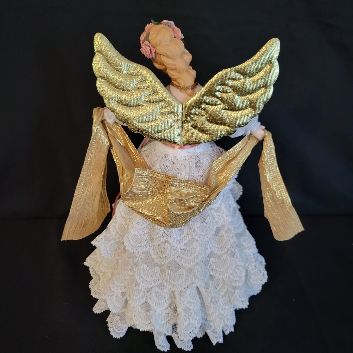 A trio of ceramic angels. One could be used as a tree topper; it has a fabric dress and a ceramic head. This item measures approximately 8"D x 11.5"H. The other two pieces are ceramic and one has gold accents. Shipping available
