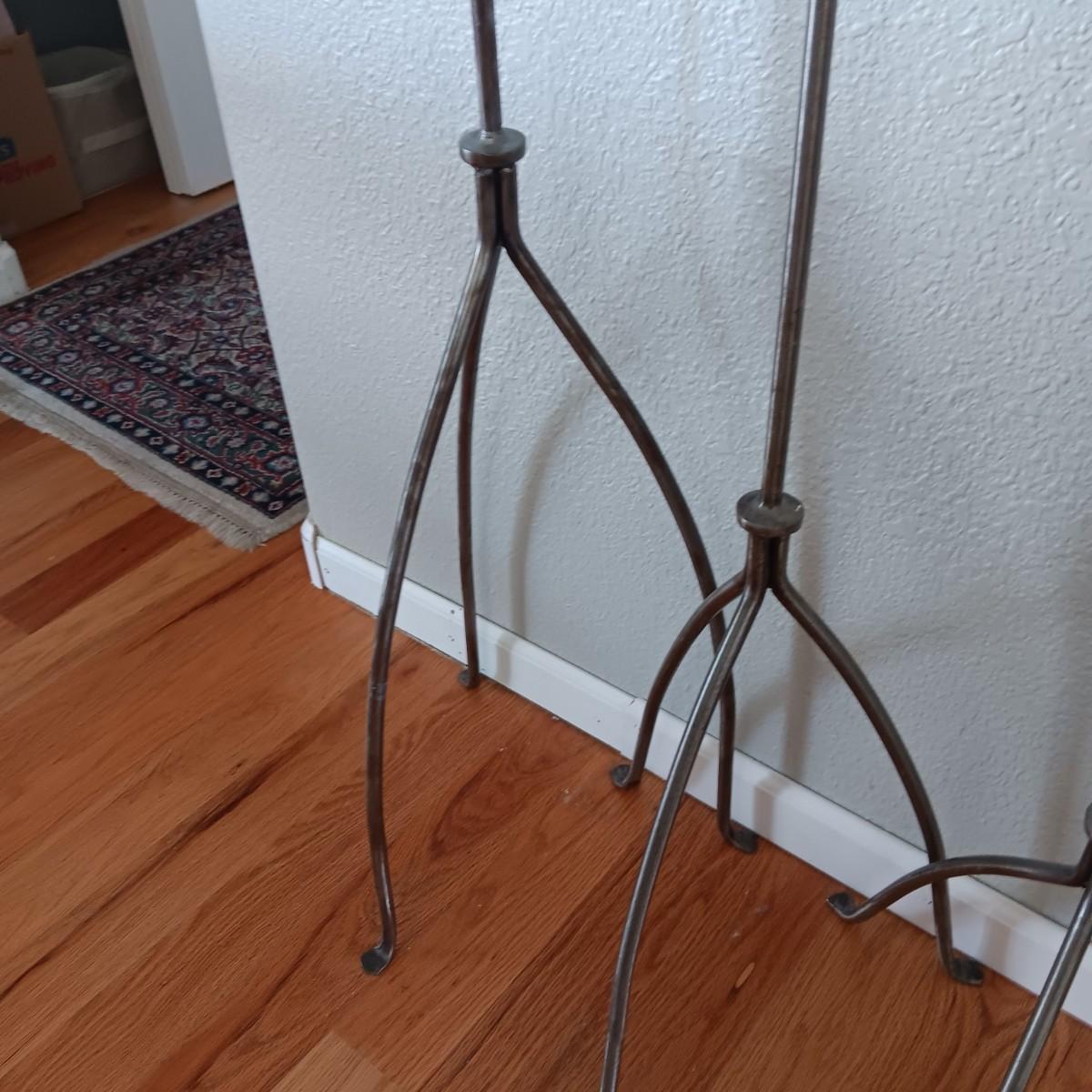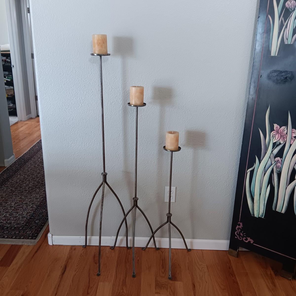 A TRIO OF HAND FORGED FLOOR CANDLE HOLDERS