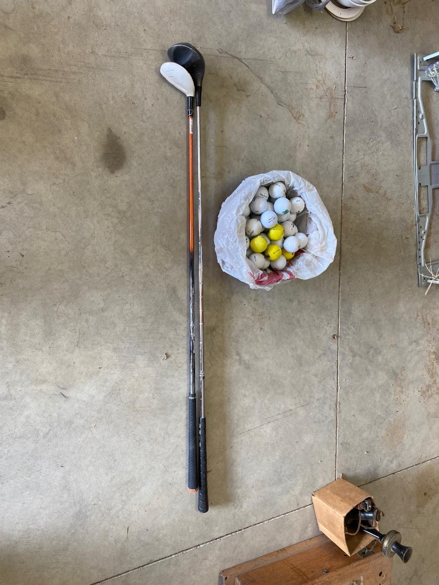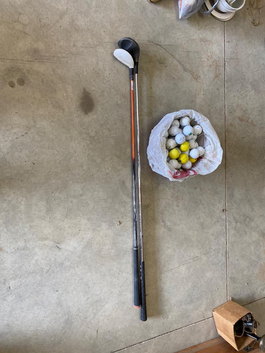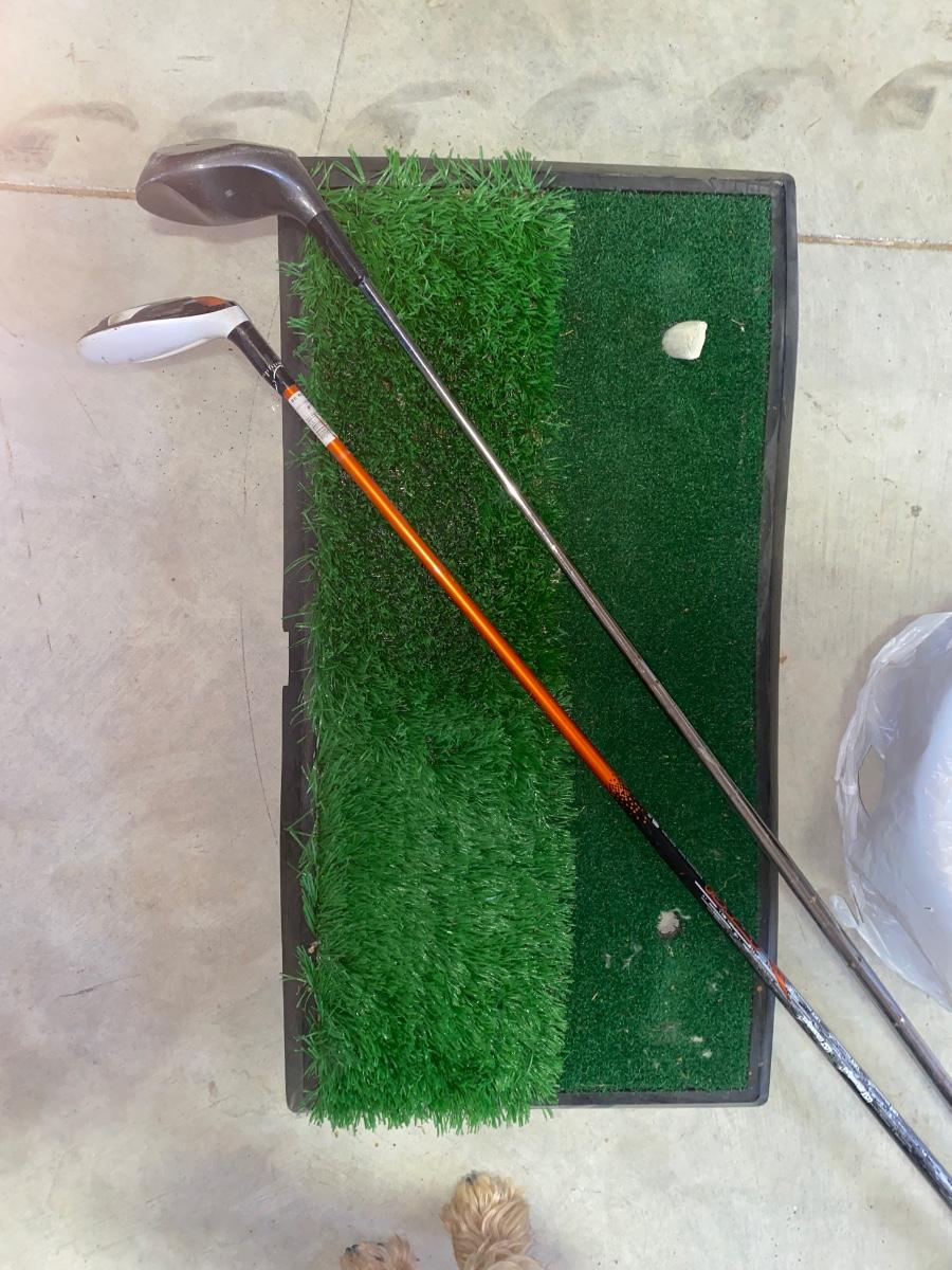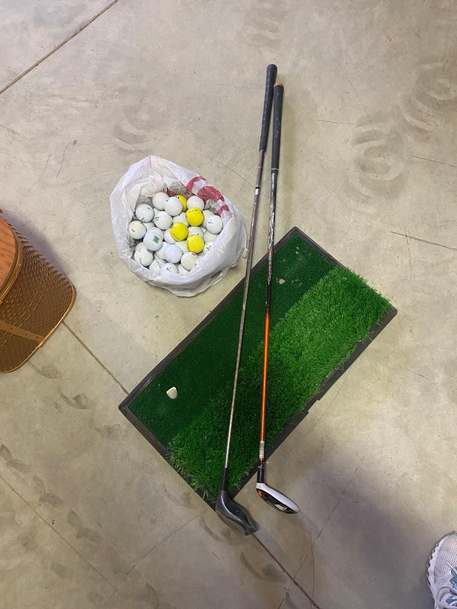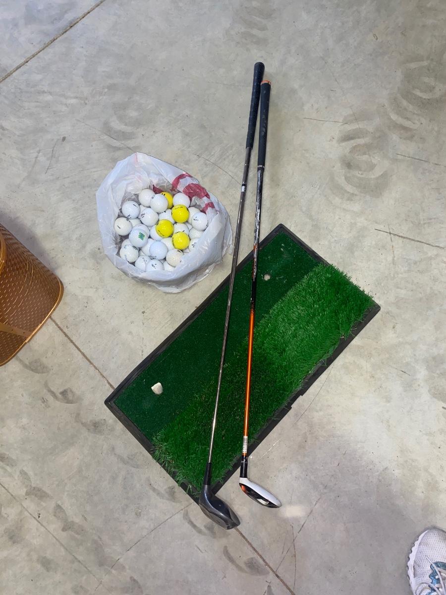 PING AND ARNOLD PALMER DRIVERS, A PIECE OF GREEN TO TEE OFF WITH A BASKET OF GOLF BALLS