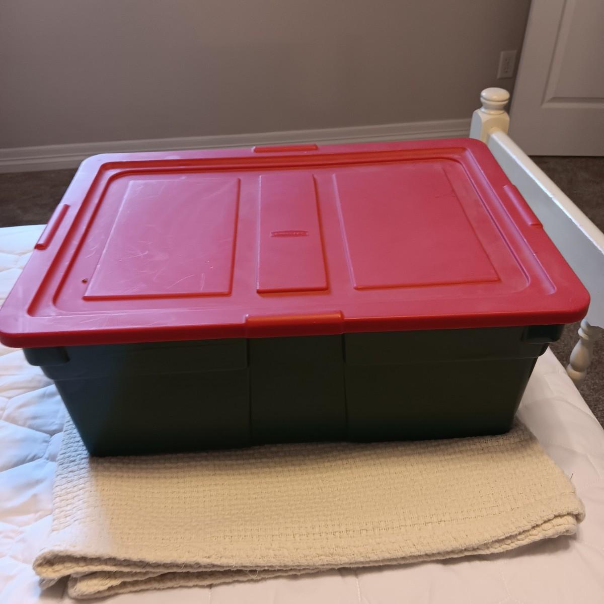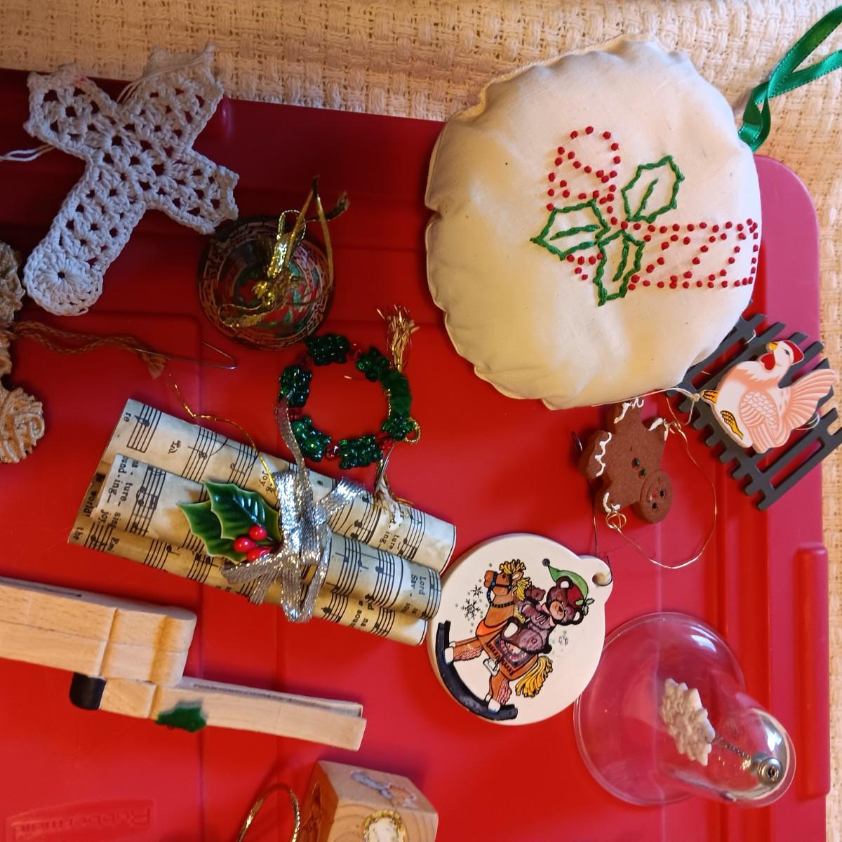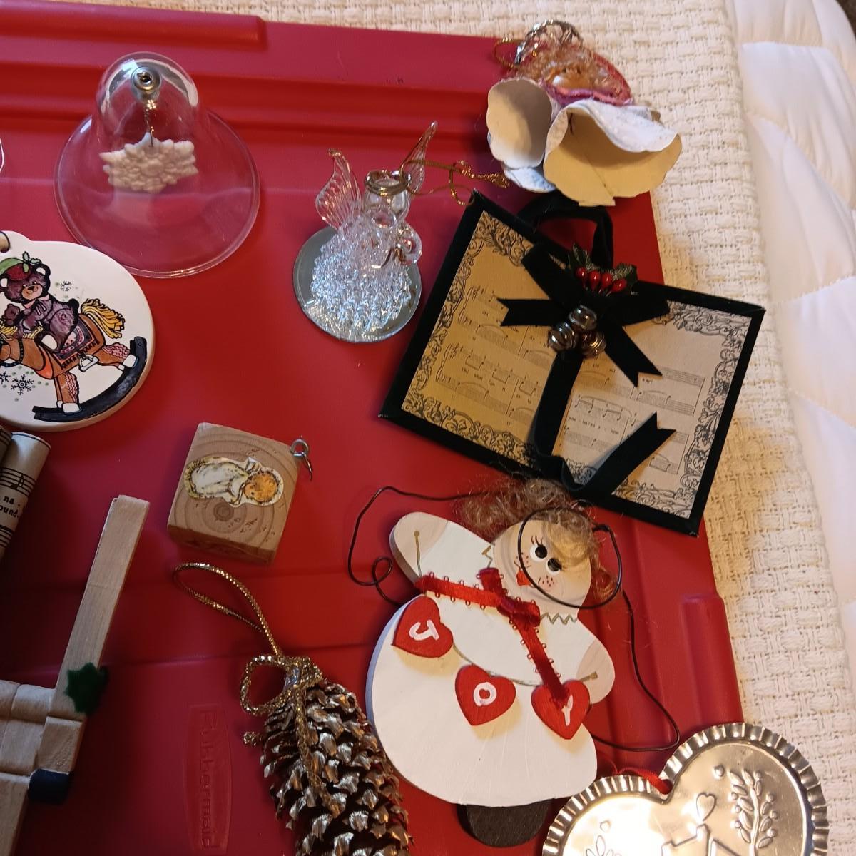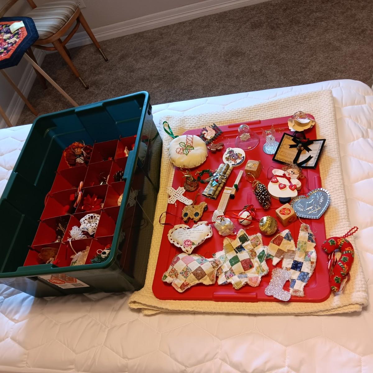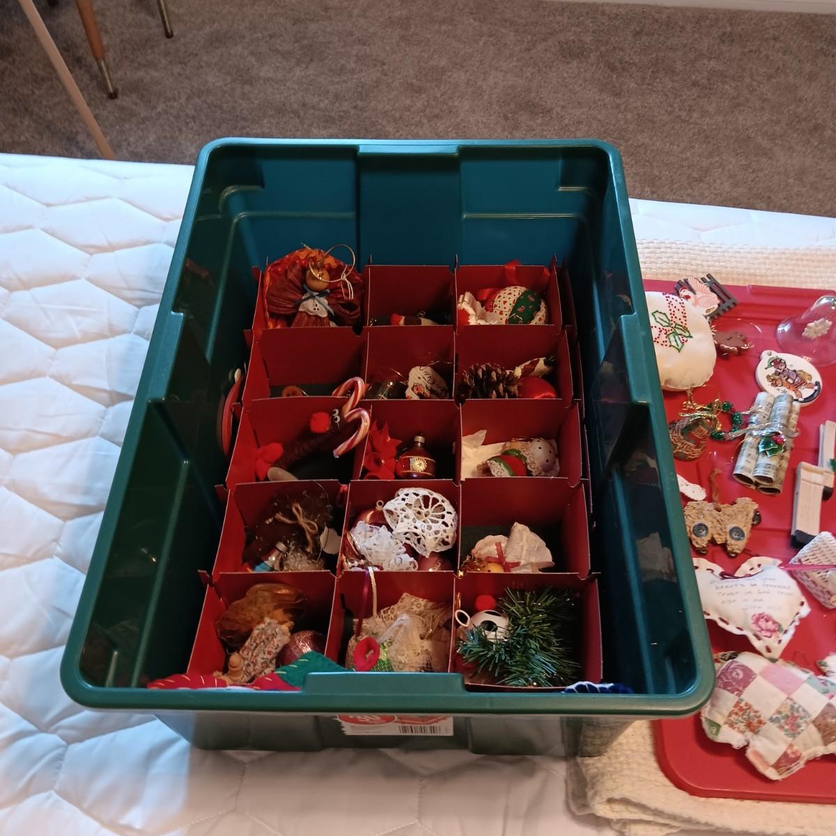 A VARIETY OF CHRISTMAS ORNAMENTS WITH AN ORGANIZING STORAGE TOTE