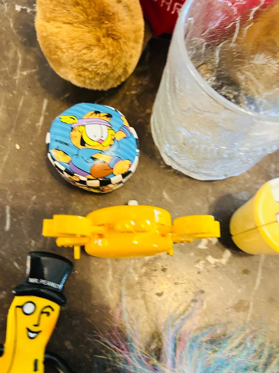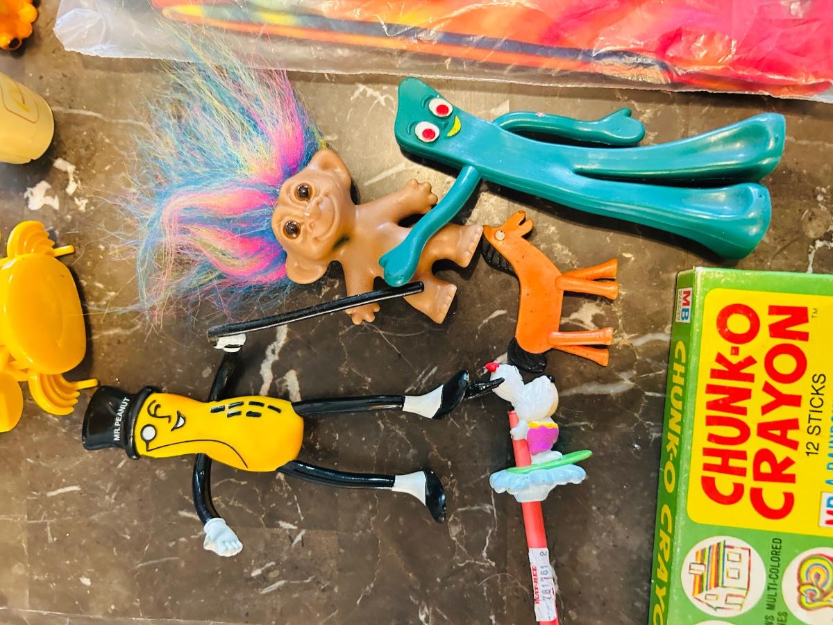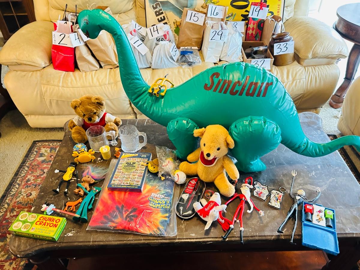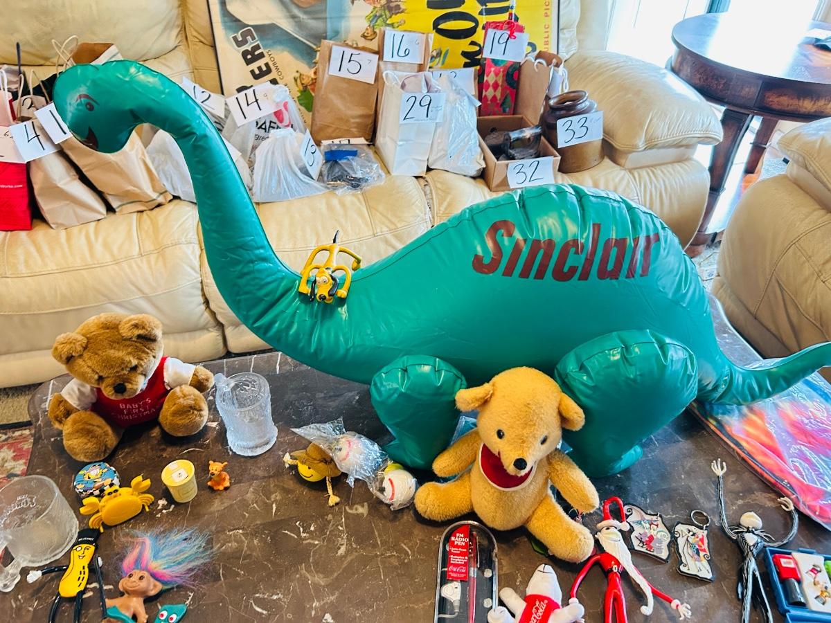 A VARIETY OF DIFFERENT TOYS AND OTHER ITEMS EVEN AN INFLATABLE SINCLAIR DINOSAUR