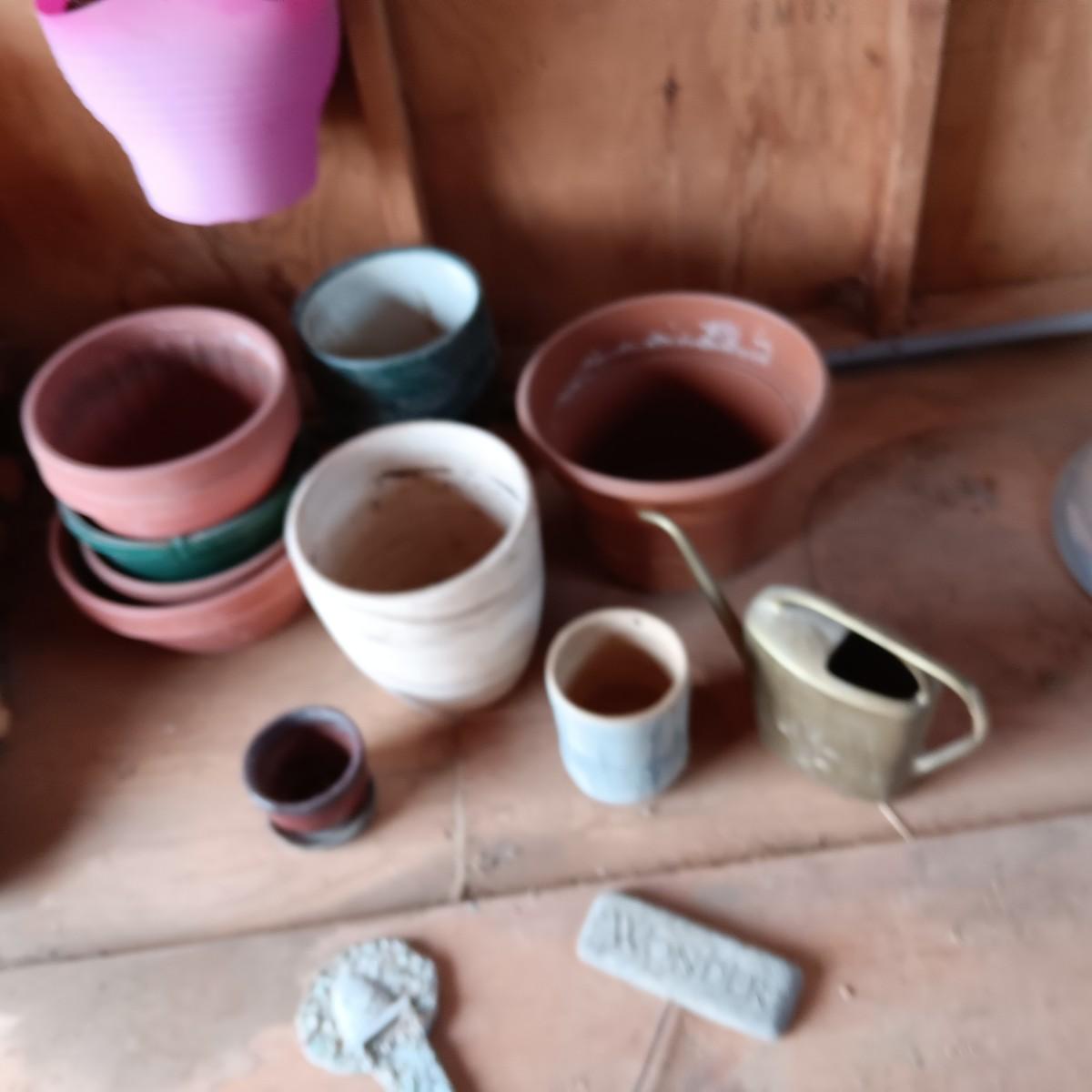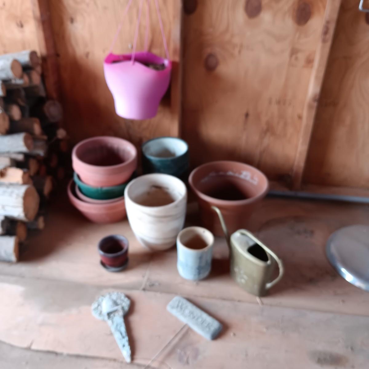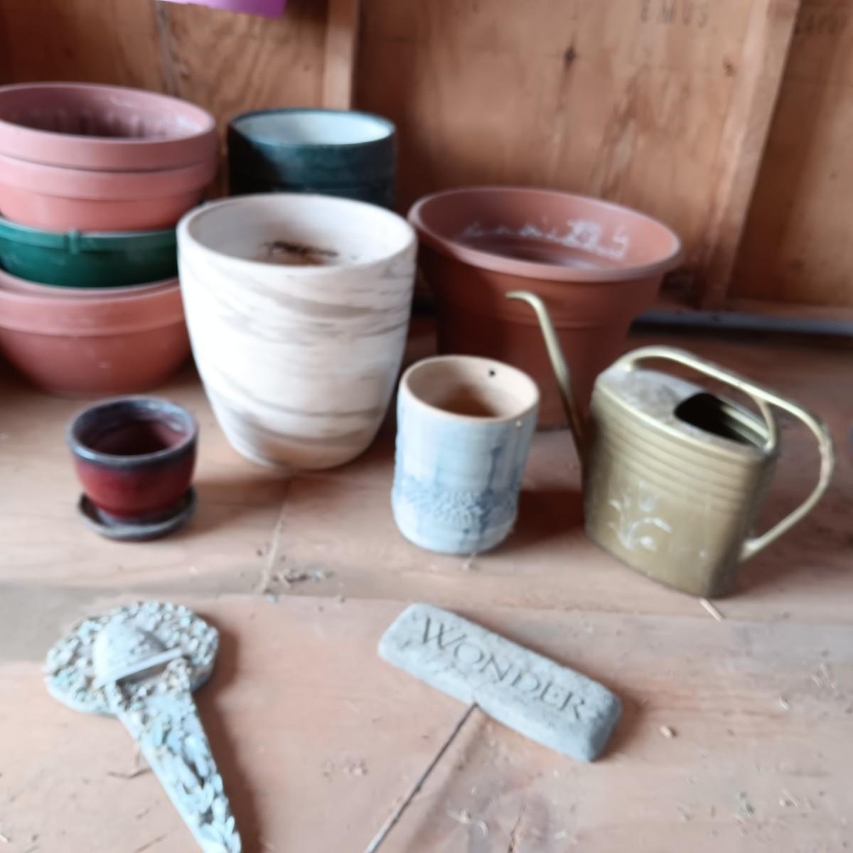 A VARIETY OF FLOWER POTS AND 2 STAKED SIGNS