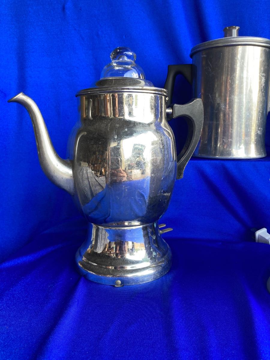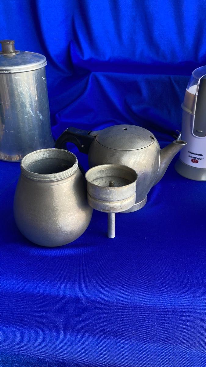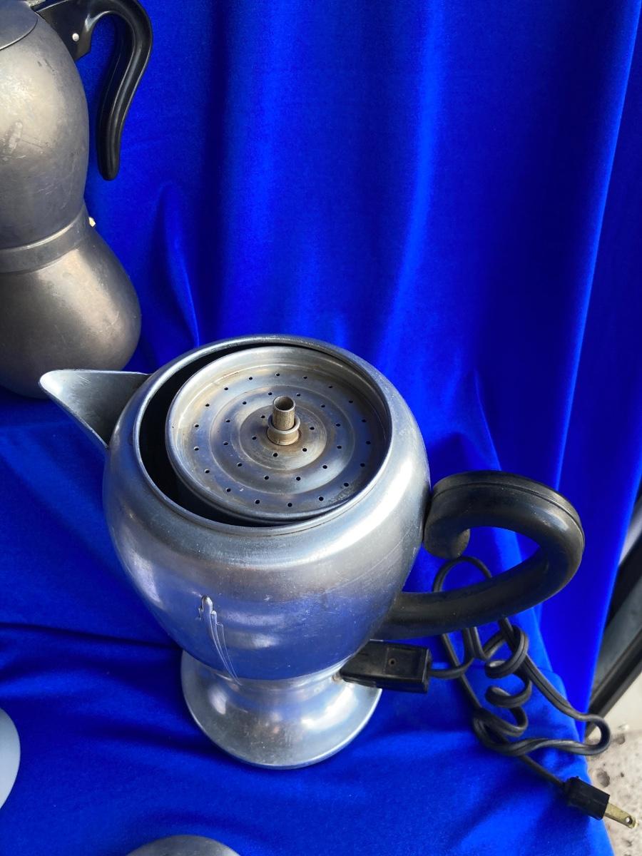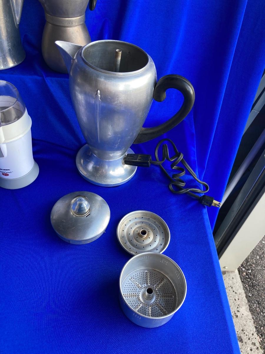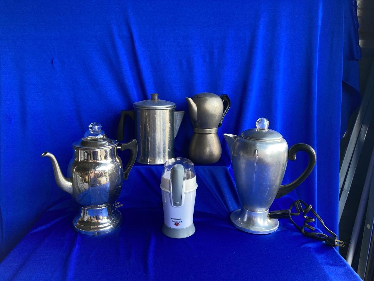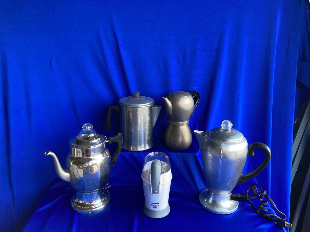 A VARIETY OF VINTAGE COFFEE POTS AND A COFFEE GRINDER TO TRY THEM OUT WITH