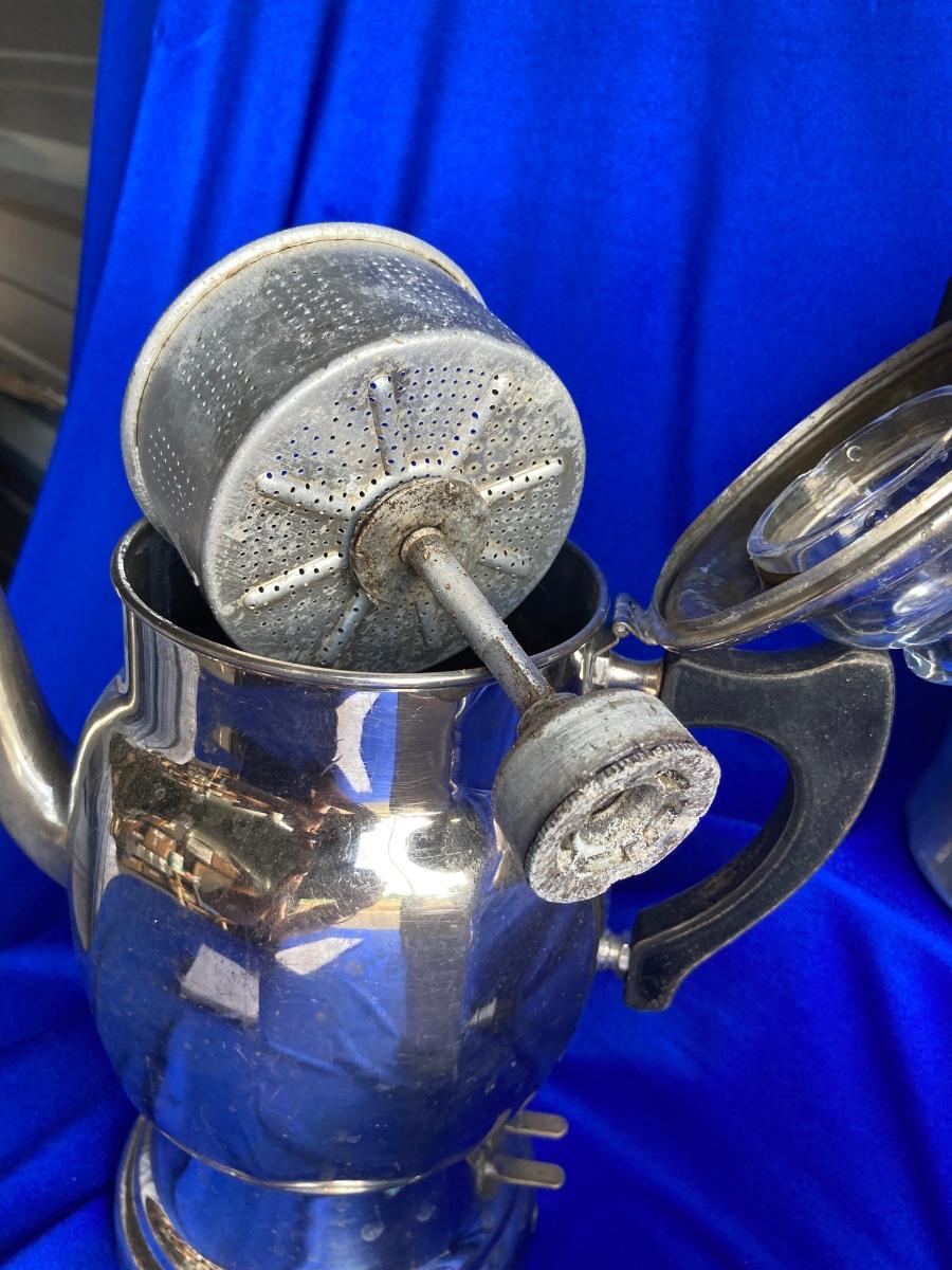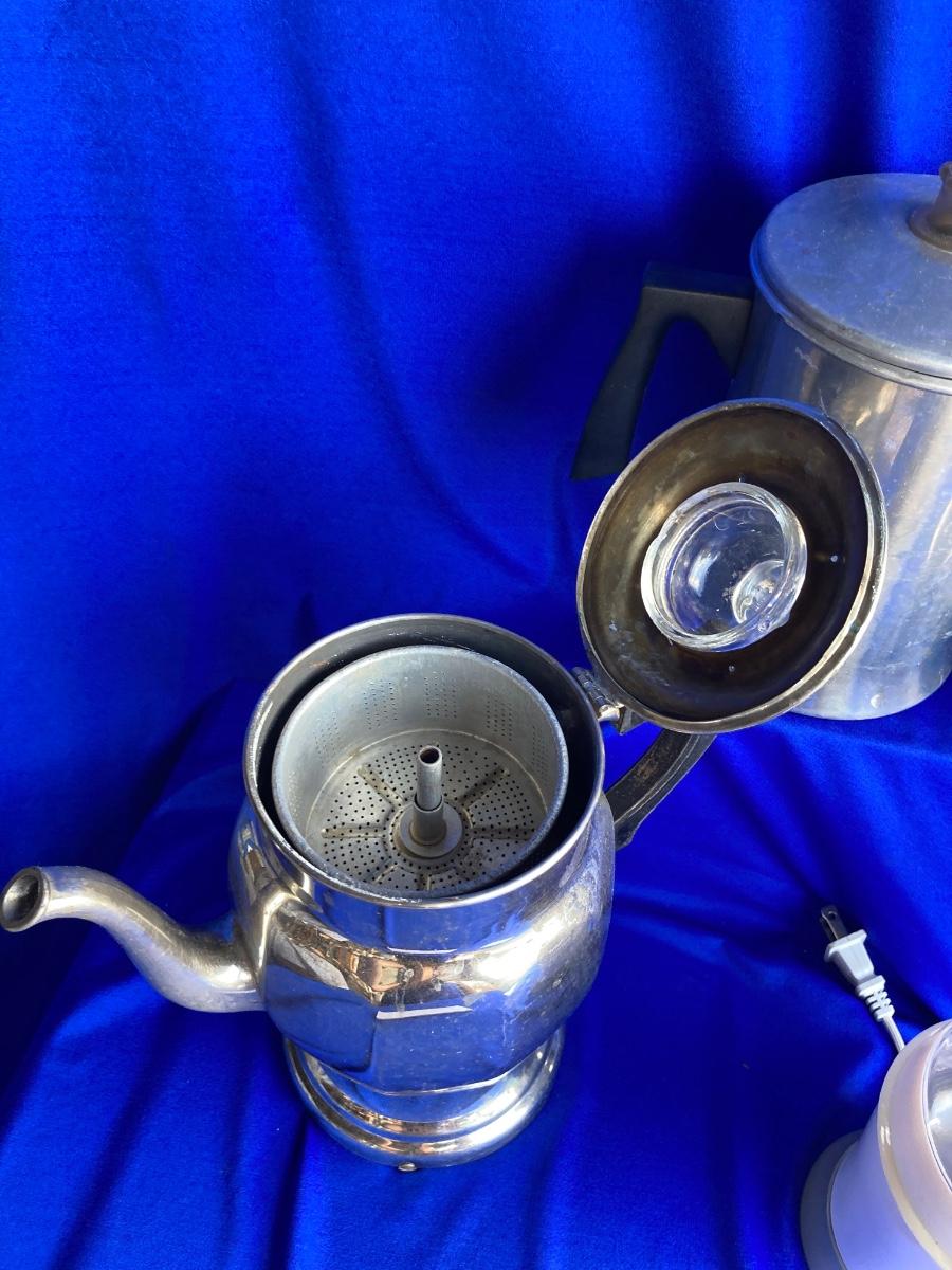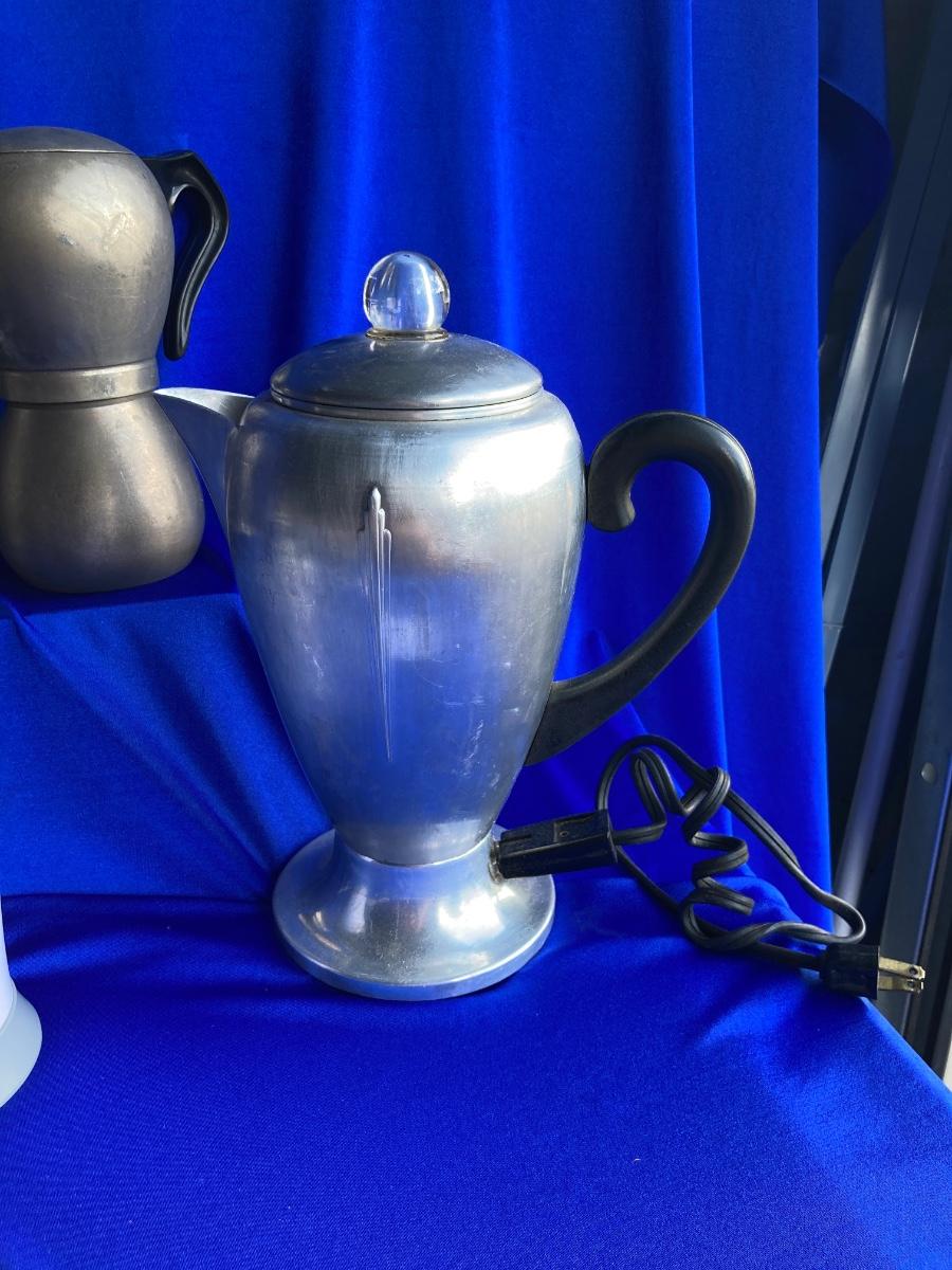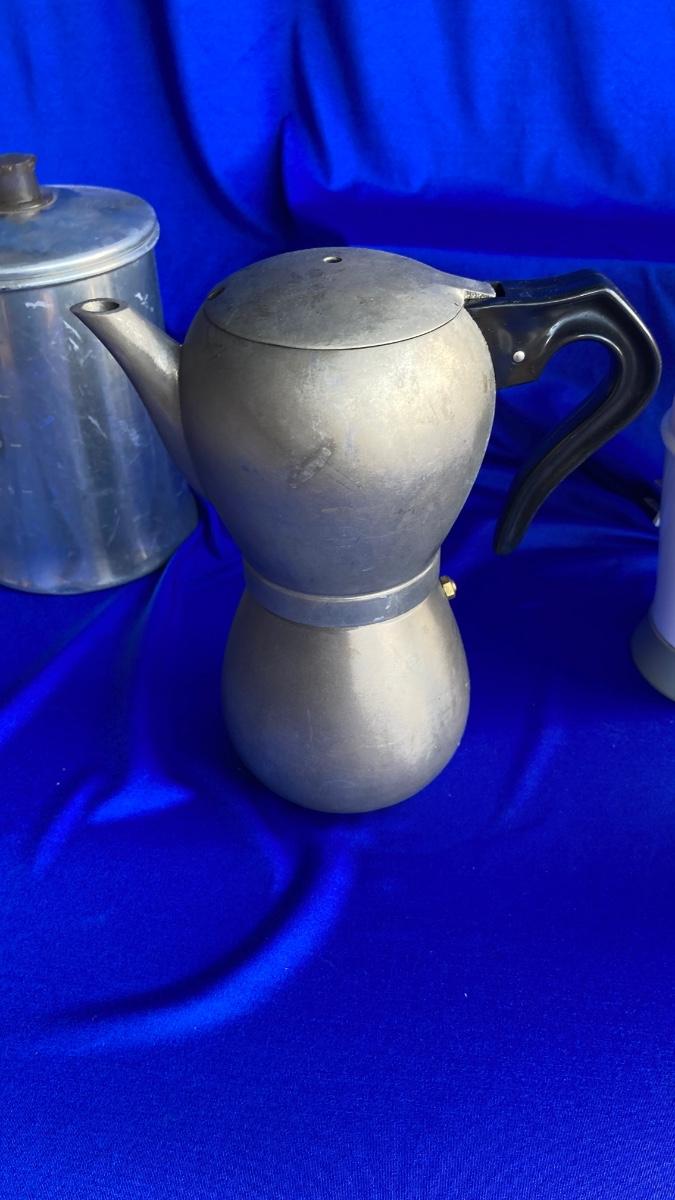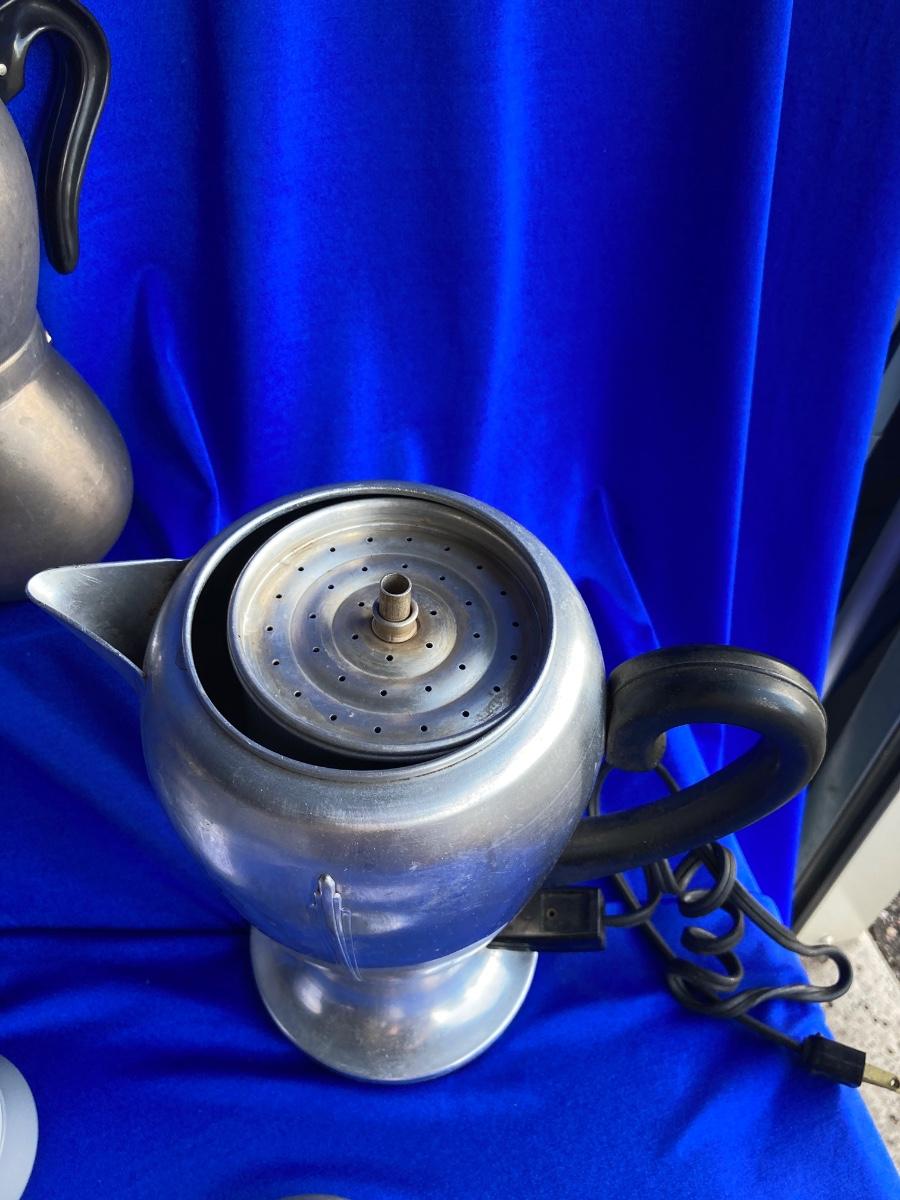 A VARIETY OF VINTAGE COFFEE POTS AND A COFFEE GRINDER TO TRY THEM OUT WITH