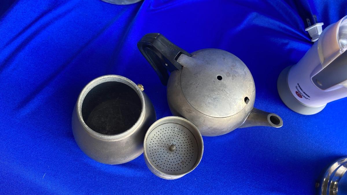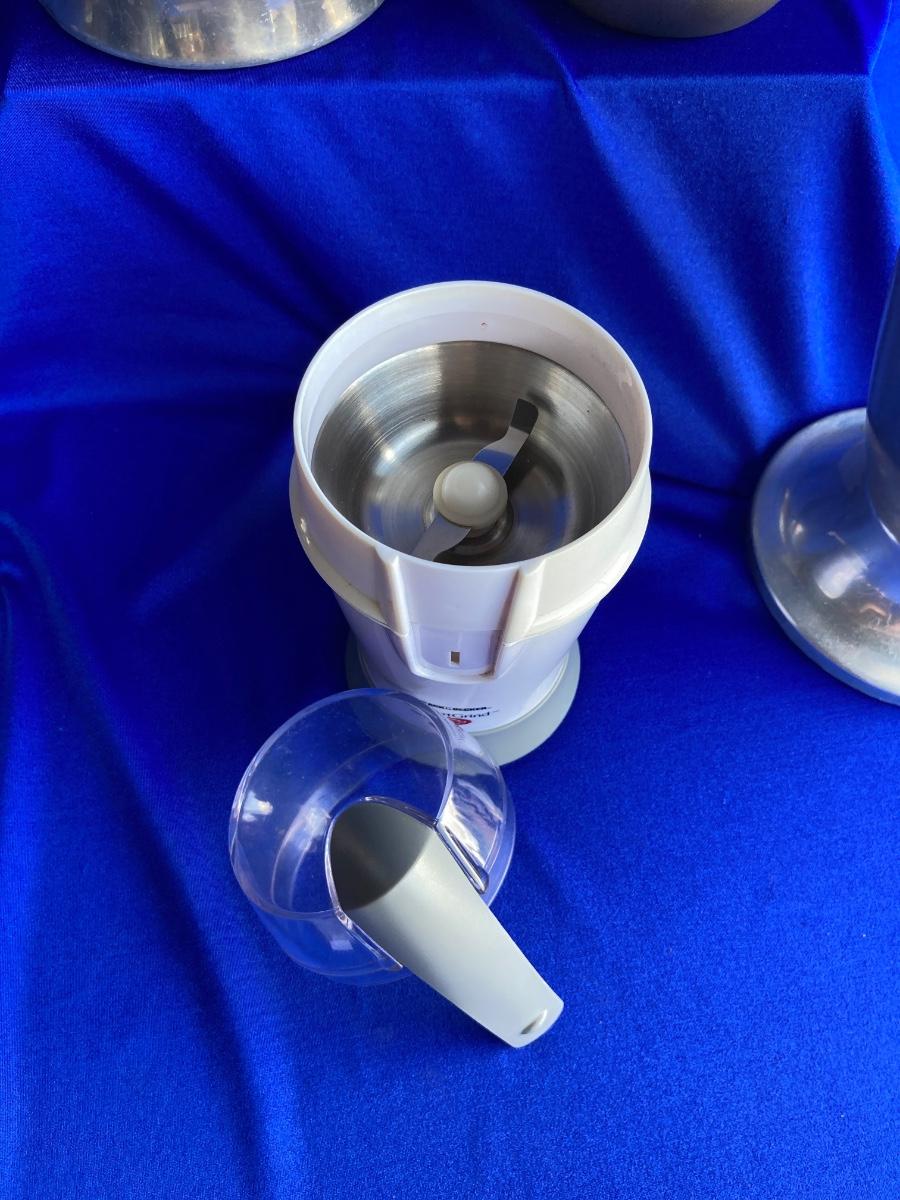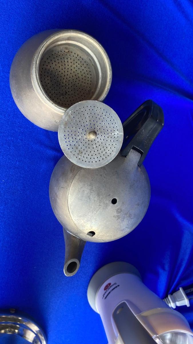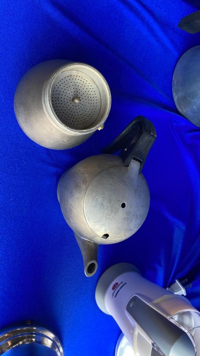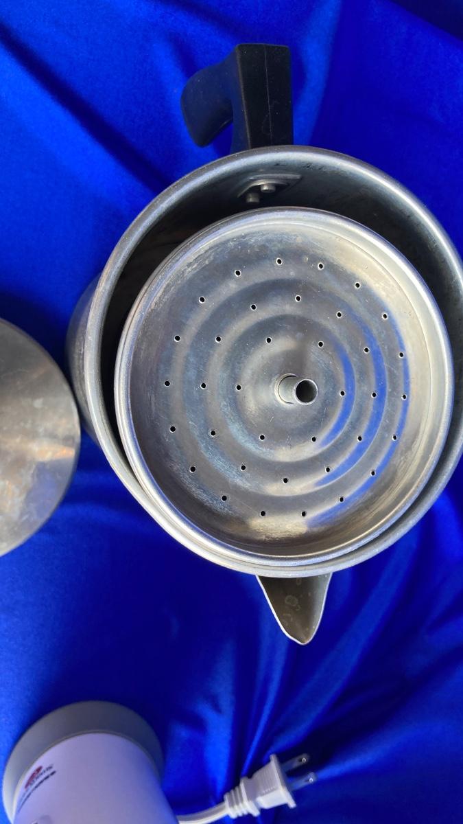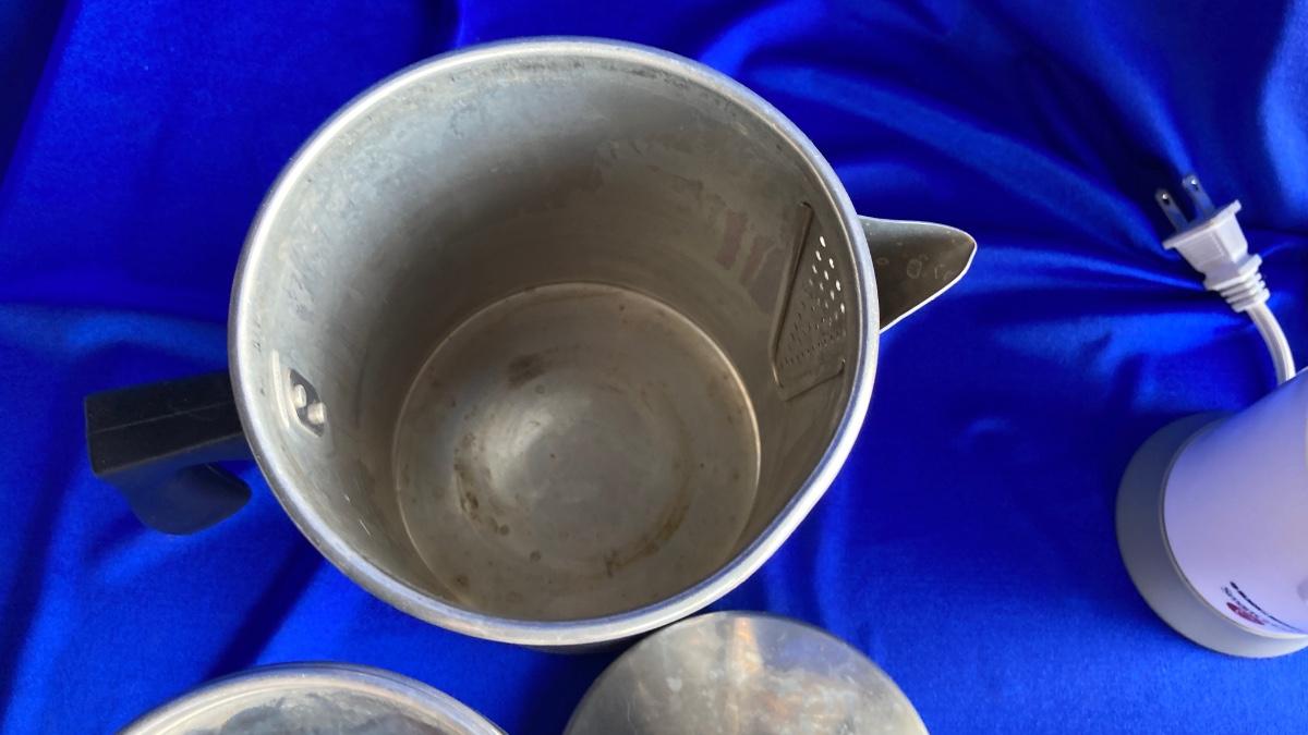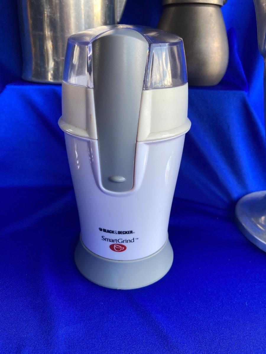 A VARIETY OF VINTAGE COFFEE POTS AND A COFFEE GRINDER TO TRY THEM OUT WITH