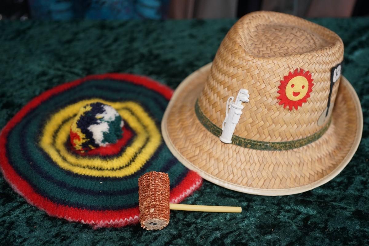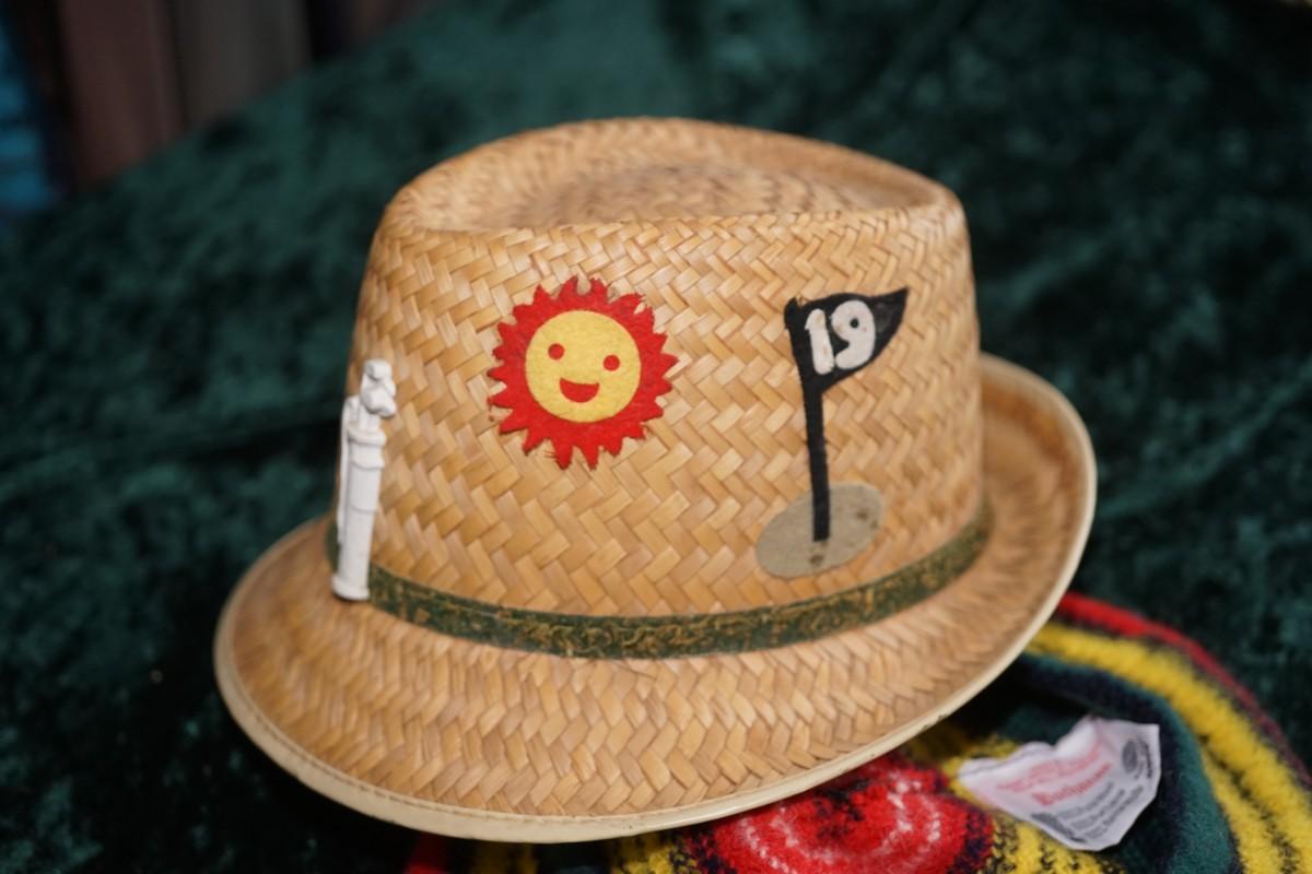 A VERY FUN VINTAGE PAIR OF MEN'S GOLFING HATS. DECORATED STRAW / WOODLEN TA,