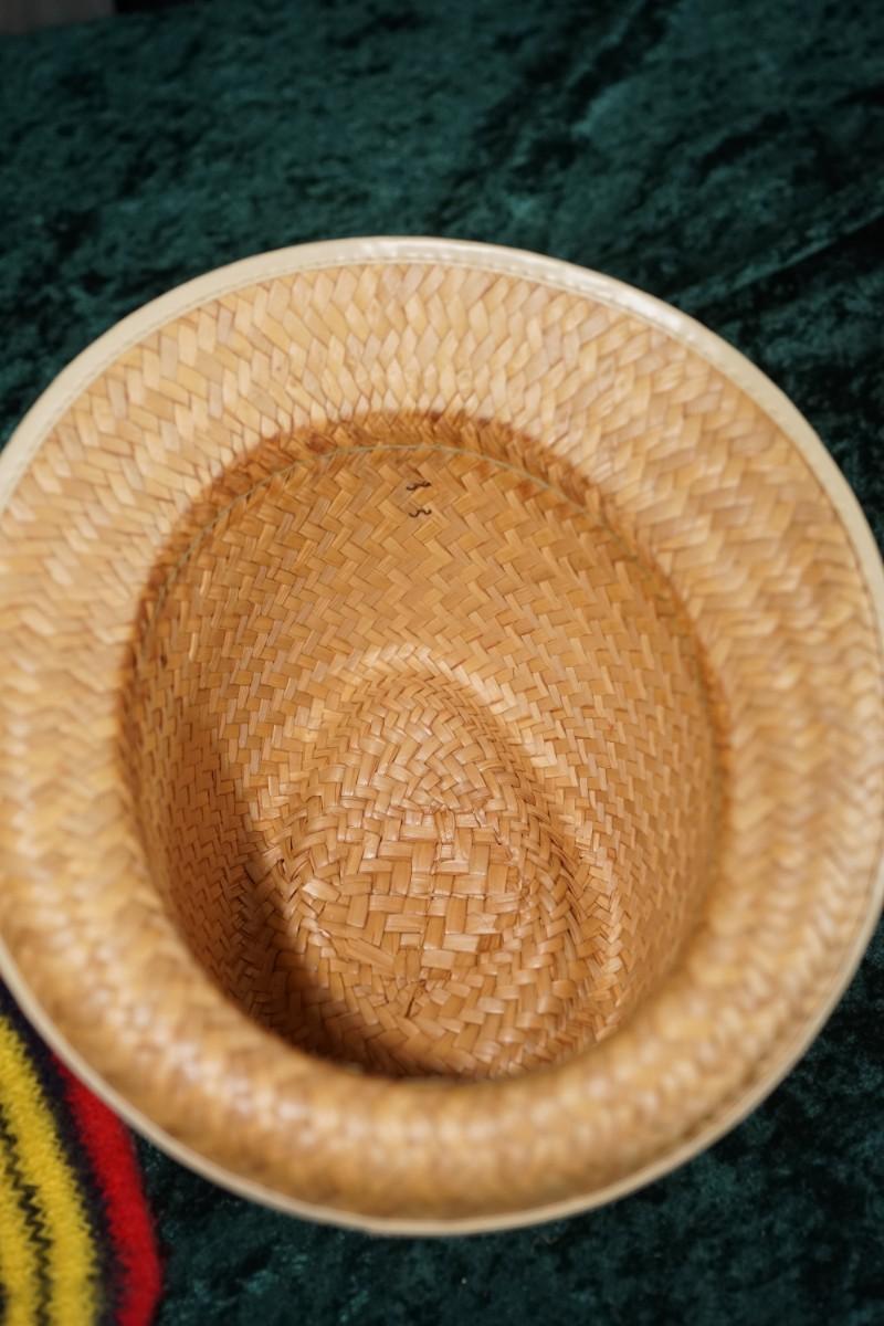 the straw hat is decorated with applied gold theme items and is truly unique