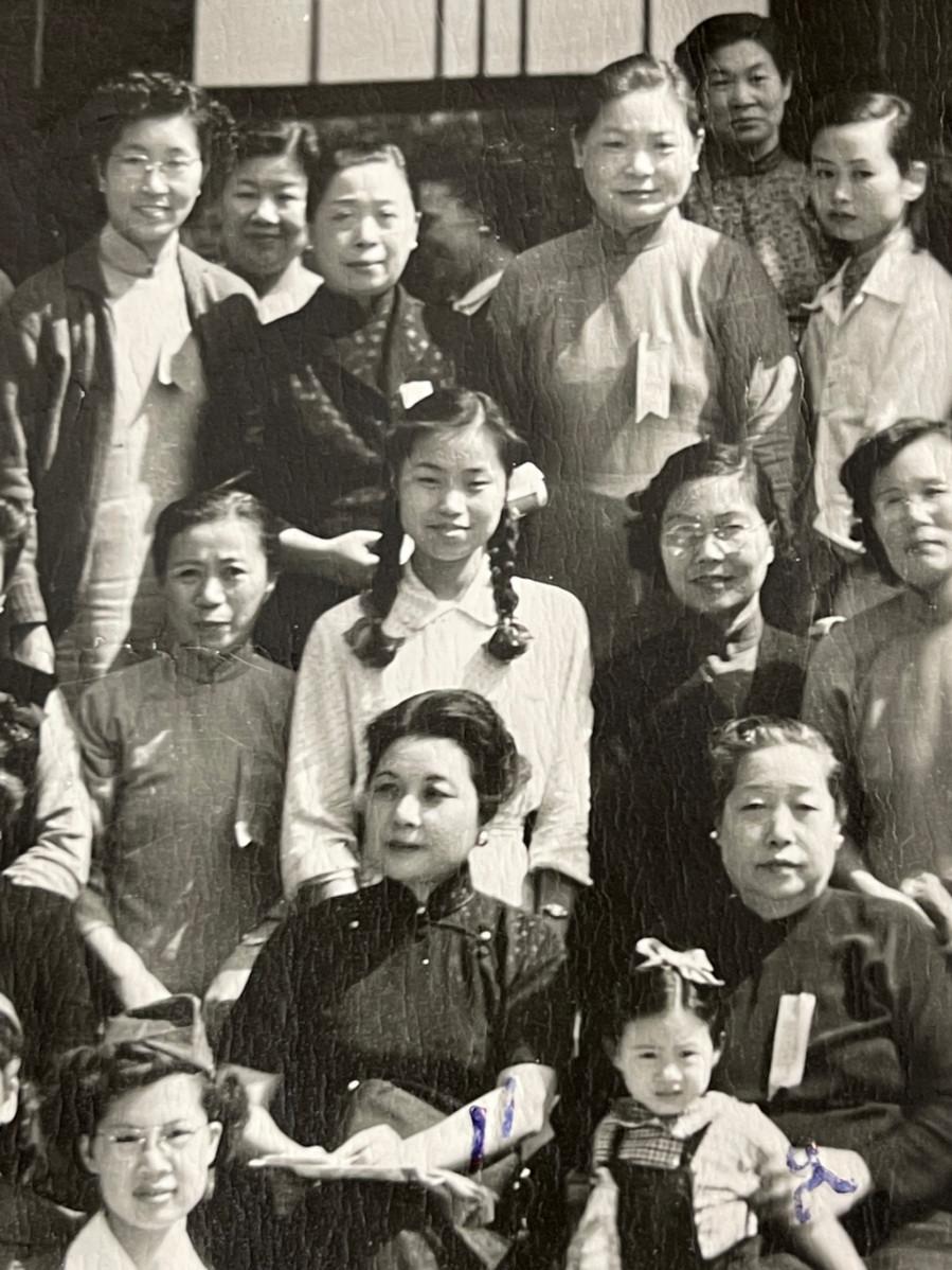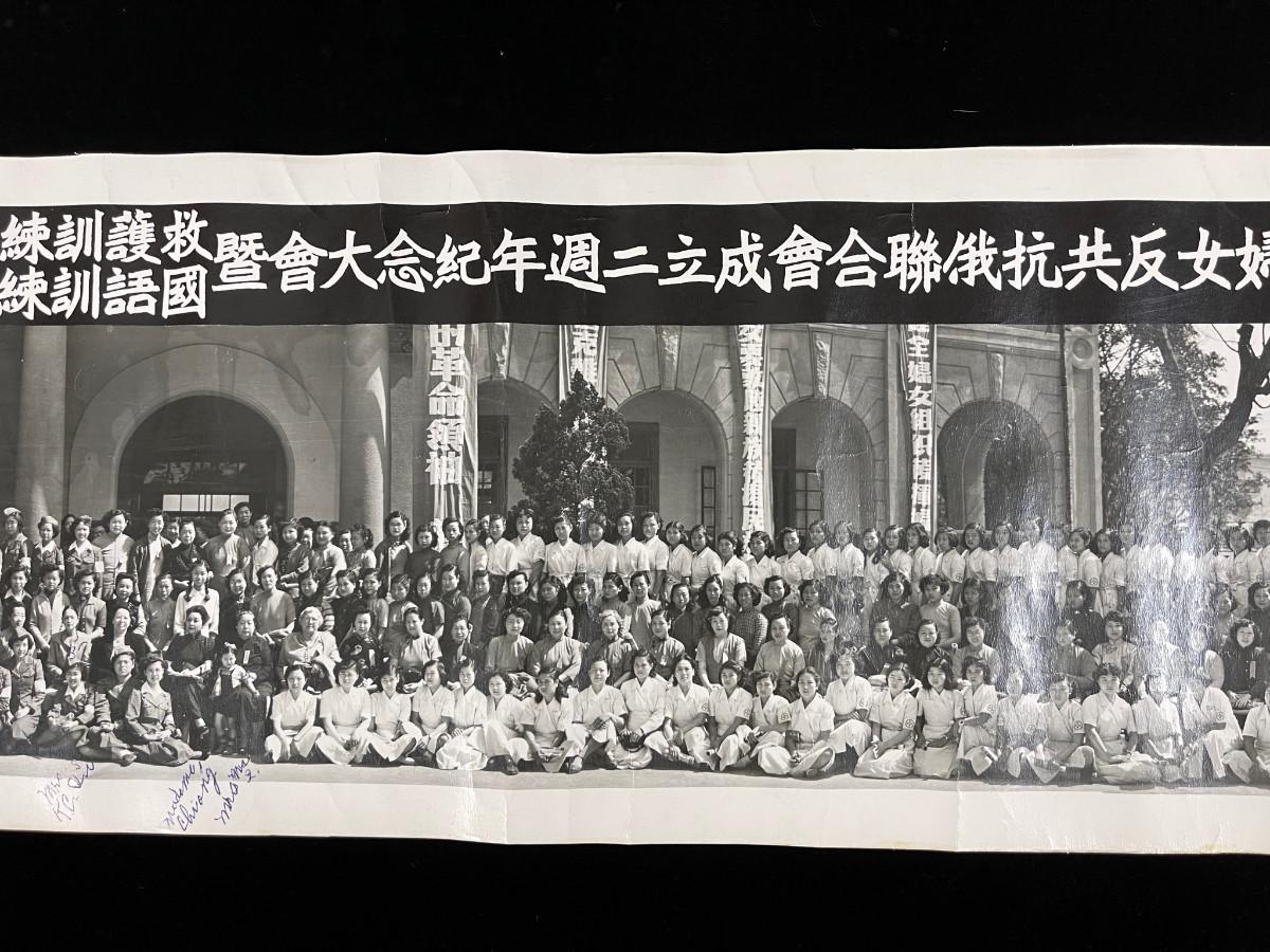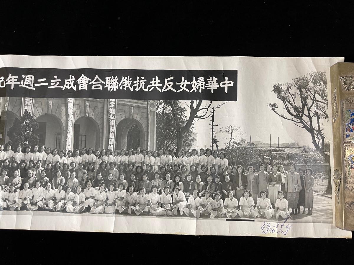 DESCRIPTION: This photograph, dated 1952, appears to be of a large gathering of a Chinese/Christian ancillary group made up of two or three generations of women committed to a civic cause. Many sport the same badge of identity on the cuffs of the short sleeved blouses. This photograph has been stored rolled up for an extended period of time. Much glare on the first photo. Photo is not faded.