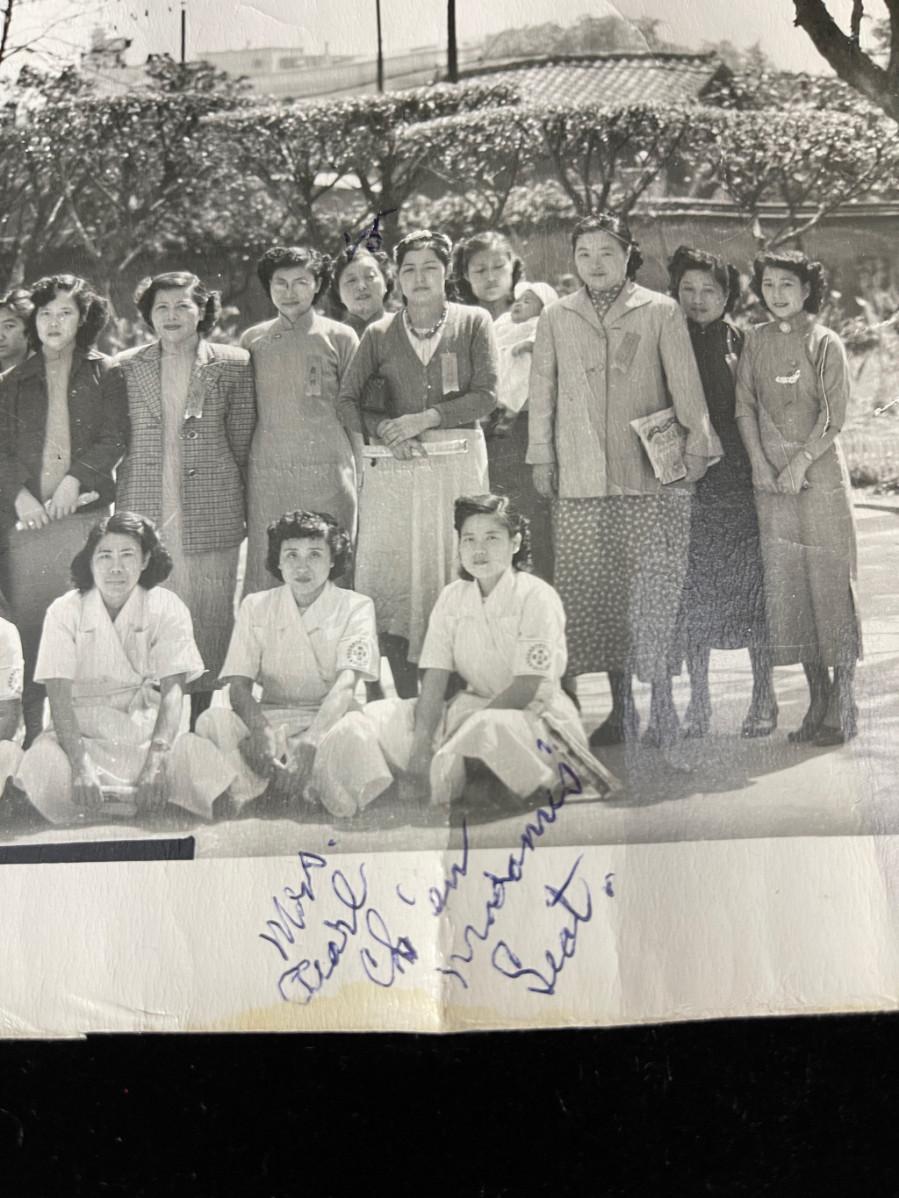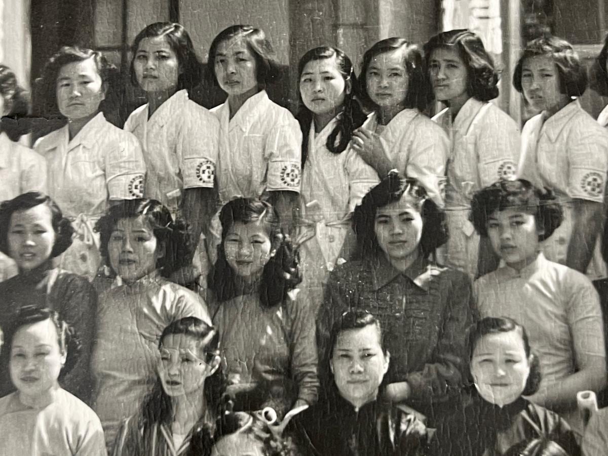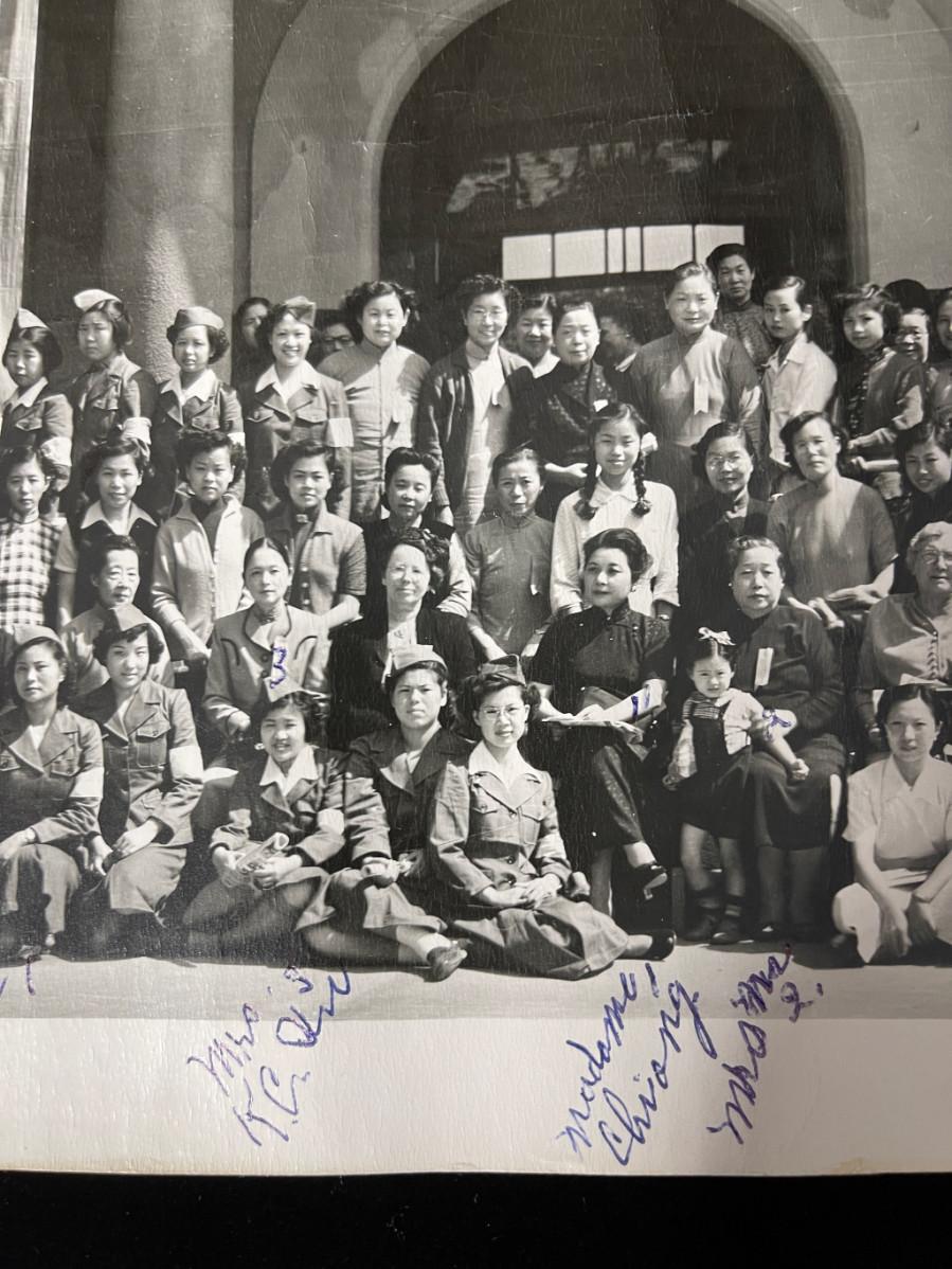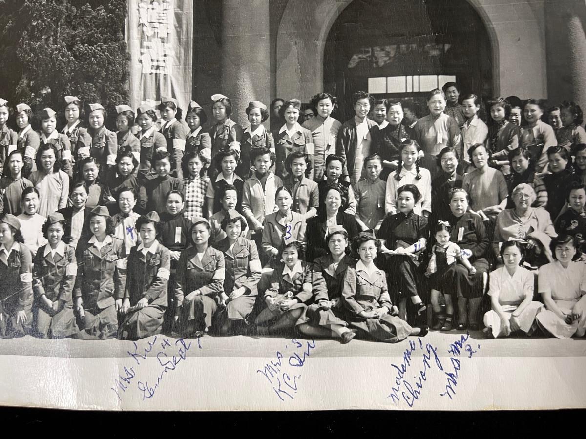 DESCRIPTION: This photograph, dated 1952, appears to be of a large gathering of a Chinese/Christian ancillary group made up of two or three generations of women committed to a civic cause. Many sport the same badge of identity on the cuffs of the short sleeved blouses. This photograph has been stored rolled up for an extended period of time. Much glare on the first photo. Photo is not faded.
