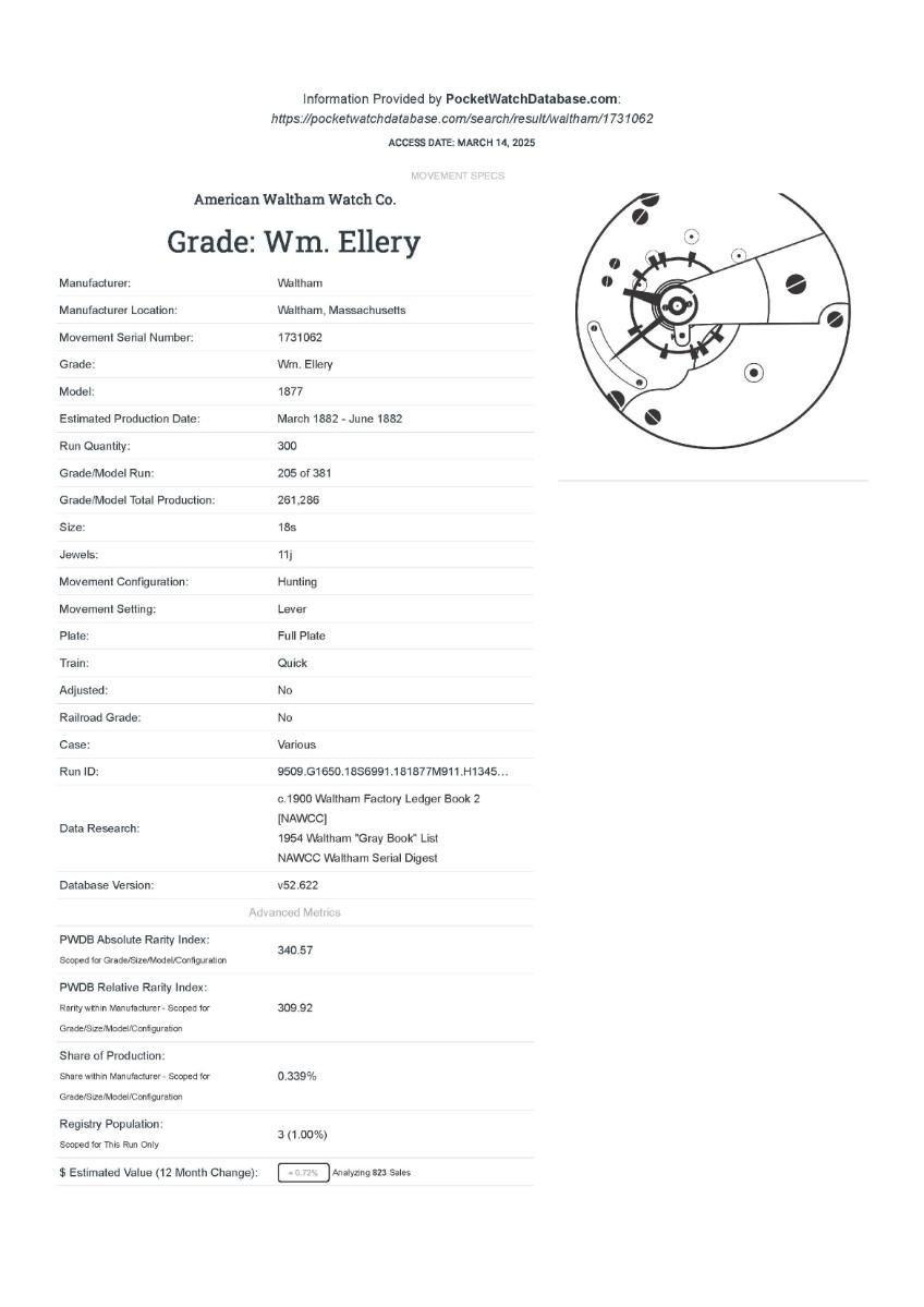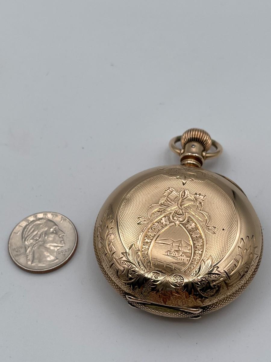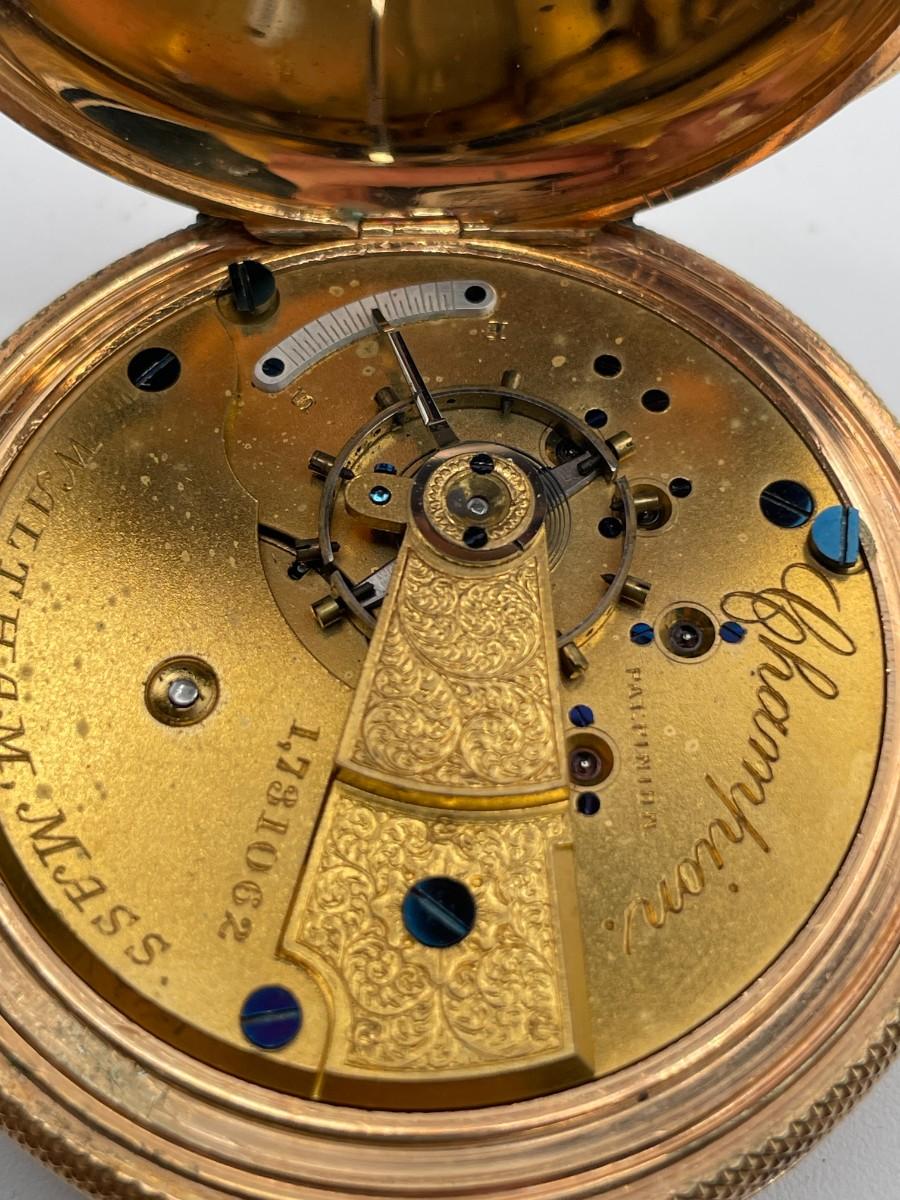 A.W.Co. Waltham Champ Pocket Watch, No. (1731062), Size 18s, Prod Yr 1877. Case: JA Brown, No. 76133, GF. Condition - Winder & watch are in working order. This is not a guarantee that all parts are original nor is the watch autheniticated.