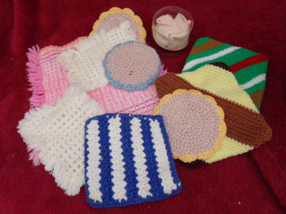 A whole pile of kitchen towels, hot pads, etcc. Some knit, some crocheted, quite the assortment. It’s a box full.