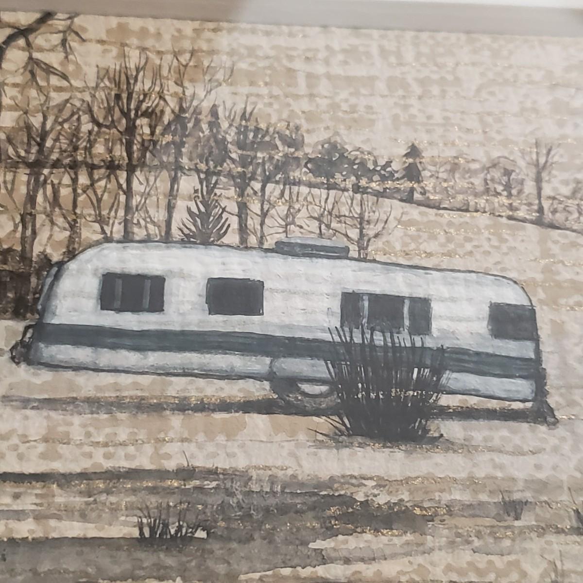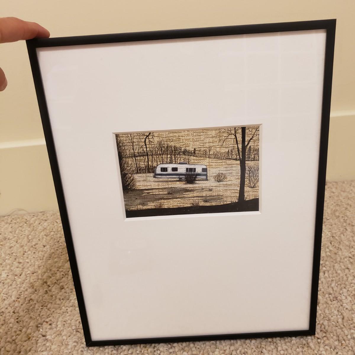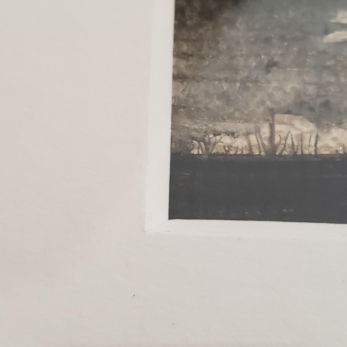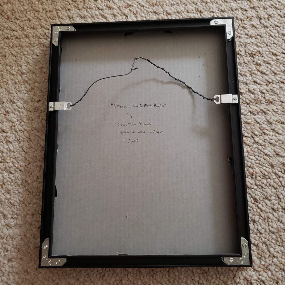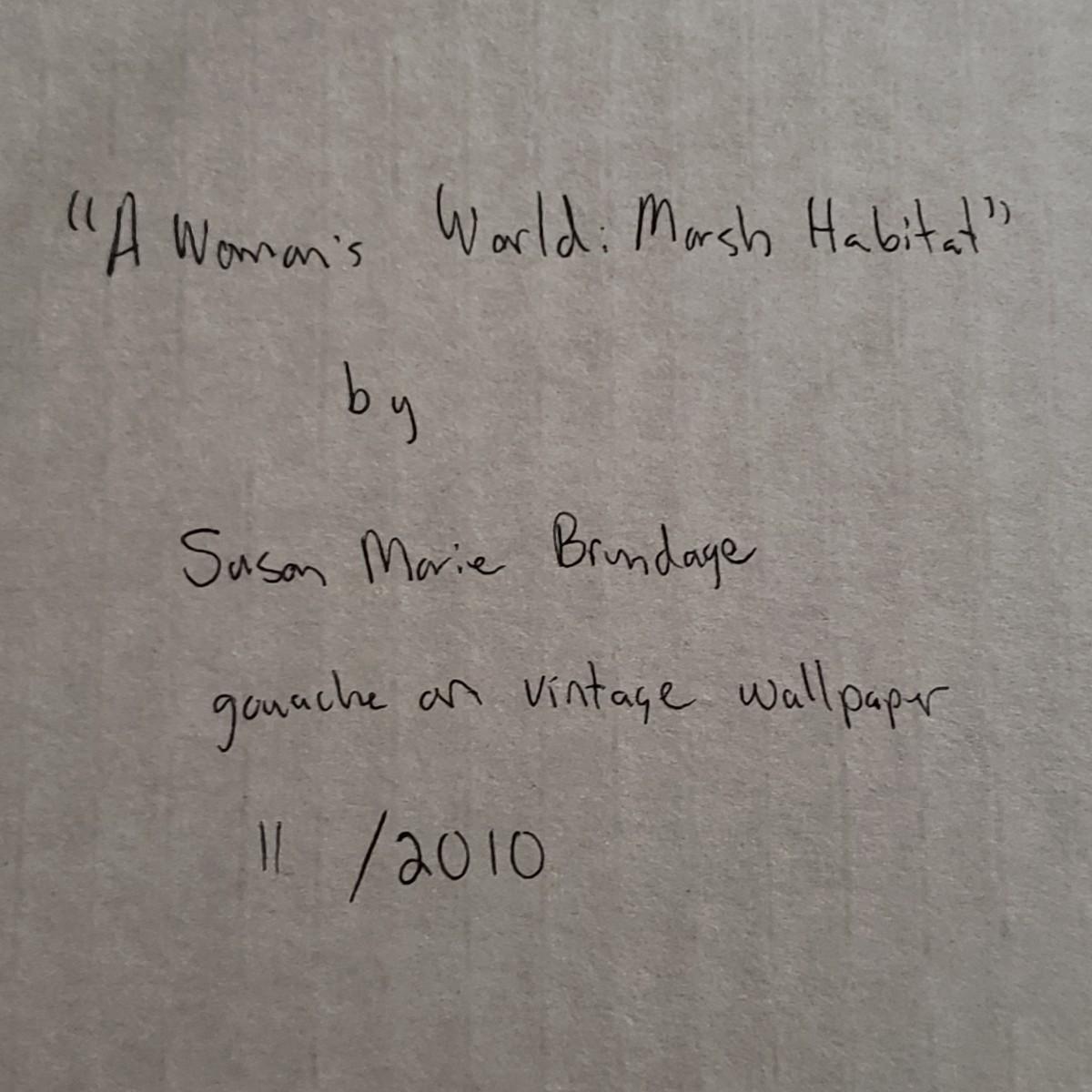According to the back inscription, this piece is titled "A Women’s World- Marsh Habitat " by Susan Marie Brundage. This piece is matted under glass in a black metal frame. It may be hard to detect in the images, but there is gold paint which sparkles under the right lighting. The back also states that it is gouache on vintage wallpaper.