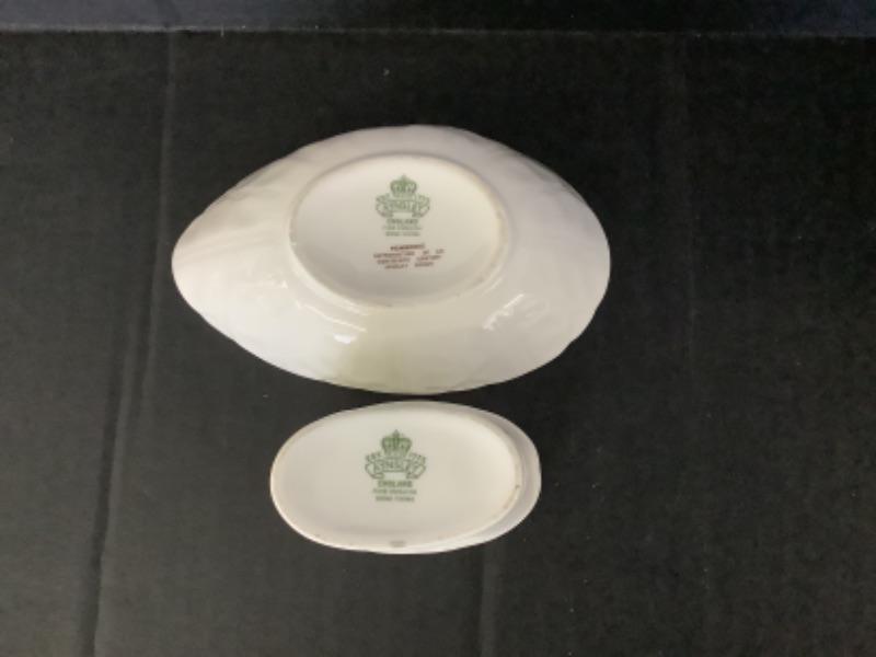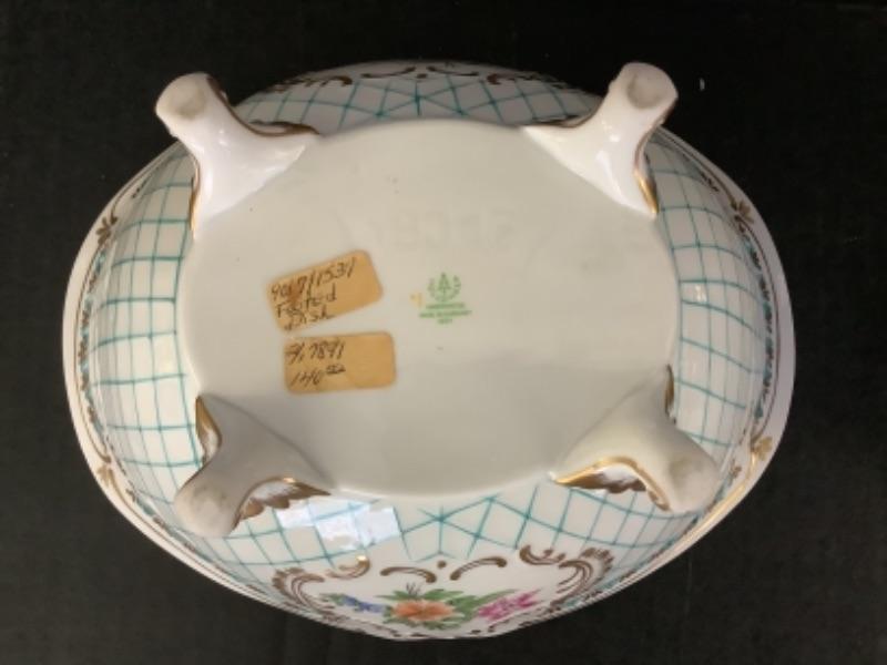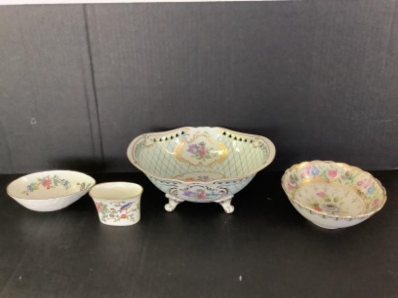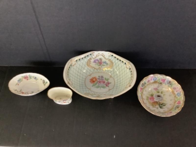 Hollohaza Hungary hand painted footed reticulated dish, Royal Aynsley Bone China Dish, Royal Aynsley Pembroke Dish and a small bowl stamped hand painted