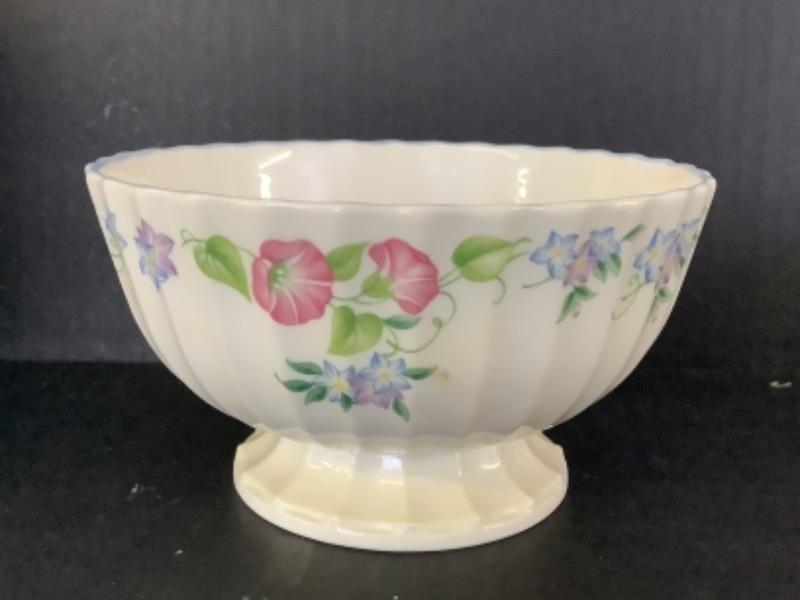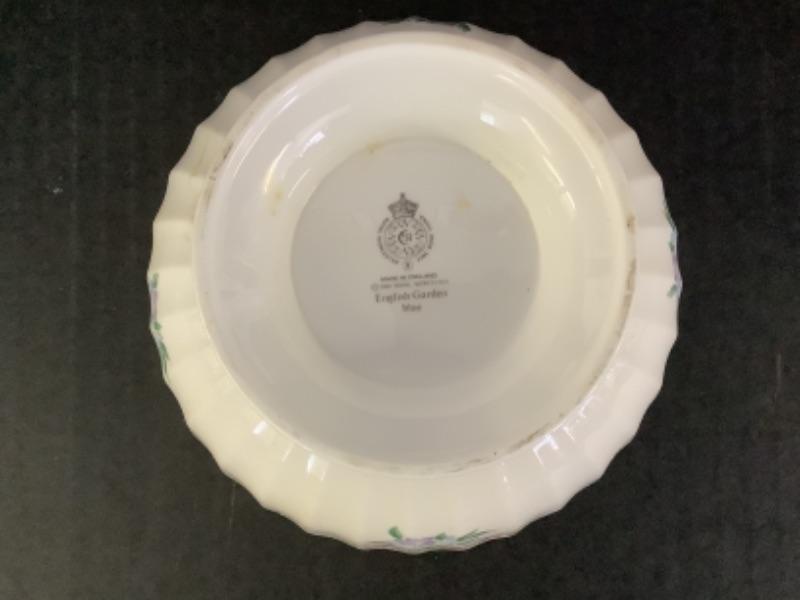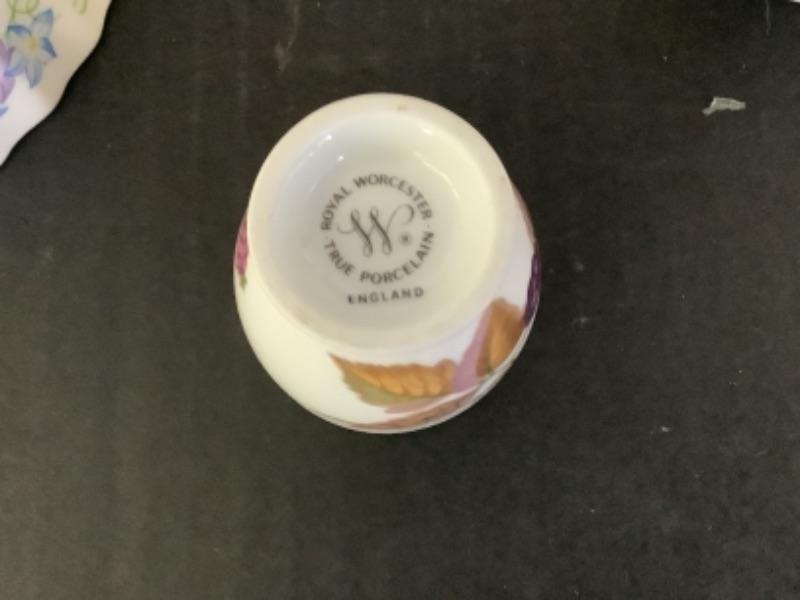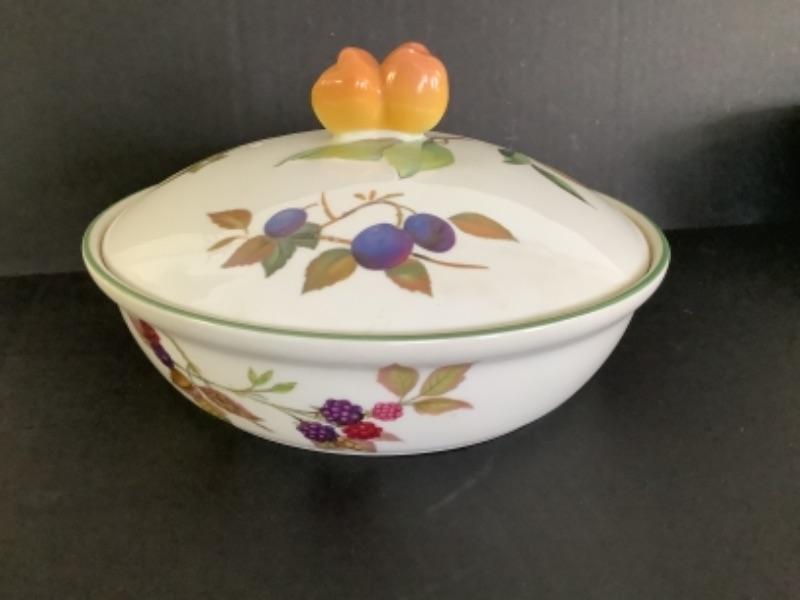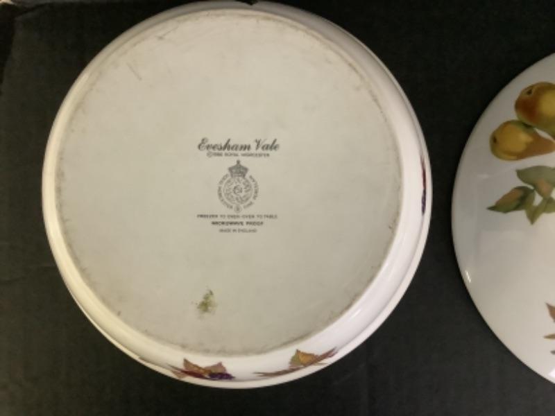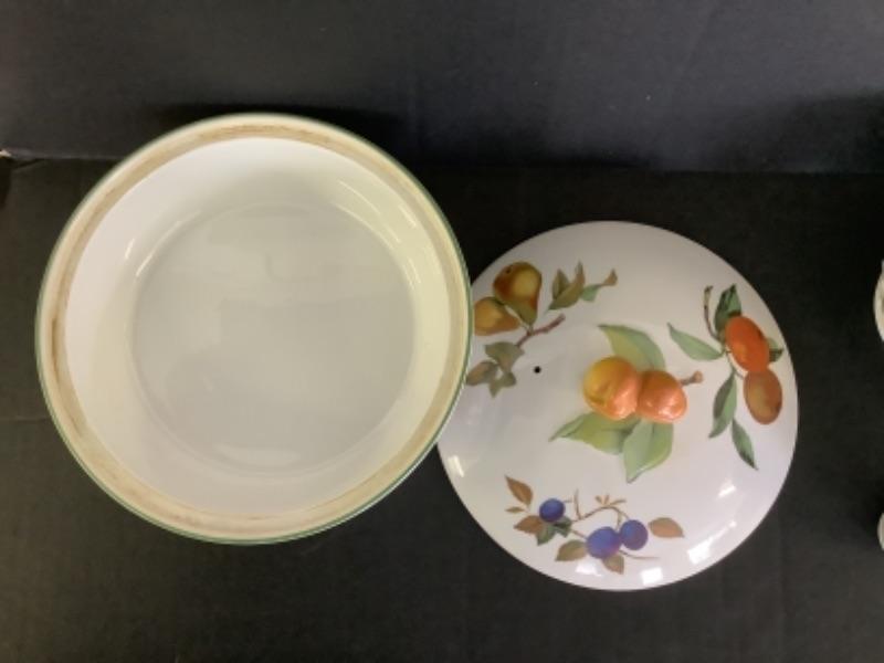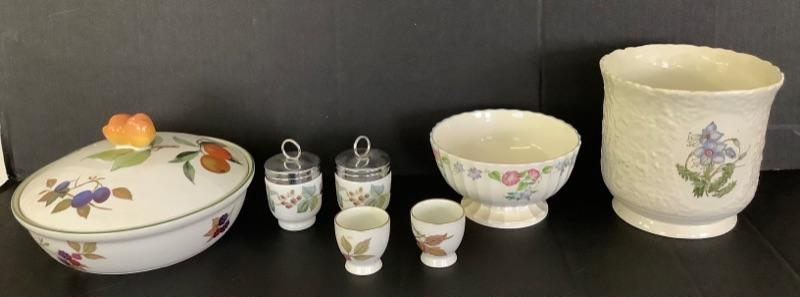 Royal Worcester Evesham Vale oven to table casserole dish with lid 8-1/2” round and 2-1/4” deep, 2 egg cups, 2 egg poaching cups, Royal Worcester English Garden bowl and Royal Cauldon Bristol Ironstone Woodstock pattern cache pot
