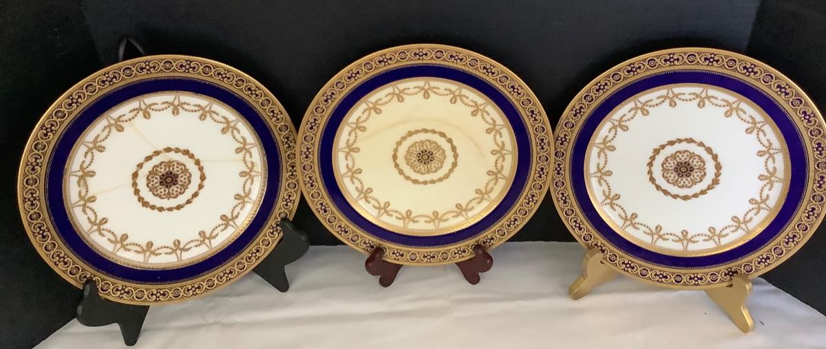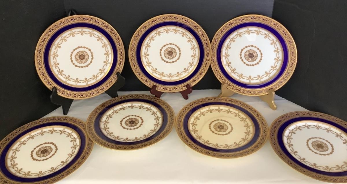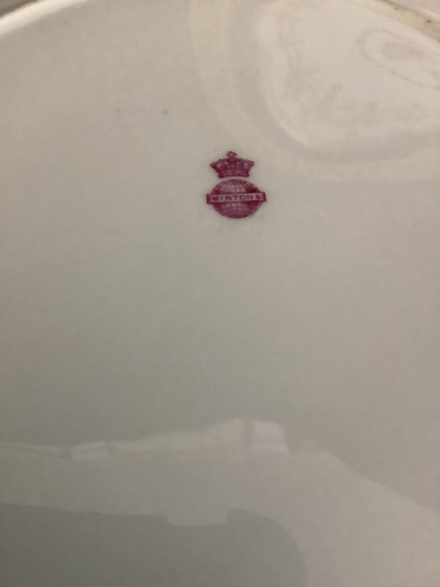 Set of 7 vintage Minton Dinner Plates measuring 10” round , plates have some minor crazing due to age, 2 plates are cracked and 1 has been repaired