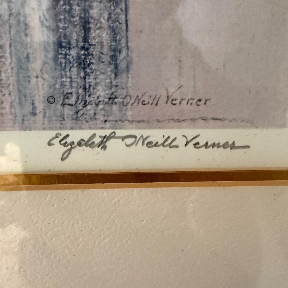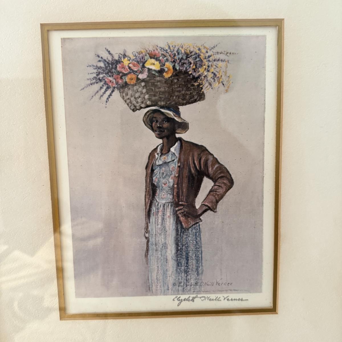 Woman with flower basket on head is by Elizabeth O’Neill verner signed in pencil bottom right
