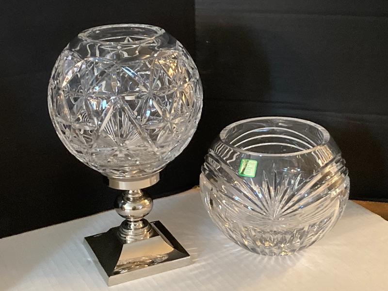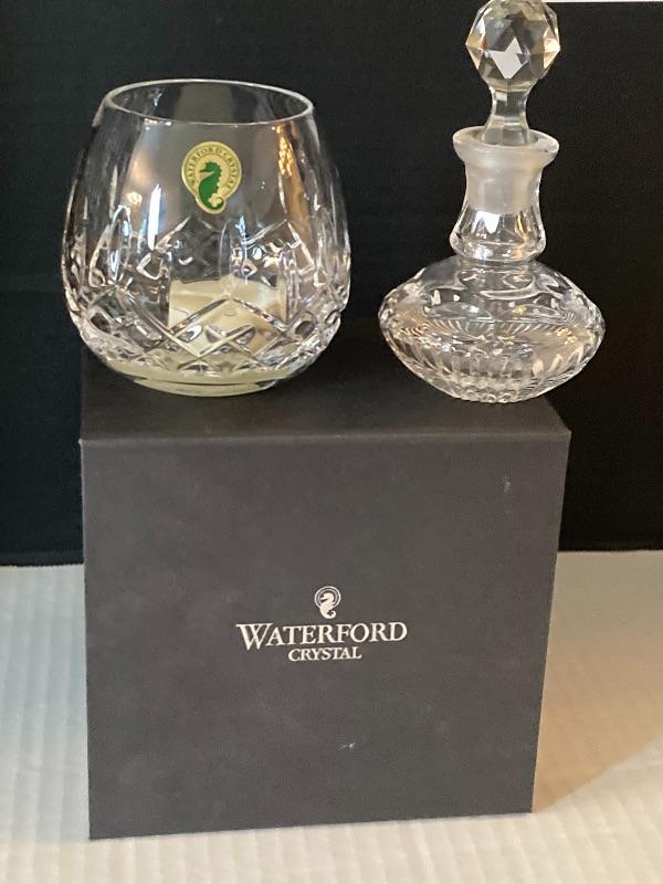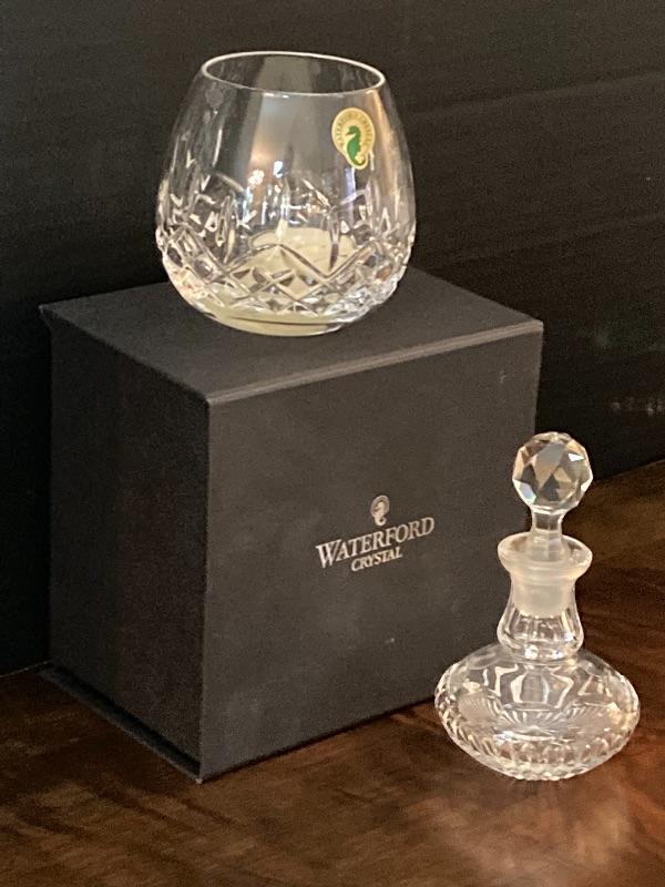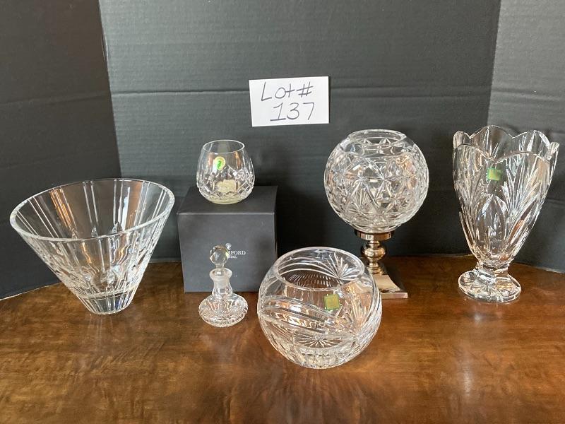 Six pieces of Waterford crystal. Lismore votive,Marquis bowl, Times Square 2000 candlestick, Marquis vase, perfume bottle with stopper and large bowl