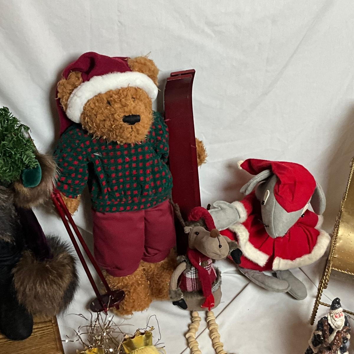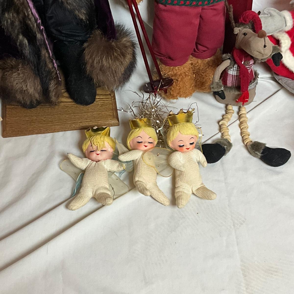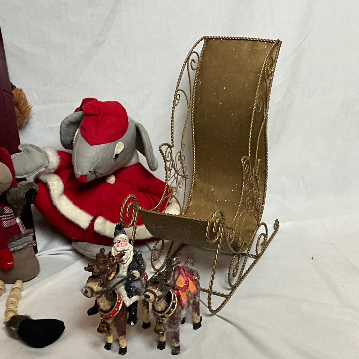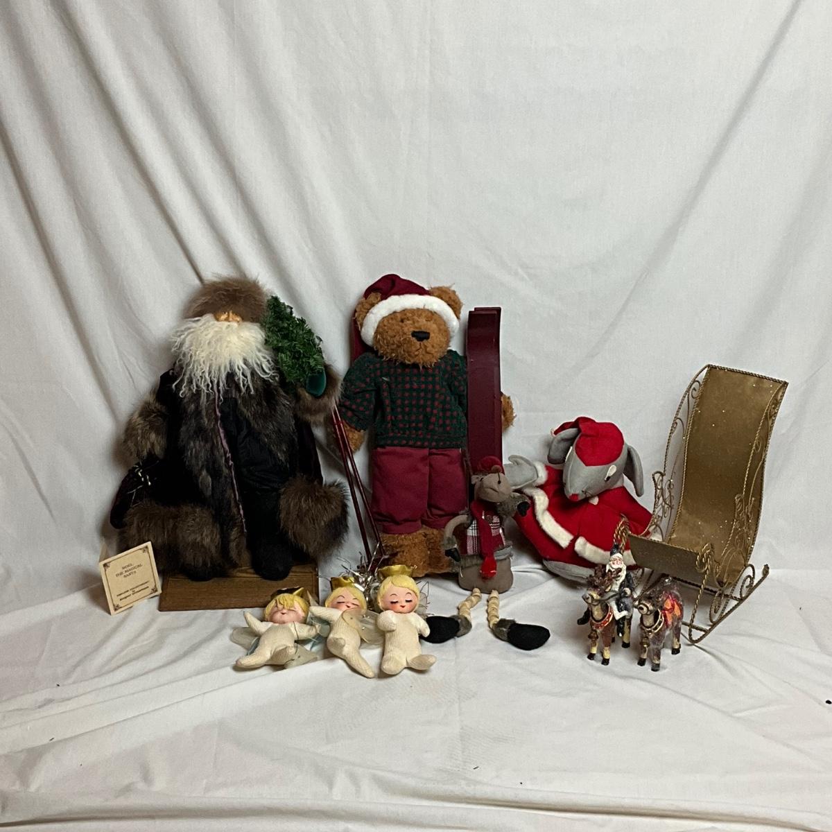 Teddy bear skier, Mouse in Santa hat, Miniature sleigh, vintage angel ornament set of three.