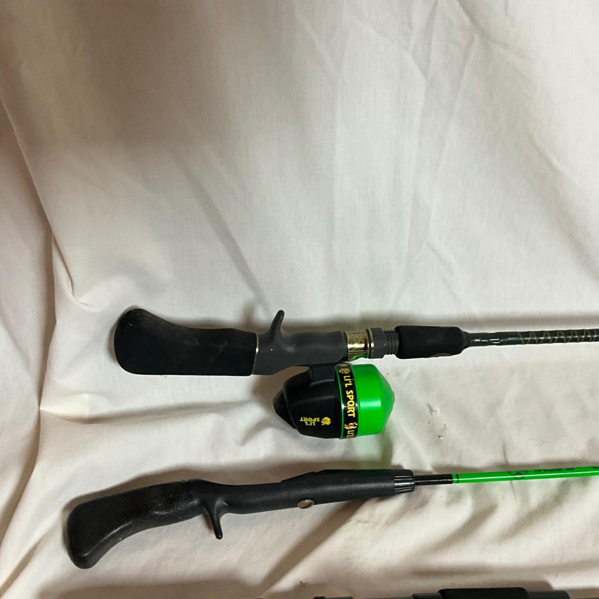 This light includes four fishing rods, three of which have reels and a tackle box.