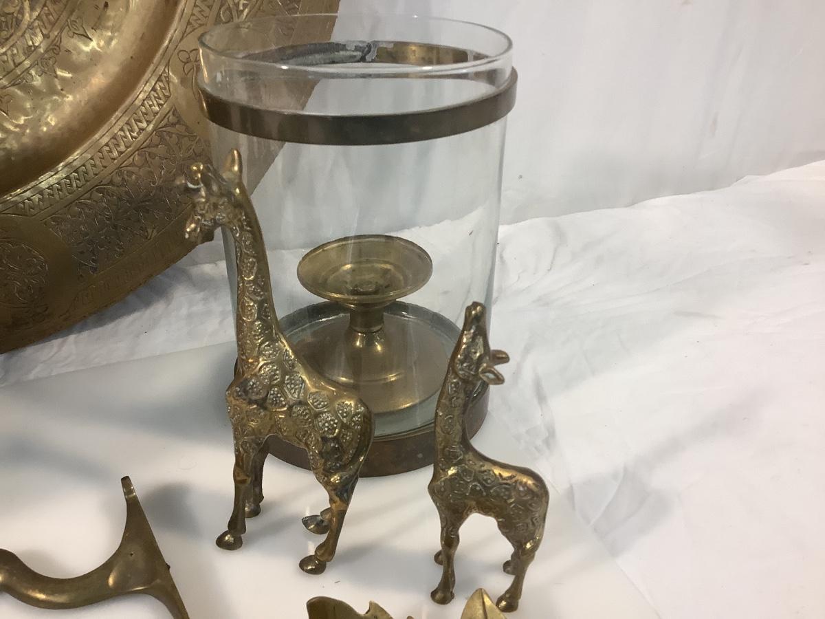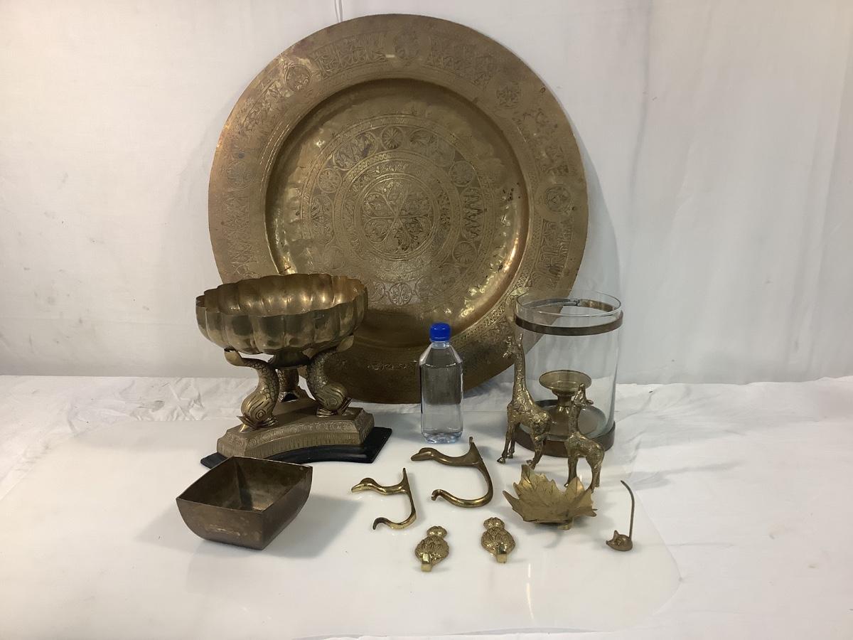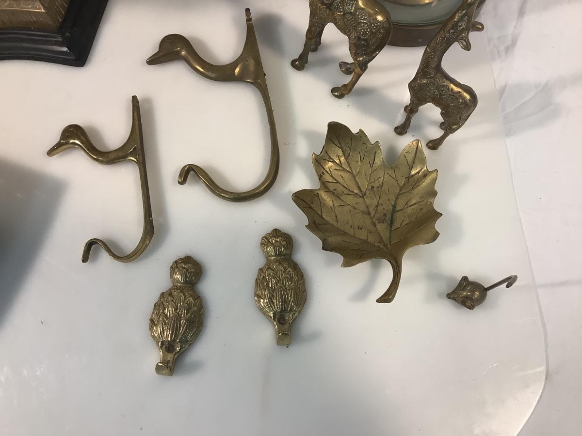 Pineapple hooks, leaf tray, 2 brass giraffe figures, brass mouse, brass square bowl, two duc wall hooks, decor candle stick