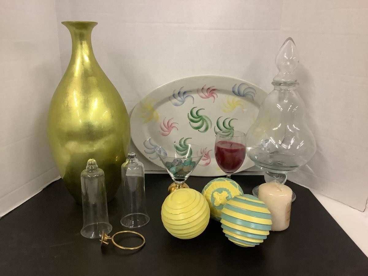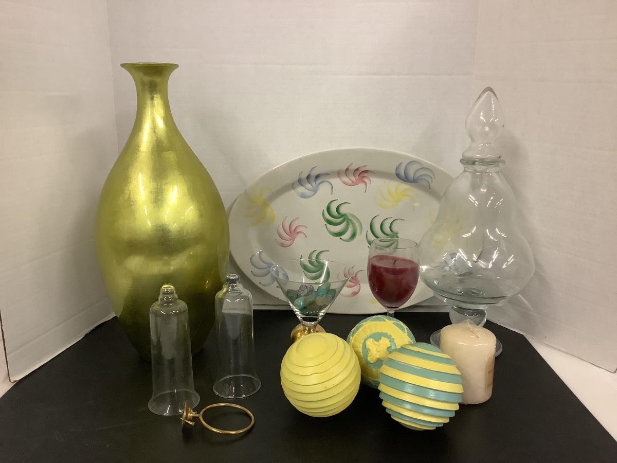 Yellow green bottle vase , oval platter, clear glass jar, glass wall pocket, wine glass candle yellow and green decorative wooden balls , candle