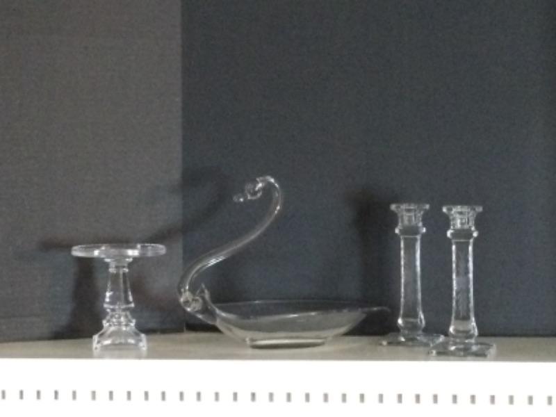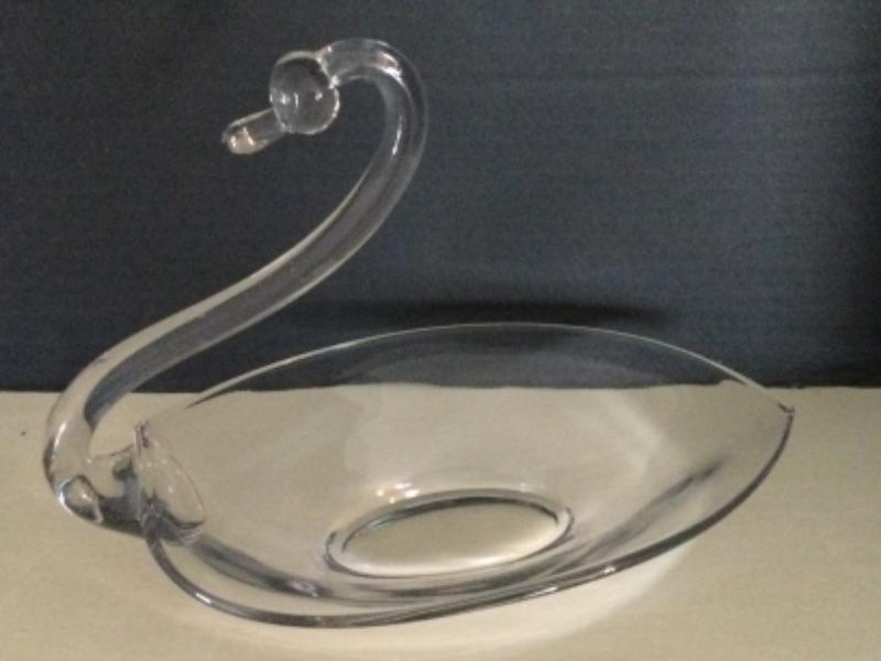 Vintage glass swan bowl, pair of etched glass candlesticks and a glass Longaberger Pillar candle stand