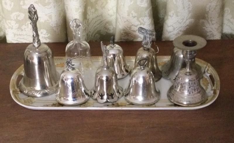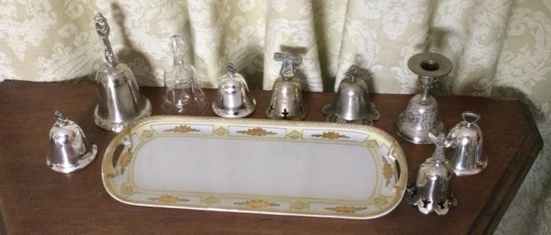 A-204 Hand Painted Nippon Tray Eight Silver Plate Bells One Seneca Glass Bell