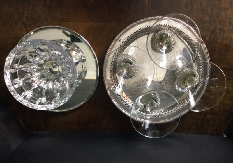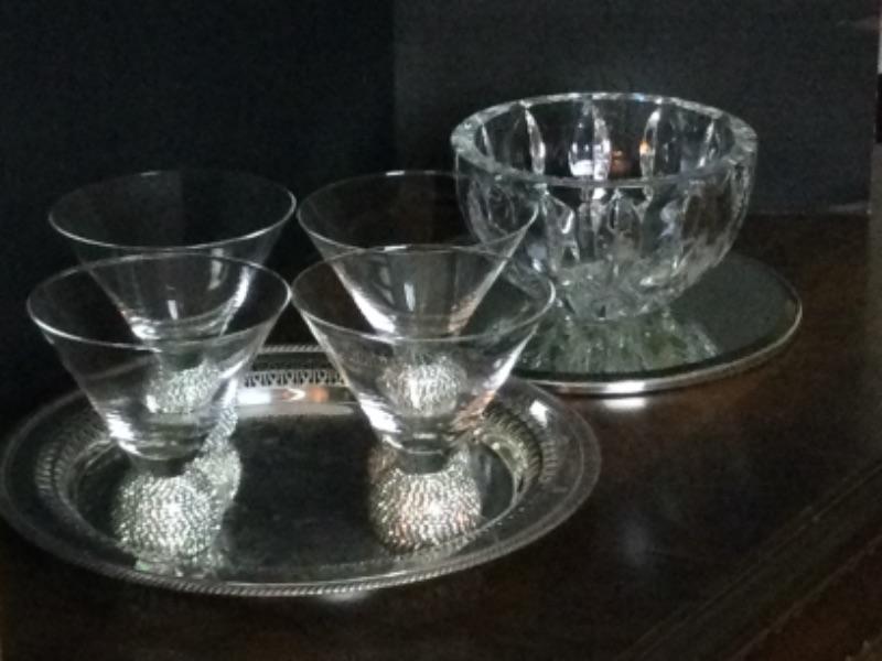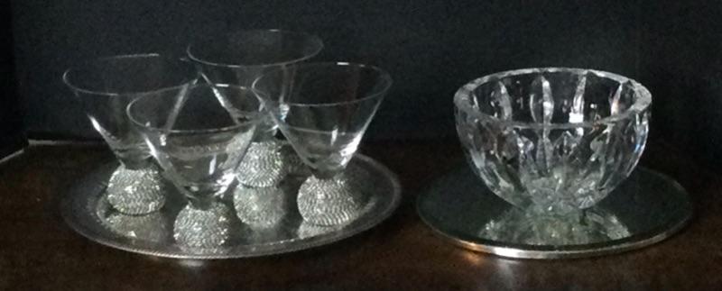 Reed & Barton crystal bowl, set of four jeweled cocktail/dessert glasses and two silver plate trays