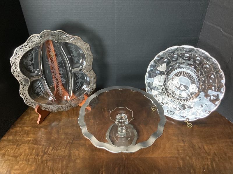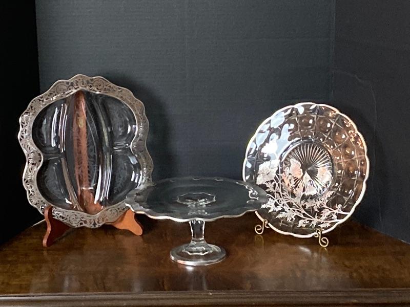 Glass cake stand and two glass serving plates with sterling silver overlay