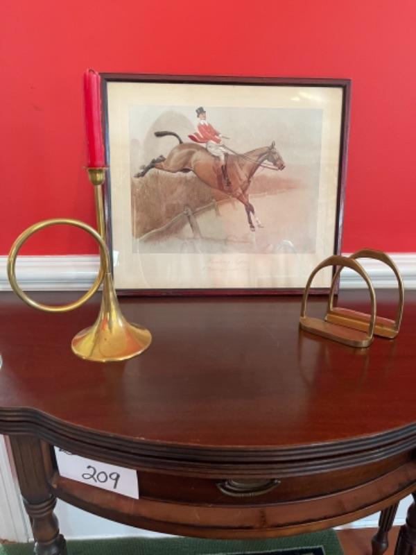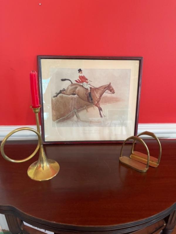 Measures 18.5” wide x 16.5” tall with brass hunting horn candlestick and stirrup brass bookends