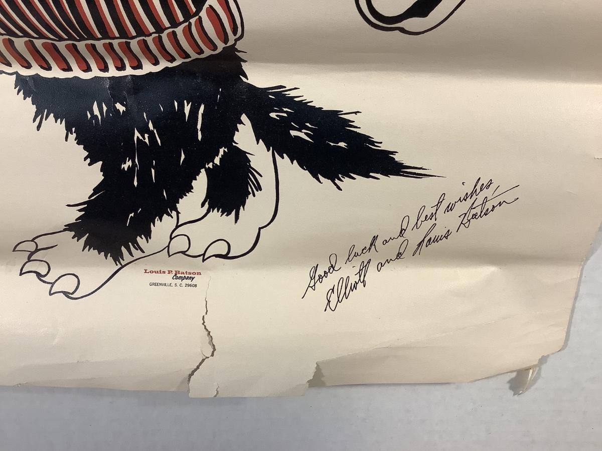Signed poster, soup of the day figure, patches, stool 14" round x 10" high