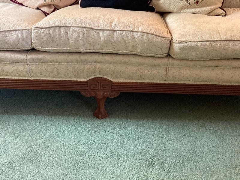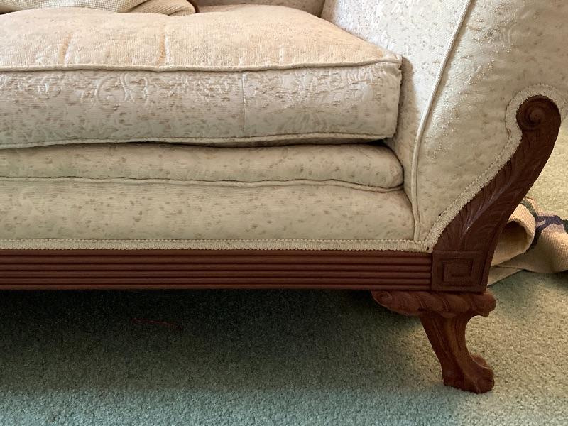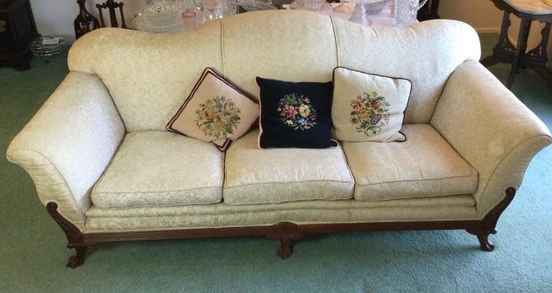 A-216 Antique Camelback Sofa with Three Needlepoint Throw Pillows