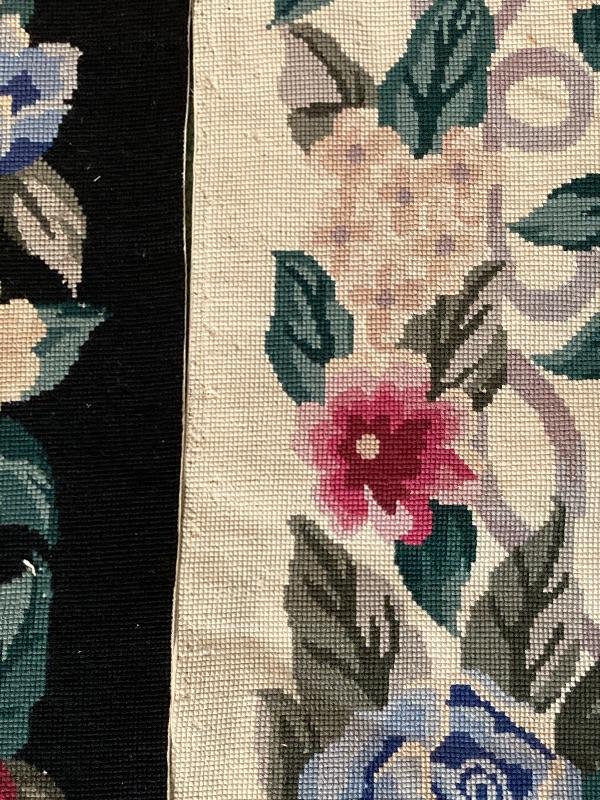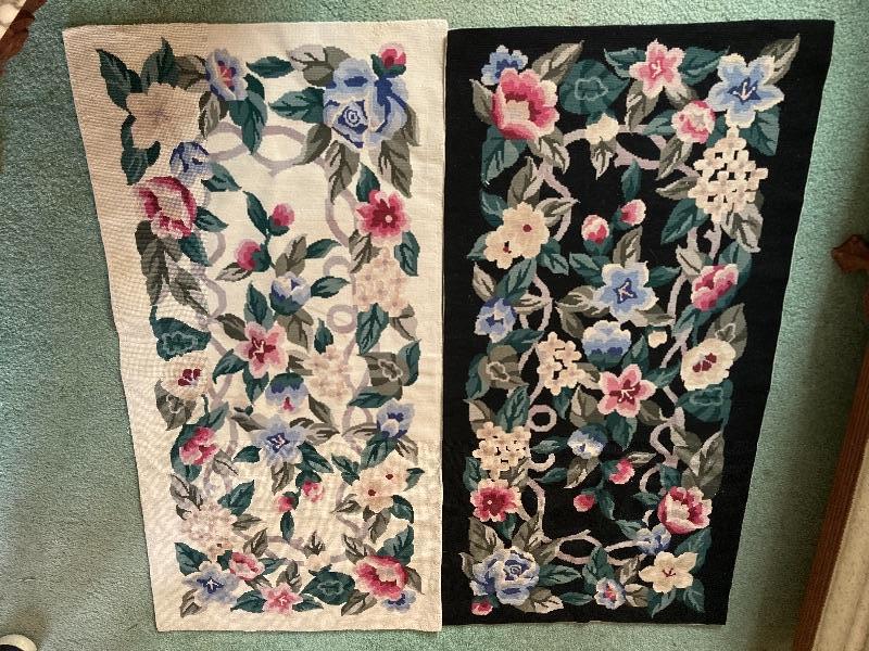 Pair of needlepoint rugs measuring 48” long and 24” wide. White rug has some damage along edge (see photos)
