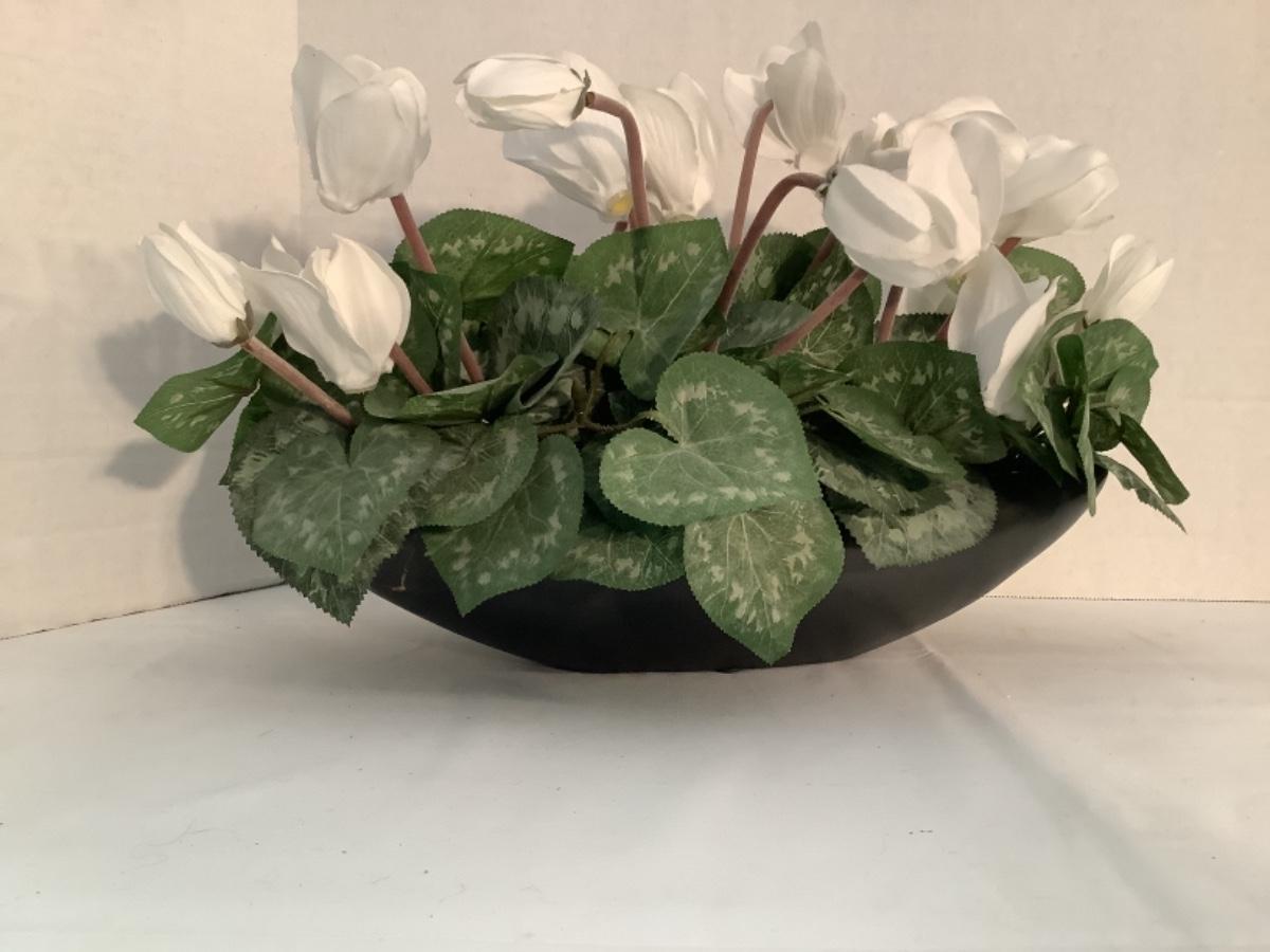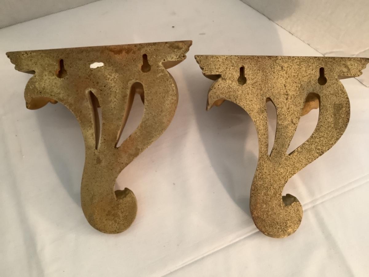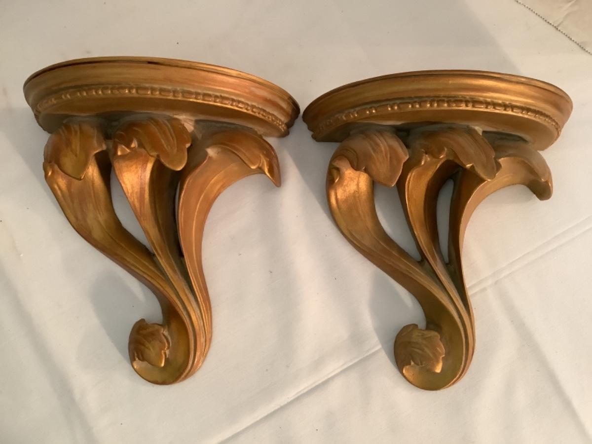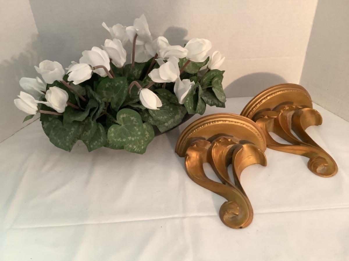Pair of gold painted wood wall shelves 7-1/2” wide 8” tall, Faux flower arrangement in black pottery vase 15” long