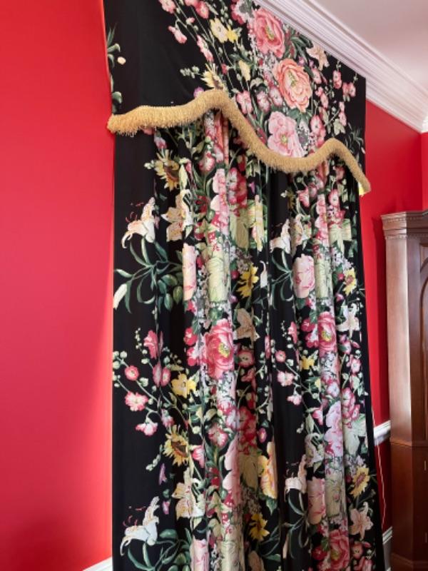 Pair of Floral and Black Lined Drapery Panels with Valance