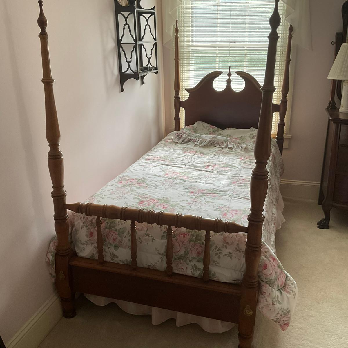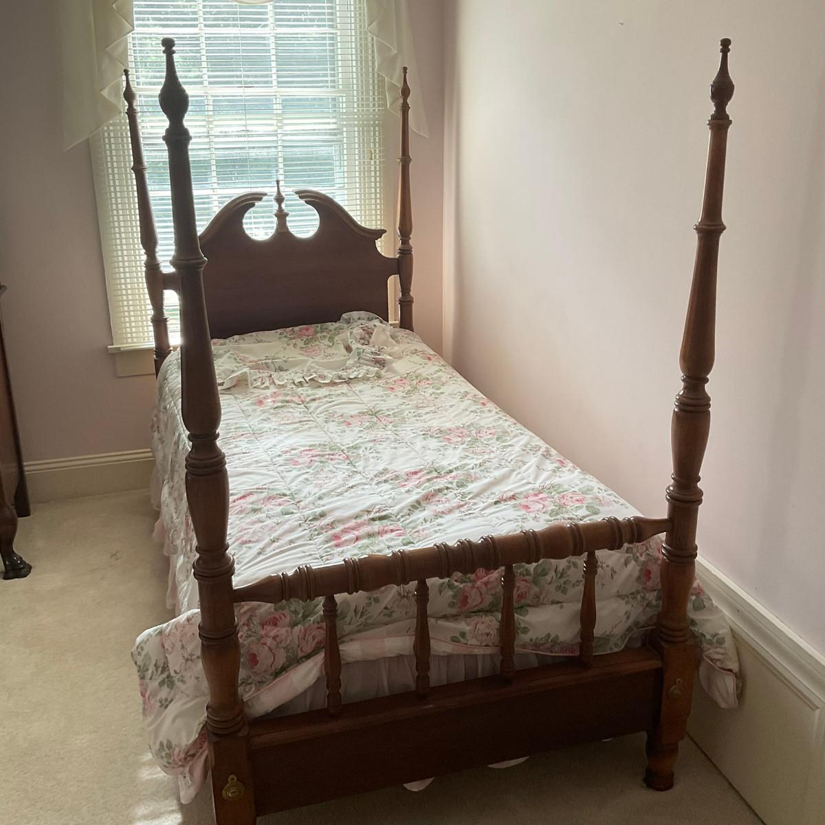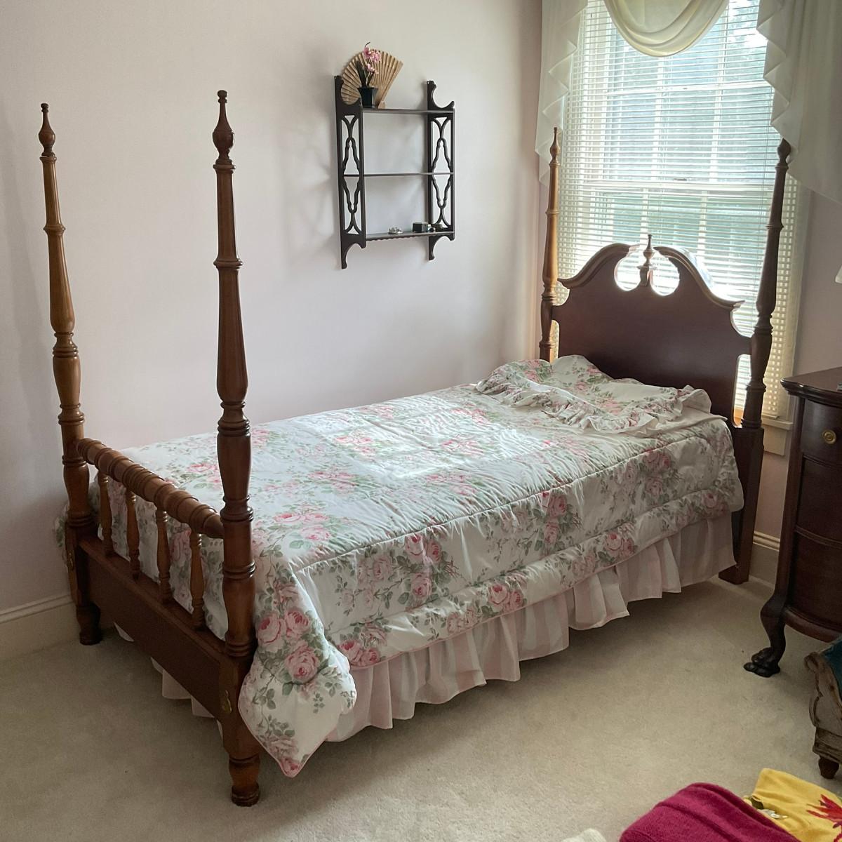 A227 Pair of Twin Colonial Yew Wood Post Beds with Laura Ashley Bedding