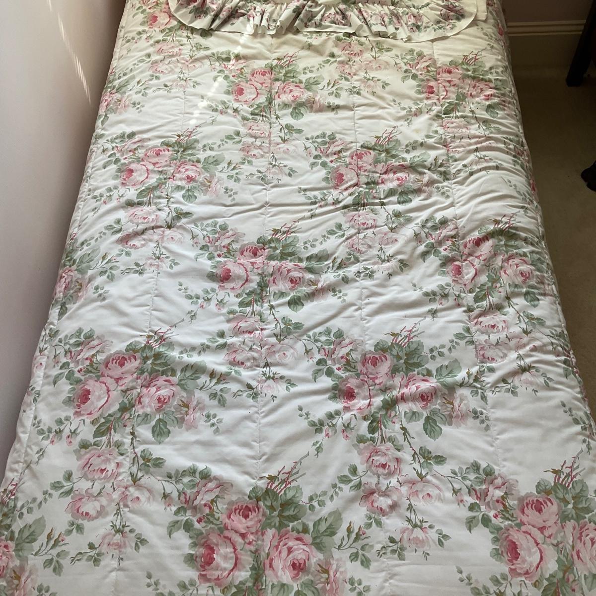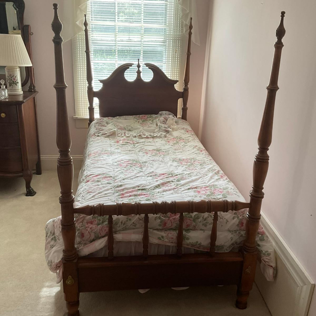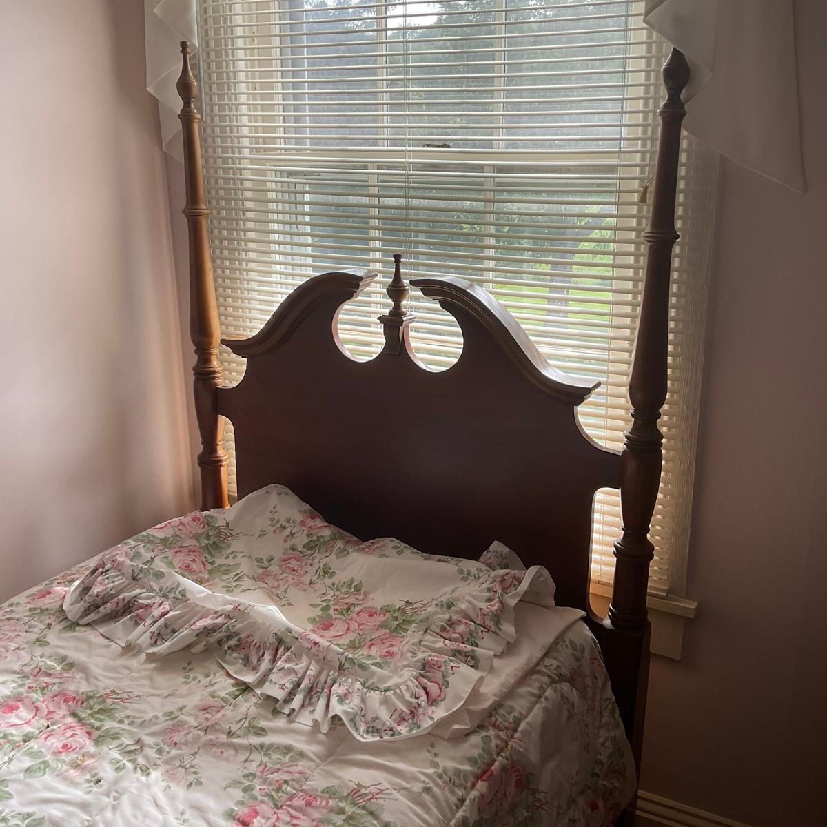 A227 Pair of Twin Colonial Yew Wood Post Beds with Laura Ashley Bedding