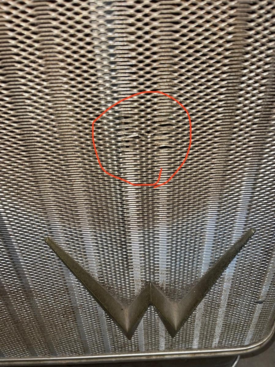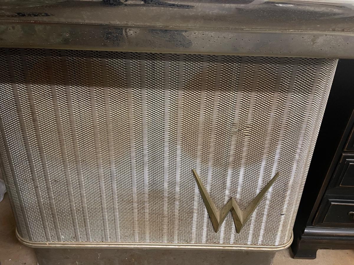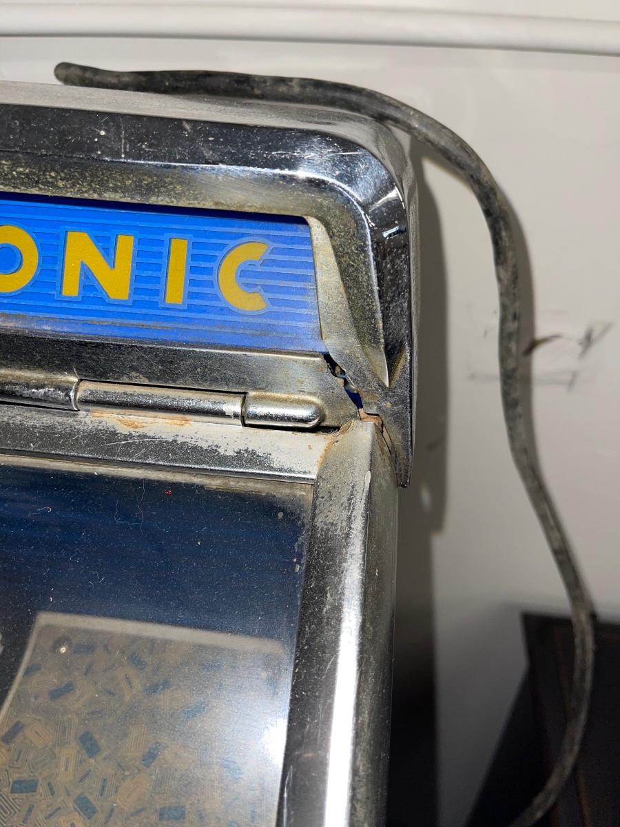 After further examination, we noticed there is a crack in the upper left and right corner frame only portion, a slight dent in the from wire mesh speaker cover area and missing plastic cover part front left. The unit powers on and plays records. The playing needle arms does not come forward all the way down to press the needle against the record, you have to manually push against the record to make contact. Based on preliminary inspection the unit will need to be gone through, cleaned/adjusted, etc“🦆? Please see pics.