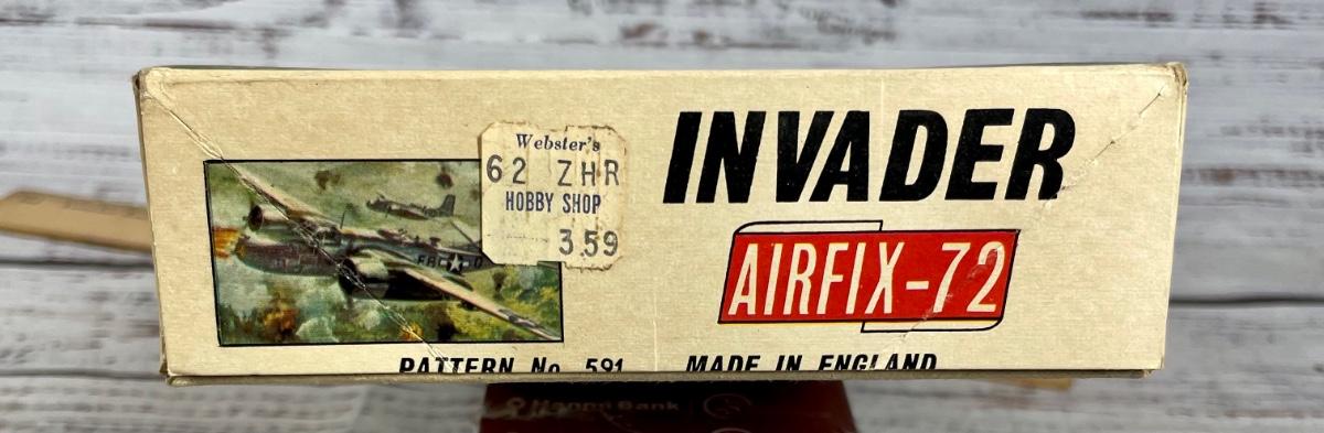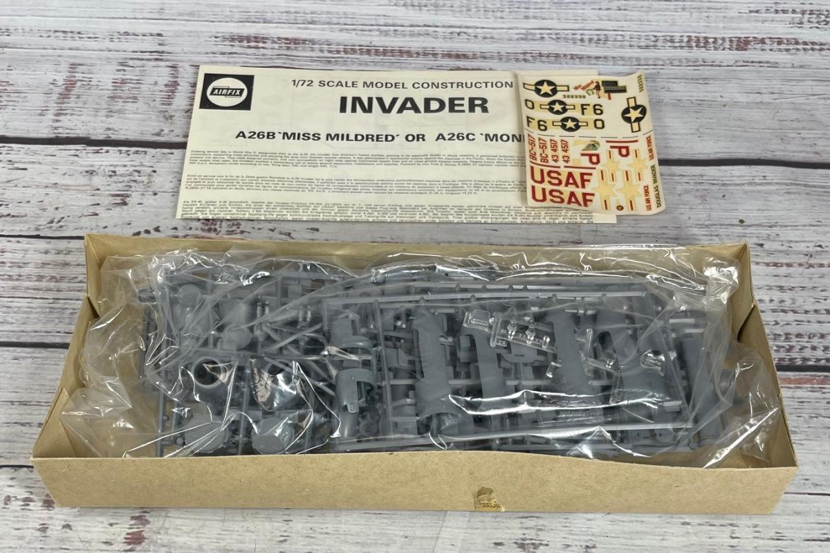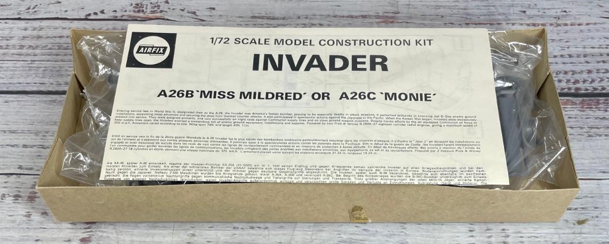 Airfix A-26 Invader 1/72 plastic model kit. Opened box, but unbuilt. All parts in plastic bag. Includes instruction sheet and decals. Box is in very good condition.