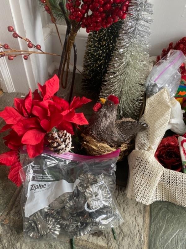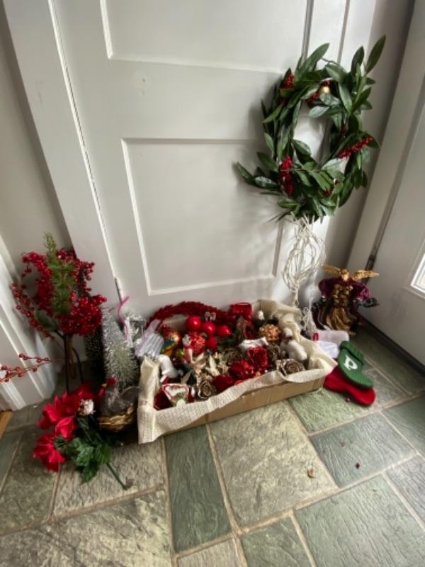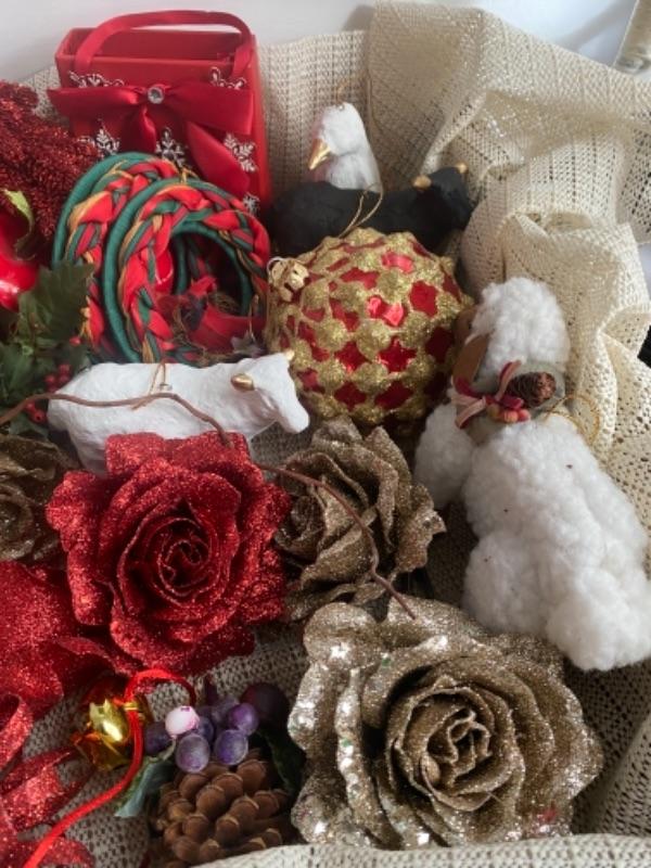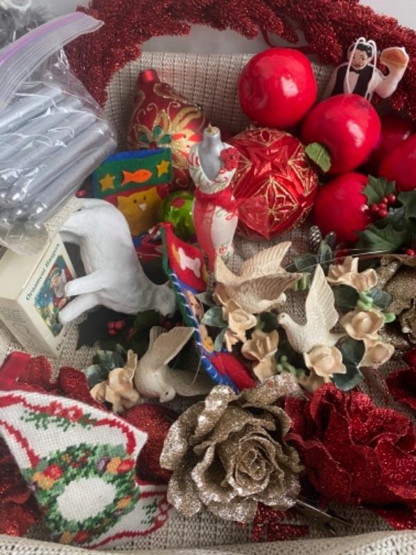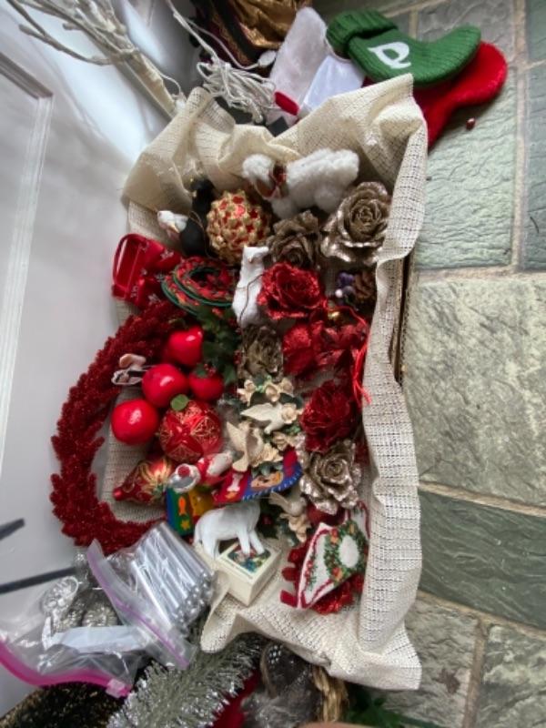 Misc. Christmas Lot , paper, boxes, ornaments, candle with stand , reindeer, lights, ribbon tissue, linen SIERRA napkins
