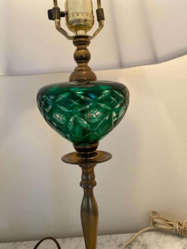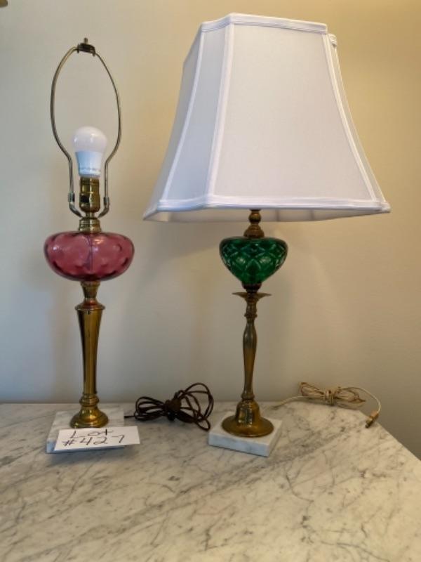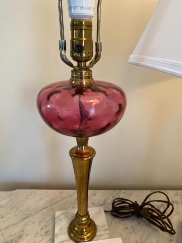 Vintage cranberry glass and brass lamp with marble base, with vintage green Glass and Brass with marble base lamp comes with shade